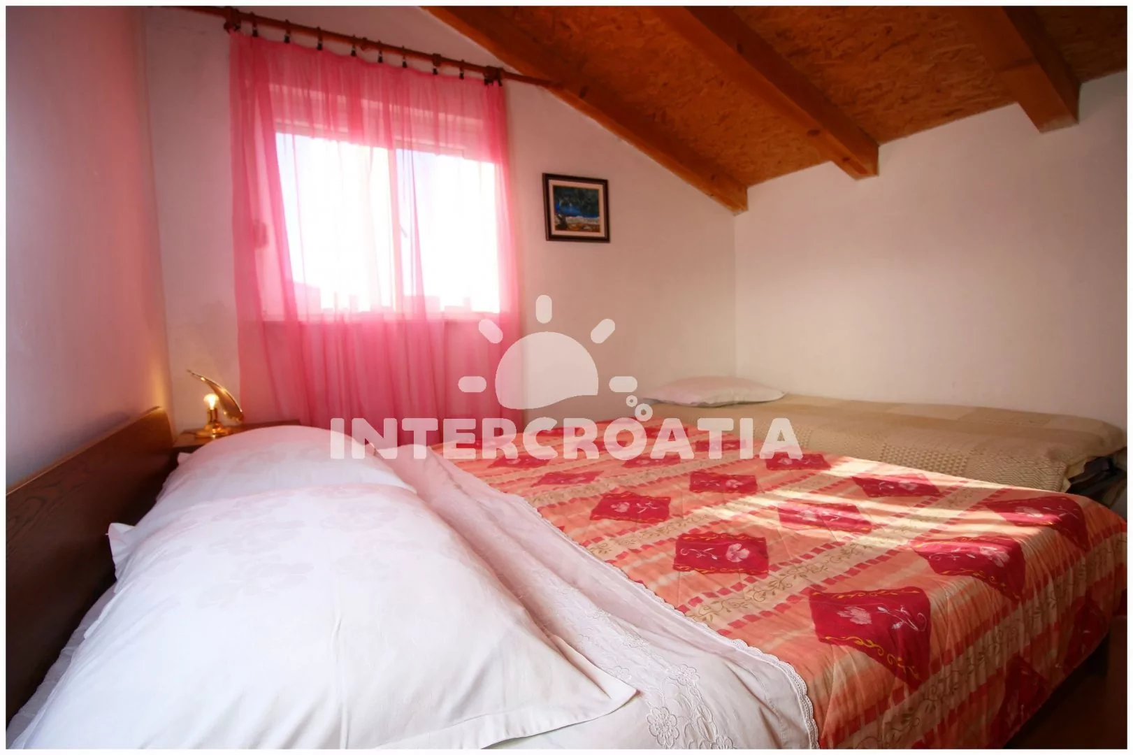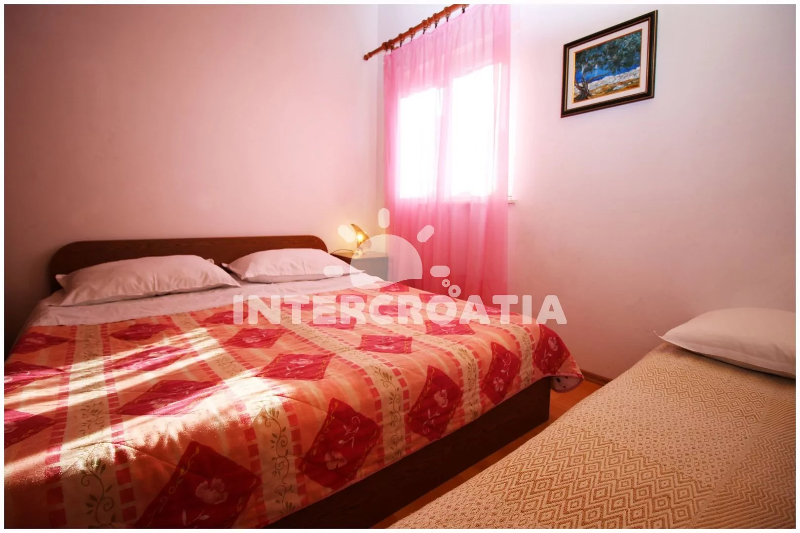 Apartmán (28 m2) s balkonem a venkovním posezením se nachází ve 2. patře domu. Apartmán má 1 ložnici a je vhodný pro 2 až 3 osoby. Obývací místnost je spojena s kuchyní. Kuchyňská linka je vybavena sporákem s troubou, rychlovarnou konvicí, kávovarem, nádobím a lednicí s mrazákem. Obývací místnost s jídelním stolem, televizí se satelitním programem, rádiem, klimatizací a vstupem na balkon. Ložnice s dvoulůžkem a jedním jednolůžkem. Koupelna se sprchovým koutem, umyvadlem a wc. Hostům je k dispozici parkování u objektu zdarma.