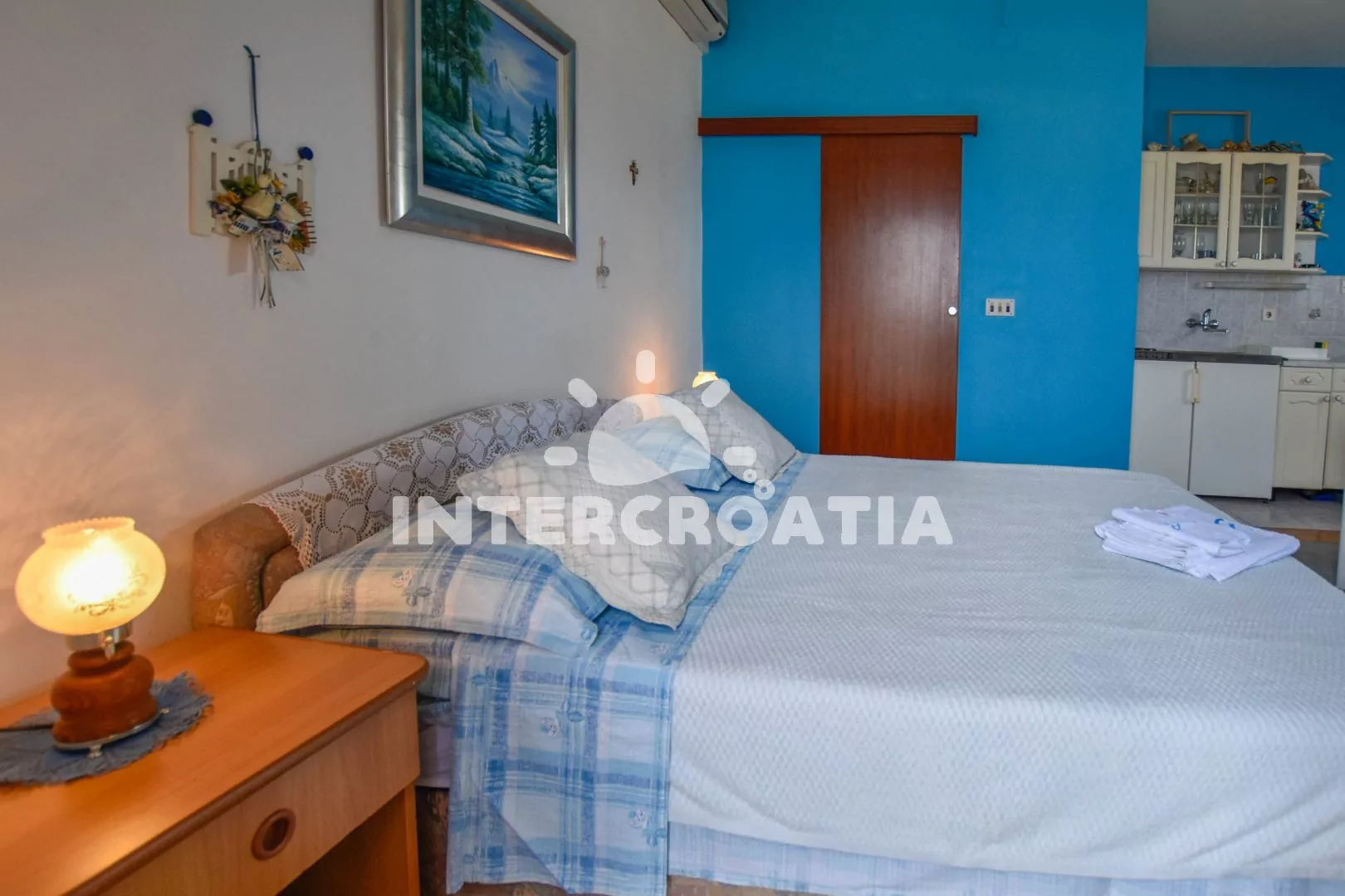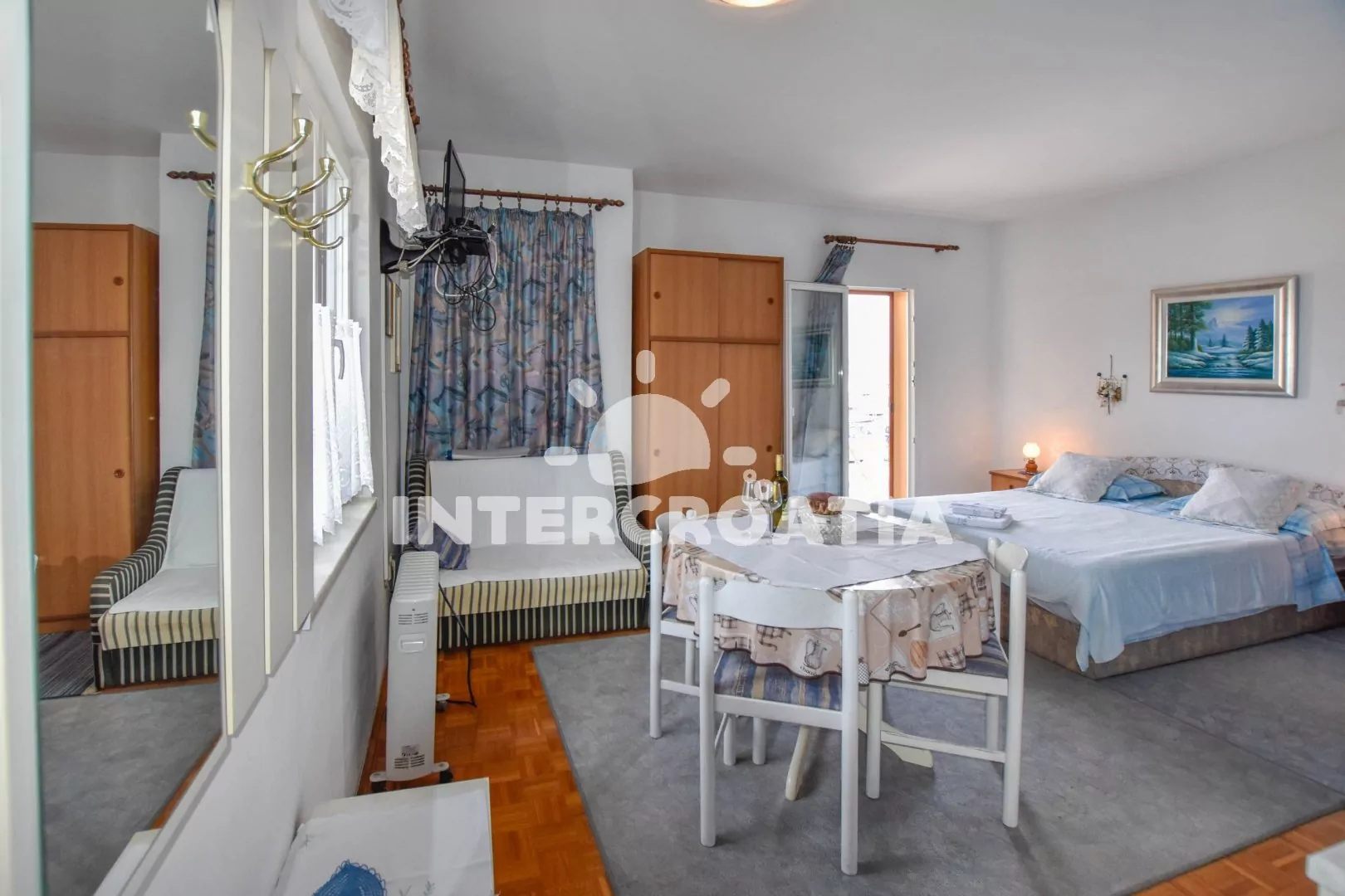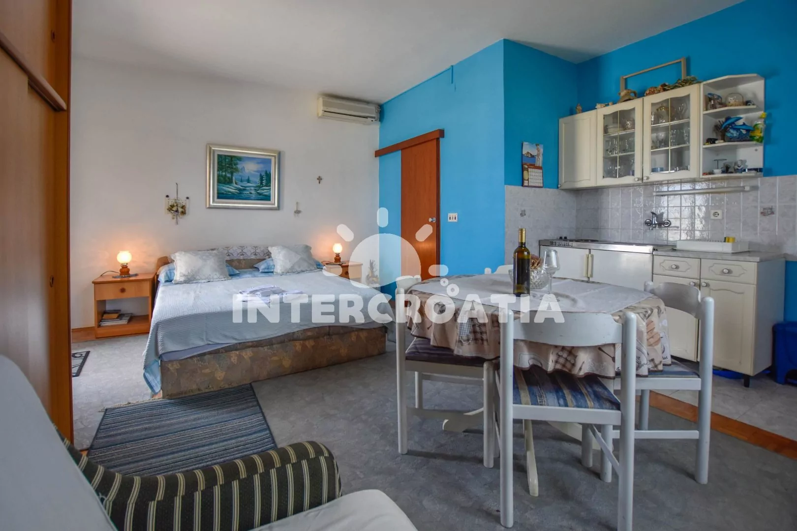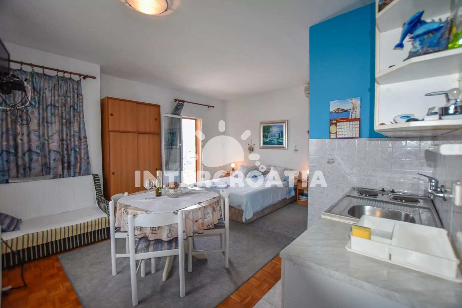 Příjemný, útulně zařízený apartmán s terasou, posezením a výhledem na moře, nacházející se v 1. patře domu. Vstup, obývací místnost spojená s kuchyňským koutem. Kuchyňská linka s dvouplotýnkovou varnou deskou, lednicí s mrazákem, kávovarem a nádobím. V obývací místnosti jídelní stůl pro 4 osoby, pohovka (rozložitelná na extra lůžko pro 1 osobu), dvoulůžko, televize se satelitem, klimatizace a vstup na balkon. Koupelna se sprchovým koutem, umyvadlem a wc. Hosté mají k dispozici parkování u objektu zdarma.