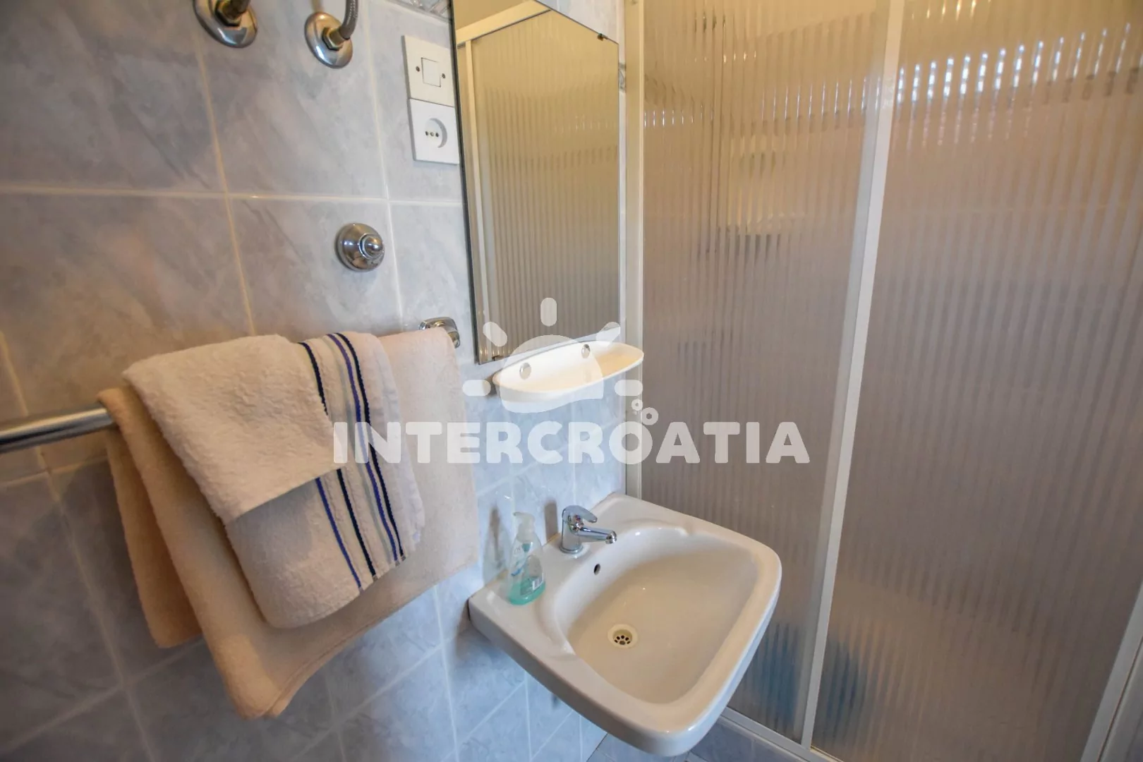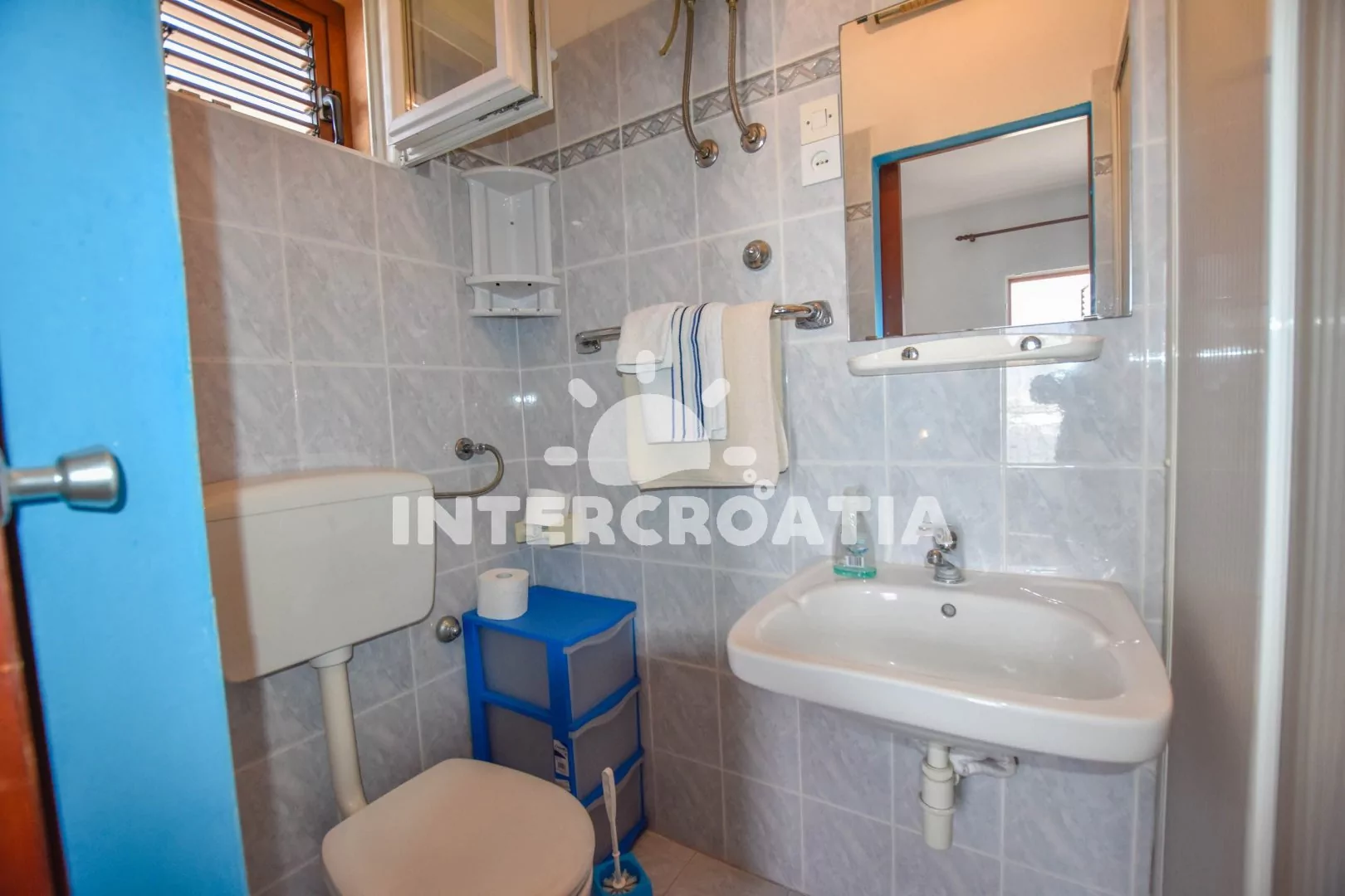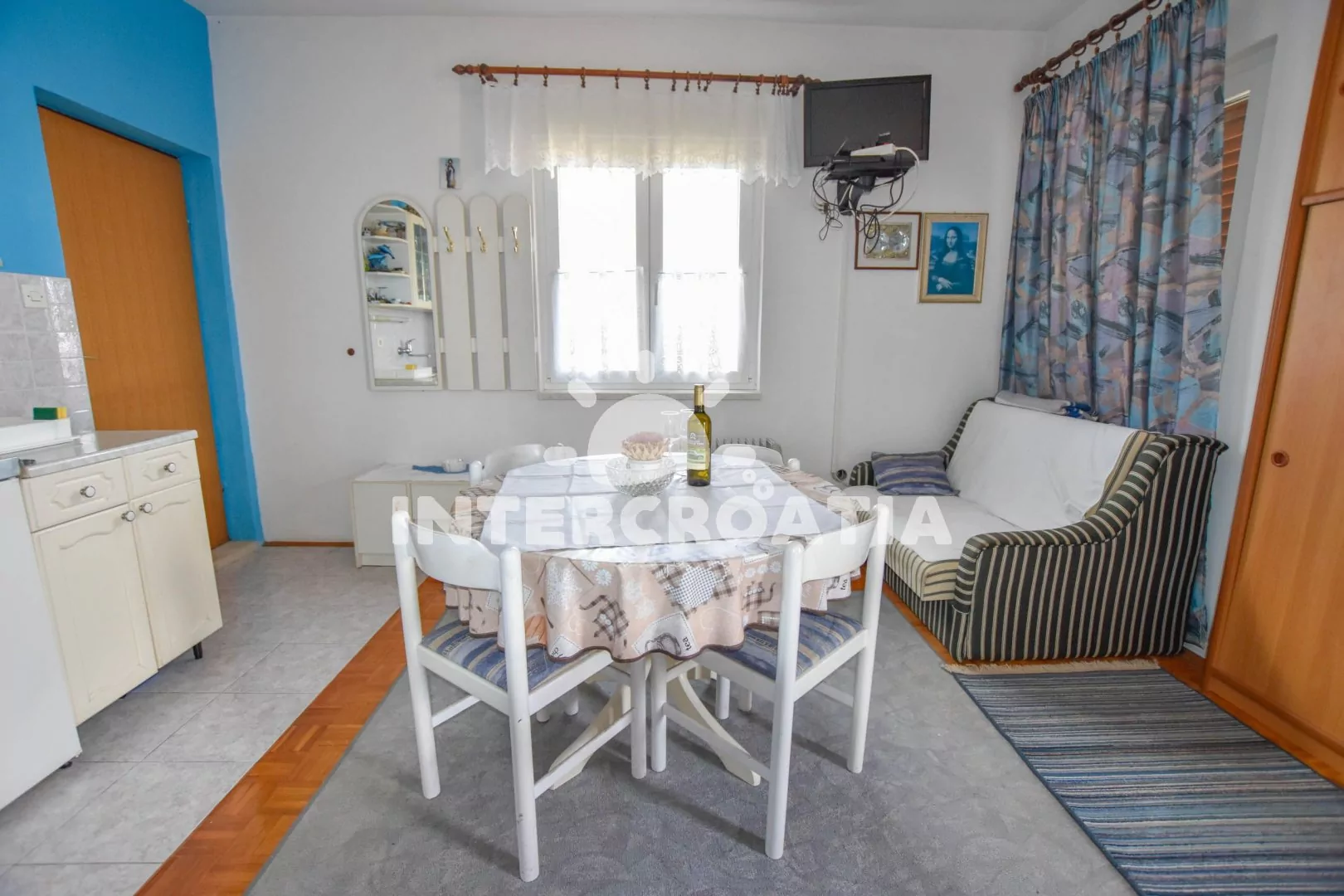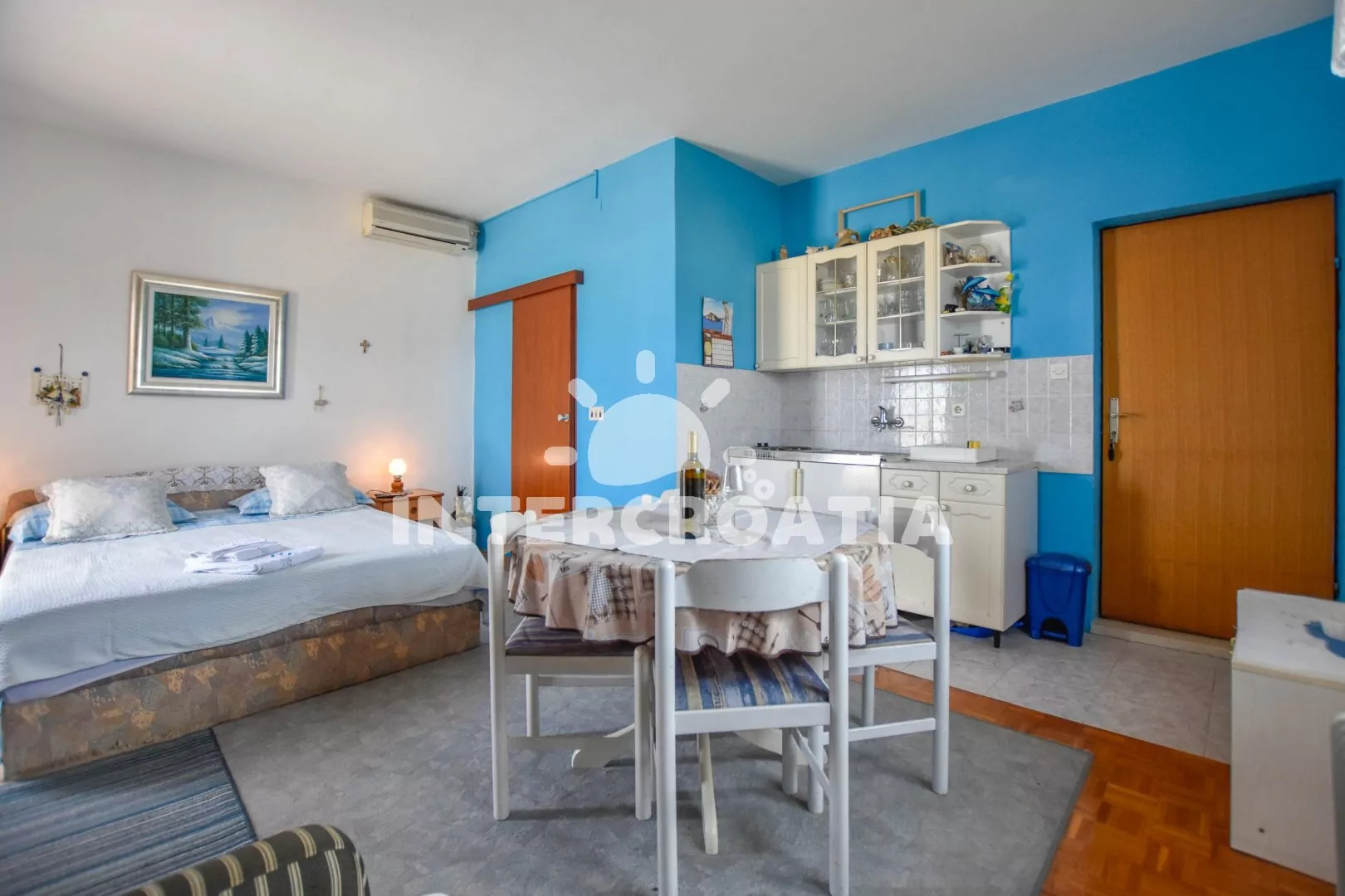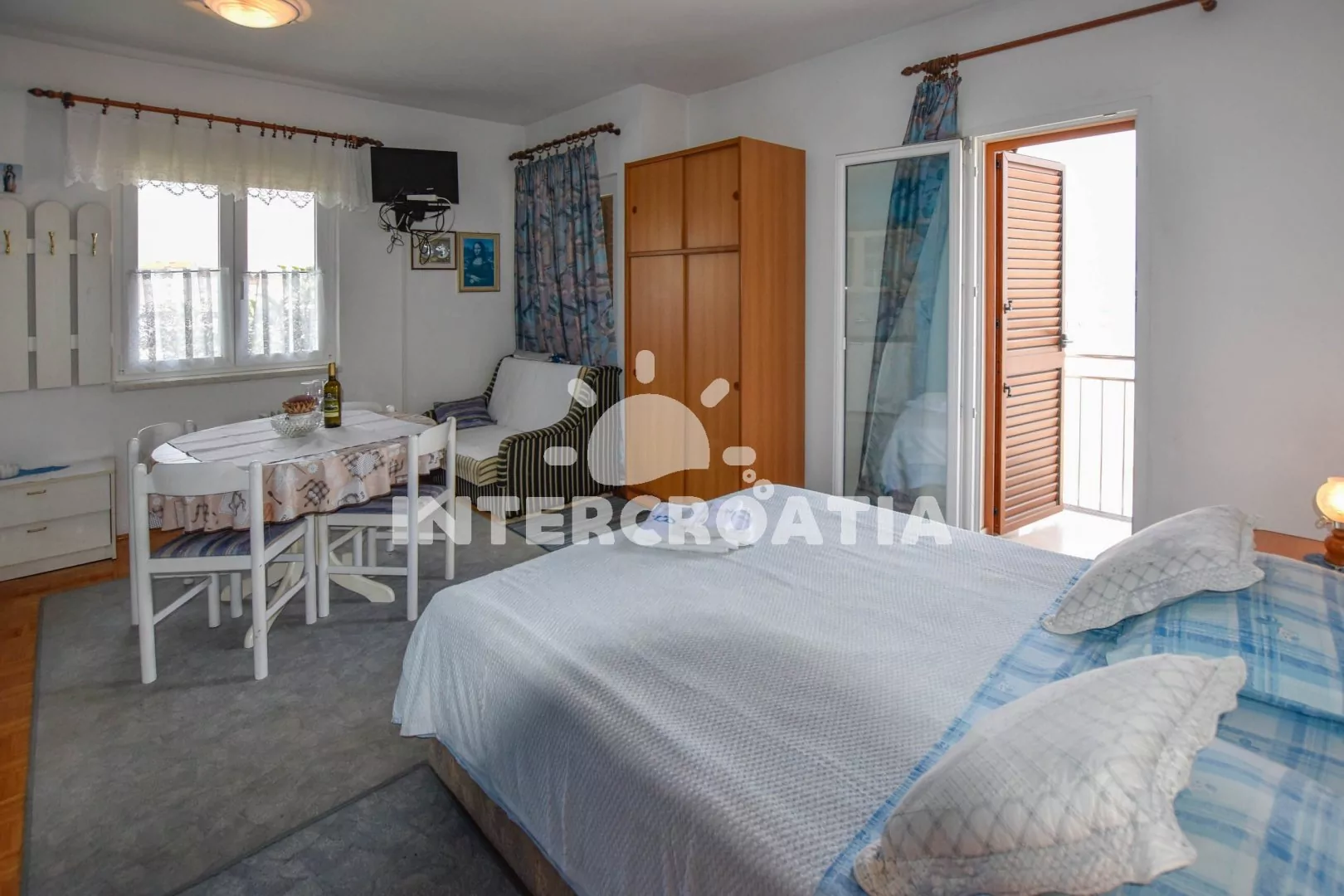 Příjemný, útulně zařízený apartmán s terasou, posezením a výhledem na moře, nacházející se v 1. patře domu. Vstup, obývací místnost spojená s kuchyňským koutem. Kuchyňská linka s dvouplotýnkovou varnou deskou, lednicí s mrazákem, kávovarem a nádobím. V obývací místnosti jídelní stůl pro 4 osoby, pohovka (rozložitelná na extra lůžko pro 1 osobu), dvoulůžko, televize se satelitem, klimatizace a vstup na balkon. Koupelna se sprchovým koutem, umyvadlem a wc. Hosté mají k dispozici parkování u objektu zdarma.