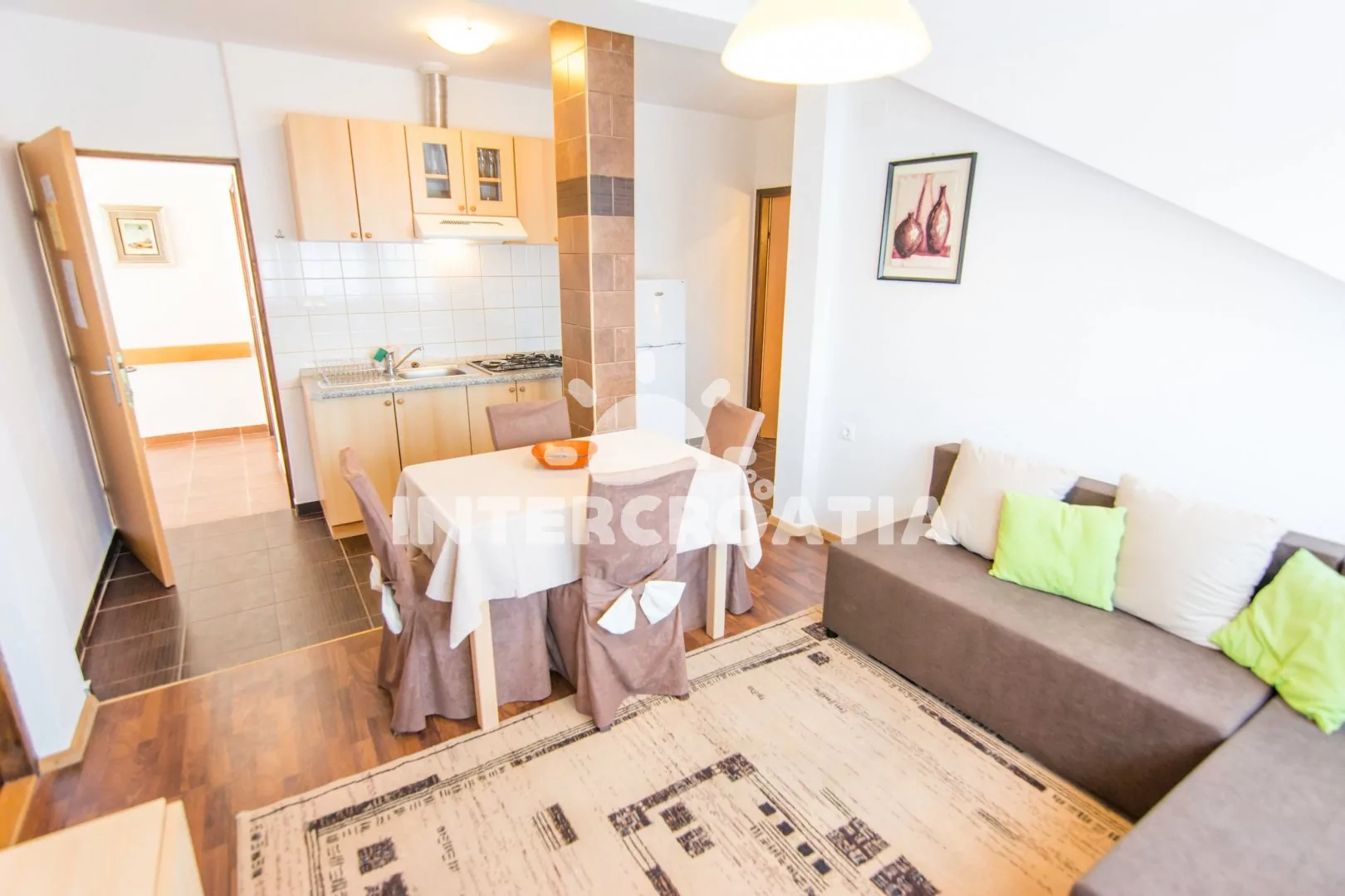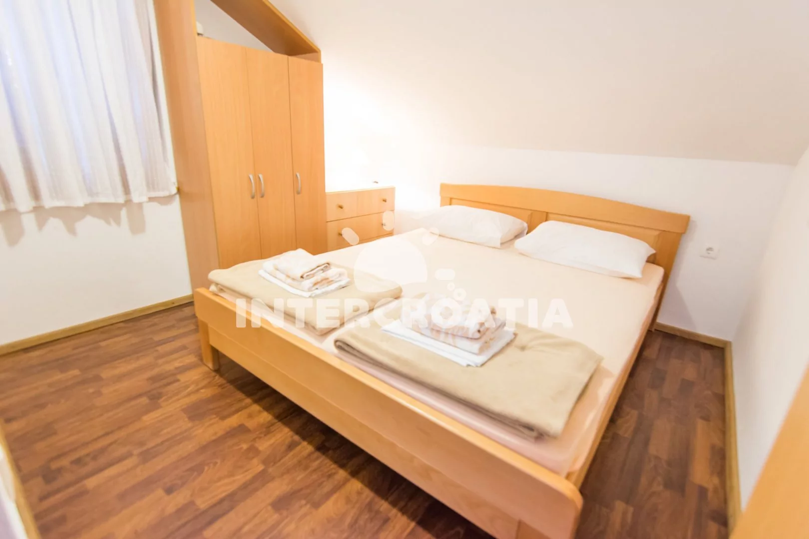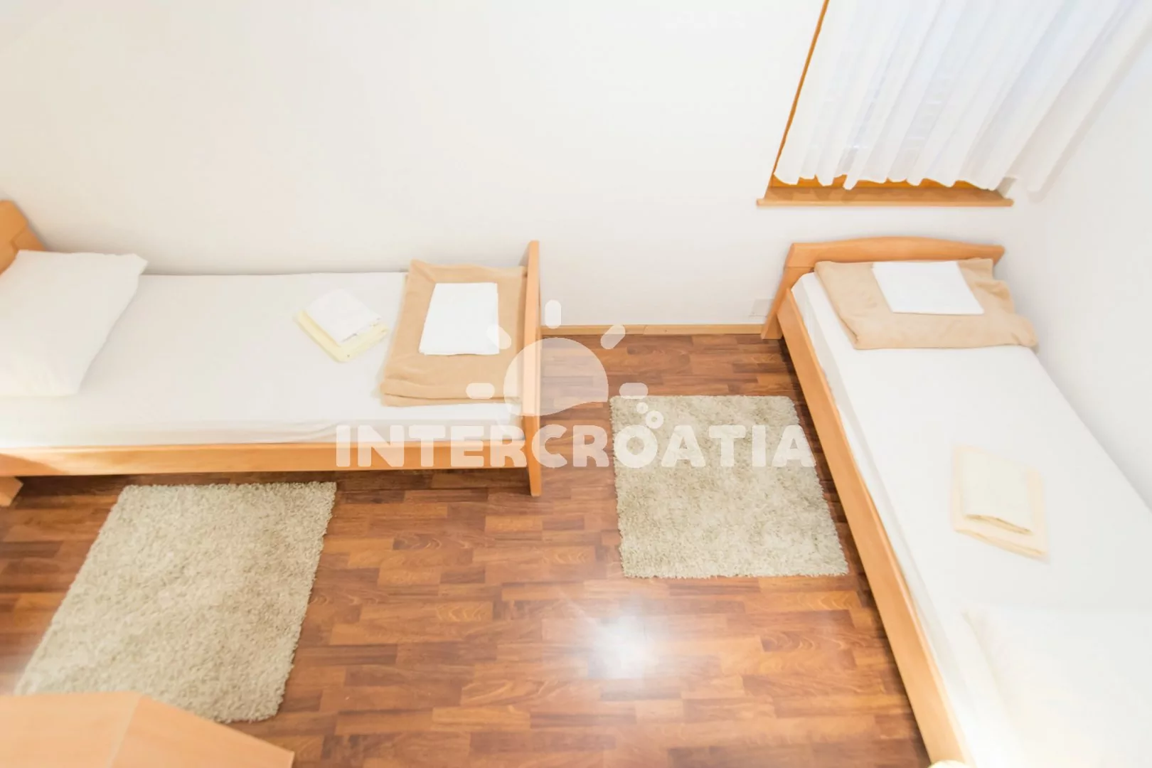 Apartmán pro 4 osoby s výhledem do klidné ulice se nachází v druhém patře domu. Obývací pokoj je spojený s kuchyní. Kuchyňská linka je vybavena varnou deskou, digestoří, nádobím a lednicí s mrazákem. Obývací pokoj s jídelním stolem pro 4 osoby, pohovkou, televizí se satelitním programem a klimatizací. První ložnice s dvoulůžkem. Druhá ložnice s dvěma jednolůžky. Koupelna se sprchovým koutem, umyvadlem a wc. Hostům je k dispozici parkování u objektu zdarma.