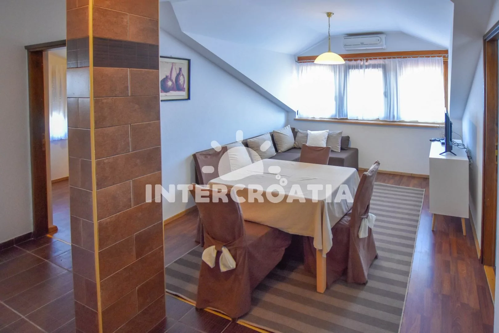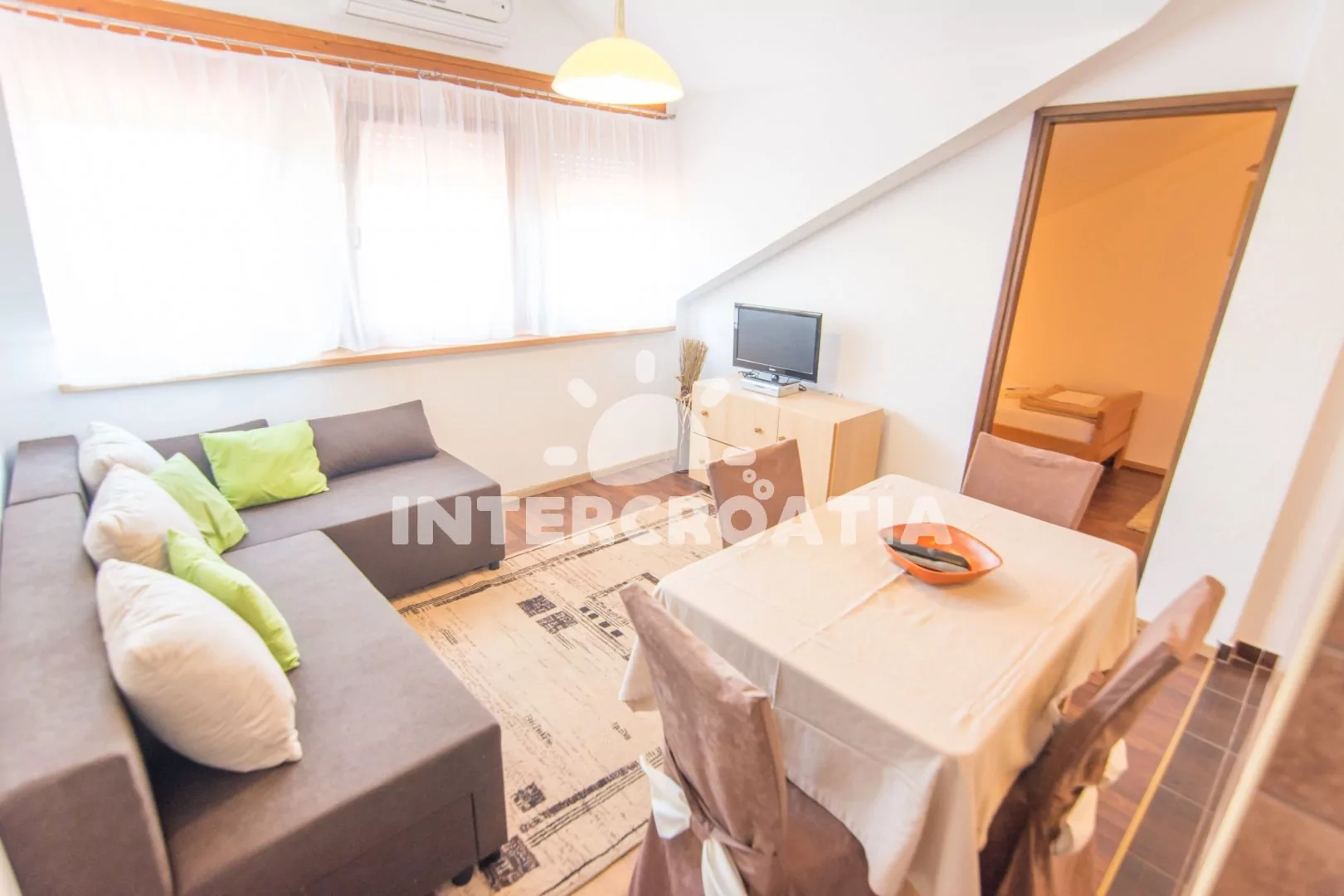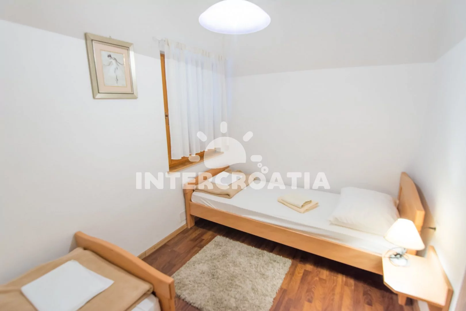 Apartmán pro 4 osoby s výhledem do klidné ulice se nachází v druhém patře domu. Obývací pokoj je spojený s kuchyní. Kuchyňská linka je vybavena varnou deskou, digestoří, nádobím a lednicí s mrazákem. Obývací pokoj s jídelním stolem pro 4 osoby, pohovkou, televizí se satelitním programem a klimatizací. První ložnice s dvoulůžkem. Druhá ložnice s dvěma jednolůžky. Koupelna se sprchovým koutem, umyvadlem a wc. Hostům je k dispozici parkování u objektu zdarma.