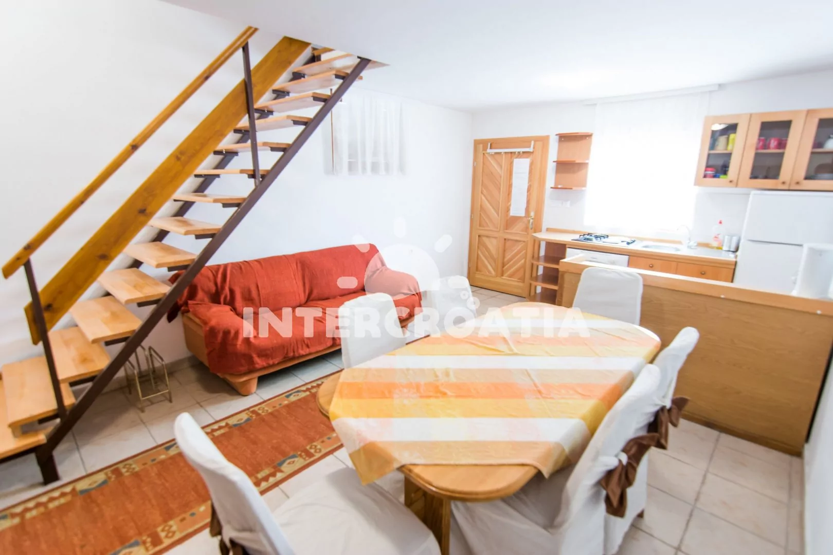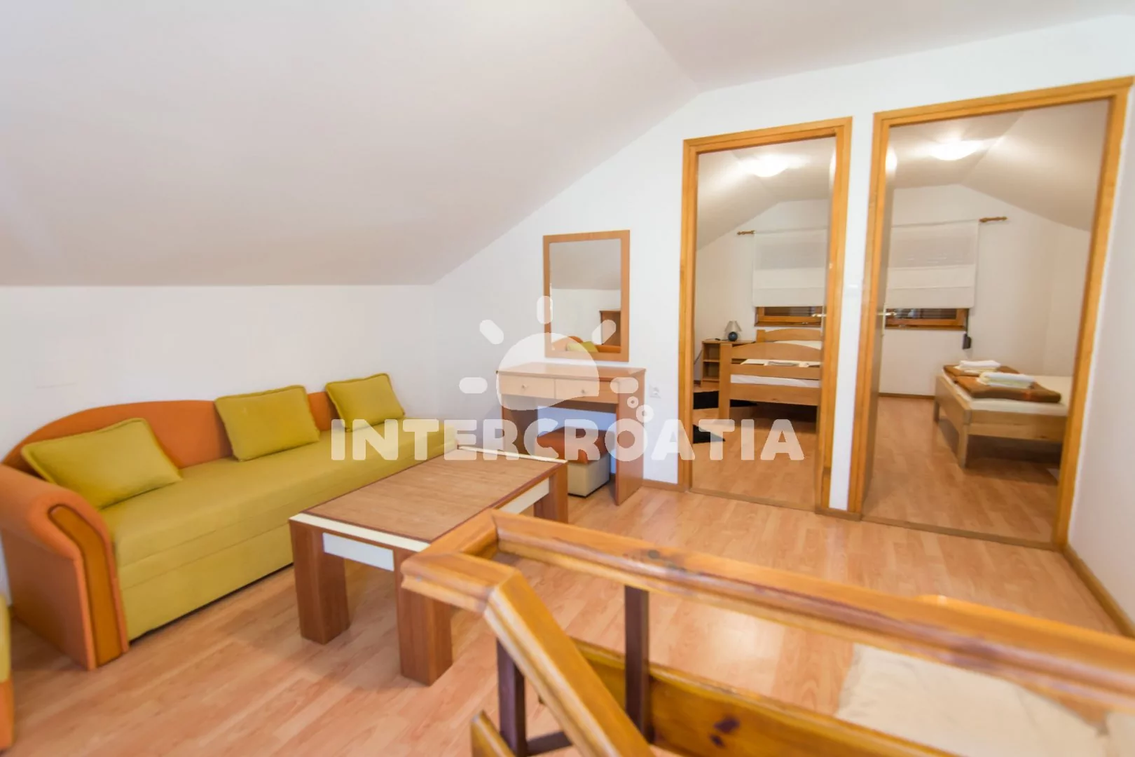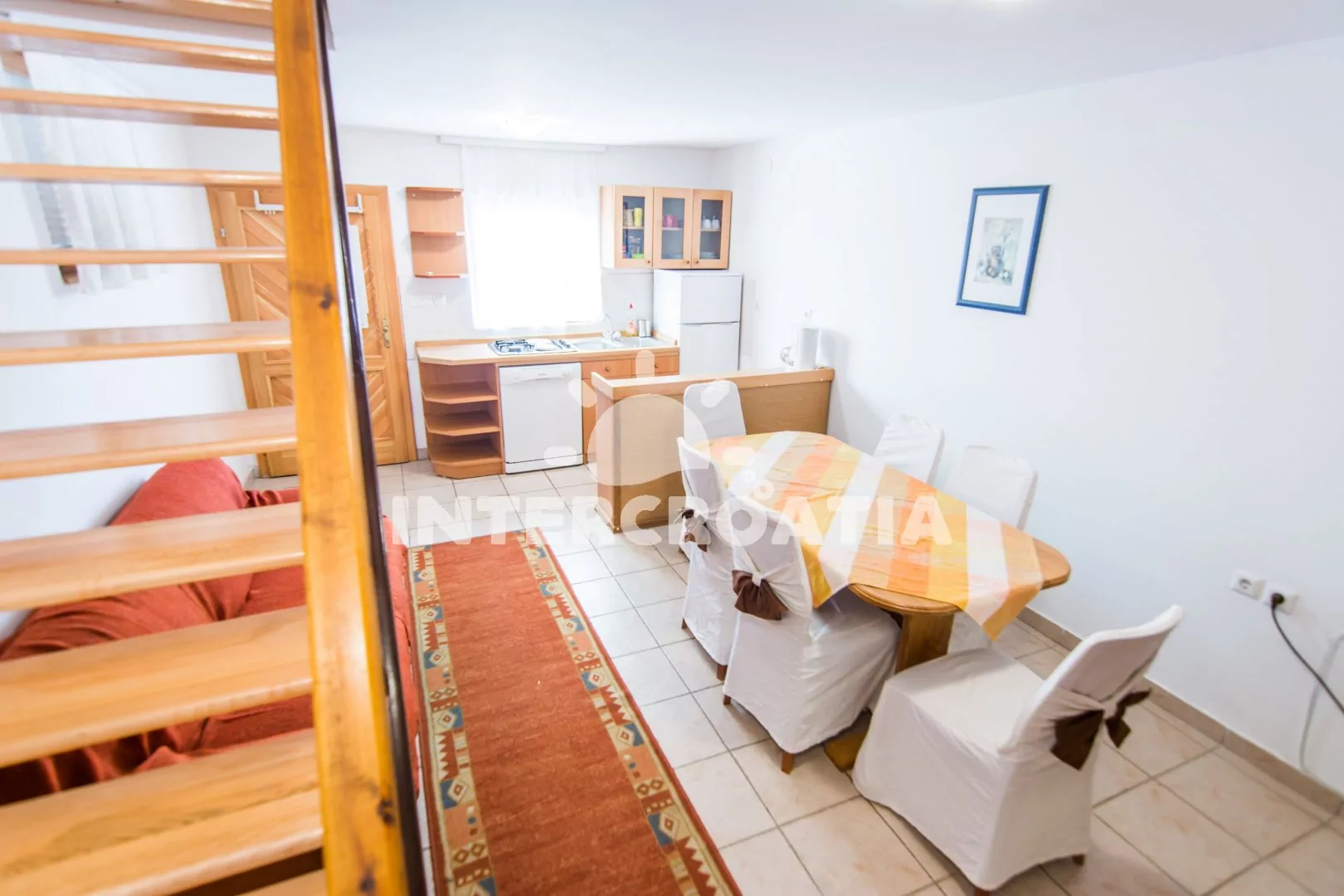Dvoupatrový domek s apartmánem stojící za hlavní vilou a vlastní terasou s grilem je vhodný pro 4 až 5 osob. Vstup: v přízemí se nachází obývací pokoj spojený s kuchyní. Kuchyňská linka je vybavena varnou deskou, myčkou na nádobí, kávovarem, nádobím a lednicí s mrazákem. Obývací pokoj s jídelním stolem pro 6 osob, pohovkou, televizí se satelitním programem, radiem a klimatizací. V prvním patře chodba s pohovkou (rozložitelná na extra lůžko pro 1 osobu) a dvěma ložnicemi. První ložnice je vybavena jedním dvoulůžkem. Druhá ložnice s dvěma jednolůžky. Koupelna se sprchovým koutem, umyvadlem a wc. Hostům je k dispozici parkování u objektu zdarma.
