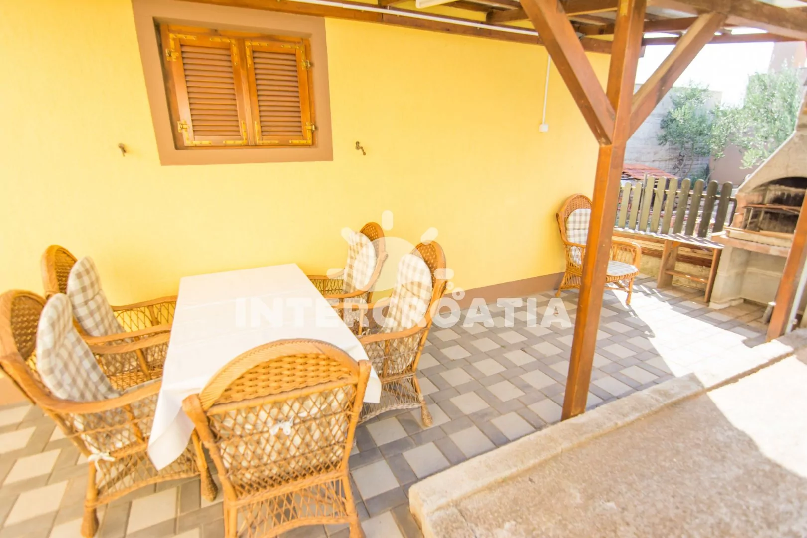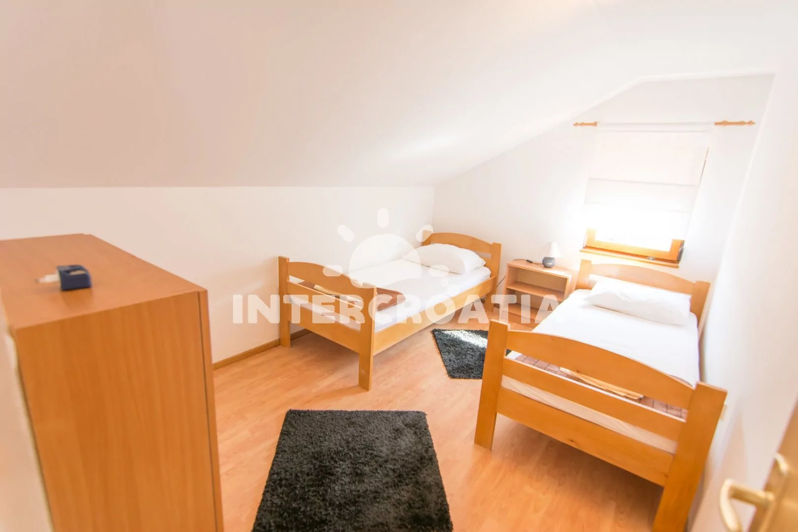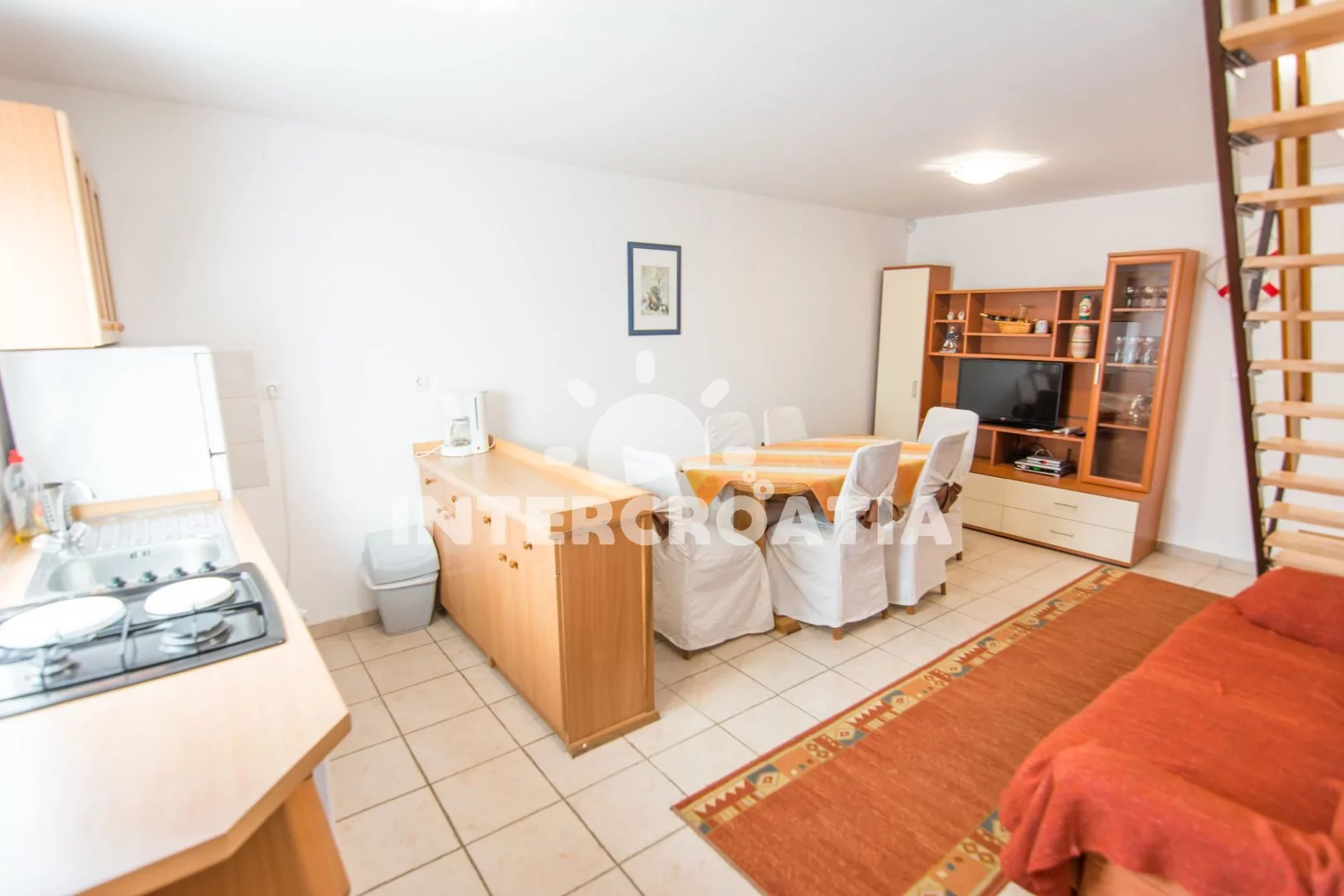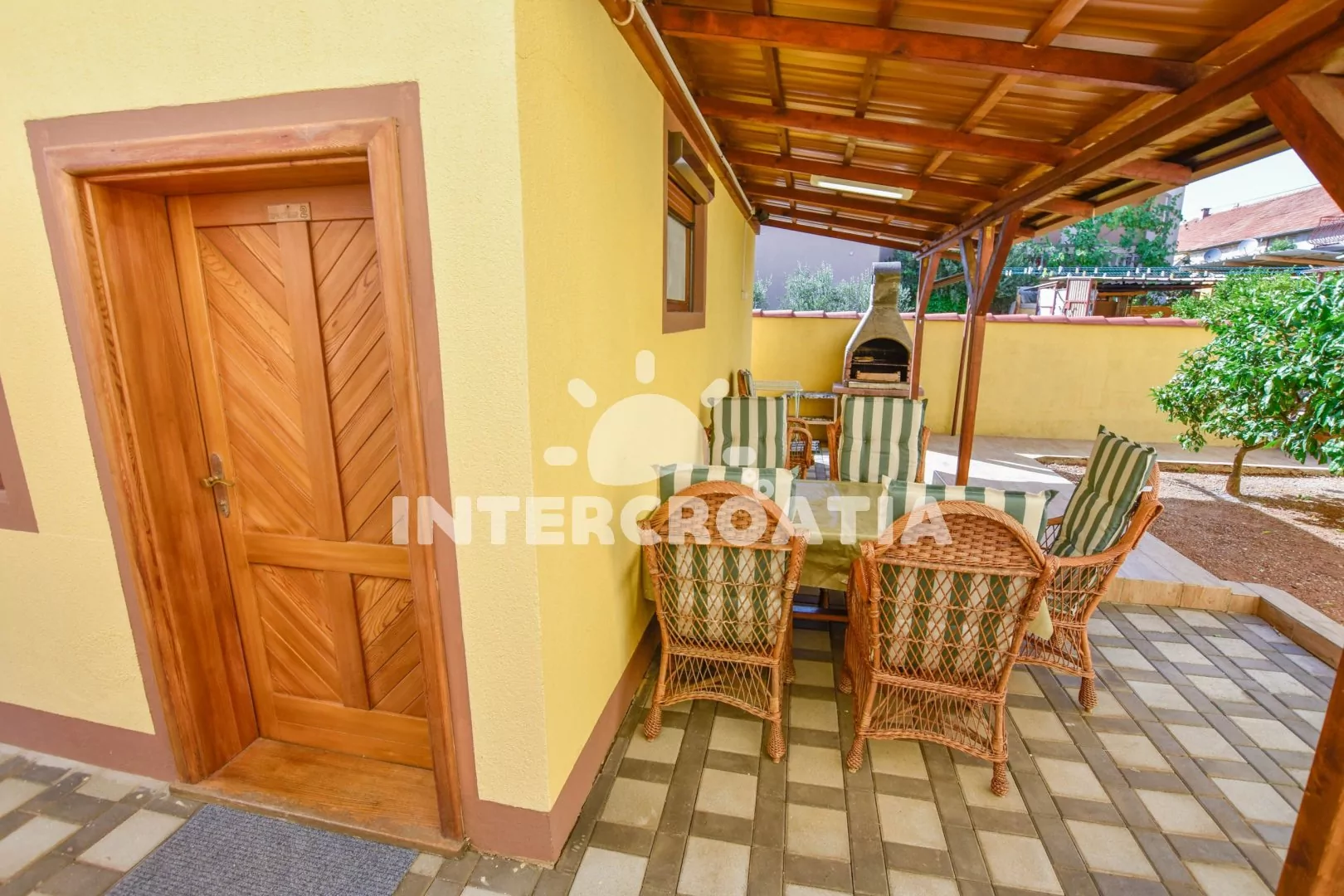 Dvoupatrový domek s apartmánem stojící za hlavní vilou a vlastní terasou s grilem je vhodný pro 4 až 5 osob. Vstup: v přízemí se nachází obývací pokoj spojený s kuchyní. Kuchyňská linka je vybavena varnou deskou, myčkou na nádobí, kávovarem, nádobím a lednicí s mrazákem. Obývací pokoj s jídelním stolem pro 6 osob, pohovkou, televizí se satelitním programem, radiem a klimatizací. V prvním patře chodba s pohovkou (rozložitelná na extra lůžko pro 1 osobu) a dvěma ložnicemi. První ložnice je vybavena jedním dvoulůžkem. Druhá ložnice s dvěma jednolůžky. Koupelna se sprchovým koutem, umyvadlem a wc. Hostům je k dispozici parkování u objektu zdarma.