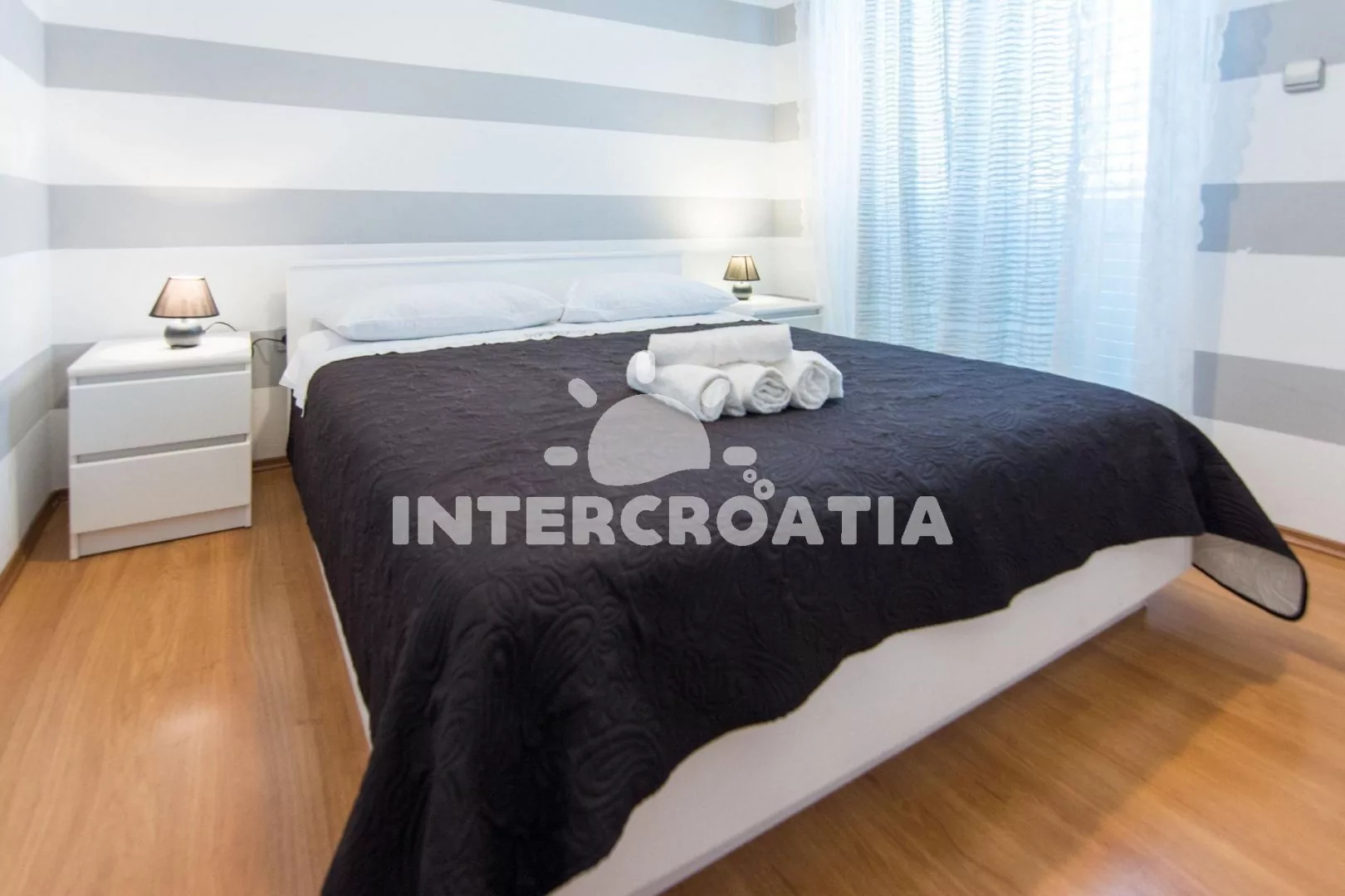 Apartmán (60 m2) s balkonem a výhledem na moře se nachází v 1. patře domu a je vhodný pro 2 až 4 osoby. Obývací pokoj je spojený s kuchyní. Kuchyňská linka je vybavena sklokeramickou varnou deskou, troubou, digestoří, myčkou na nádobí, rychlovarnou konvicí, nádobím a lednicí s mrazákem. Obývací pokoj s jídelním stolem pro 4 osoby, pohovkou (rozložitelná na extra lůžko pro 2 osoby), televizí, klimatizací a vstupem na balkon. První ložnice s jedním dvoulůžkem. Druhá ložnice s dvěma jednolůžky. Dvě koupelny se sprchovým koutem, umyvadlem a wc. Hostům je k dispozici parkování u objektu zdarma.