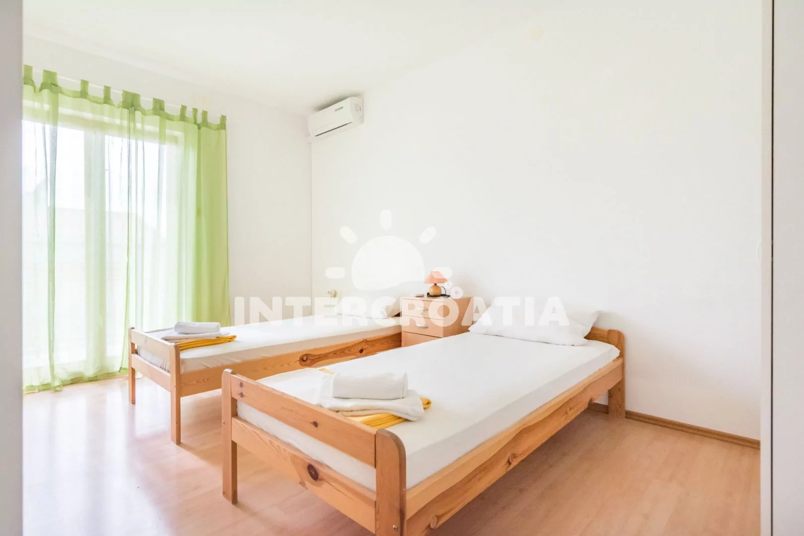 Apartmán (60 m2) s balkonem a výhledem na moře se nachází v 1. patře domu a je vhodný pro až 4 osoby. Obývací pokoj je spojený s kuchyní. Kuchyňská linka je vybavena dvouplotýnkovým vařičem, rychlovarnou konvicí, nádobím a lednicí s mrazákem. Obývací pokoj s jídelním stolem pro 4 osoby, pohovkou a vstupem na balkon. První ložnice s jedním dvoulůžkem a televizí se satelitním programem. Druhá ložnice s dvěma jednolůžky, klimatizací a vstupem na balkon. Koupelna se sprchovým koutem, umyvadlem a wc. Hostům je k dispozici parkování u objektu zdarma.