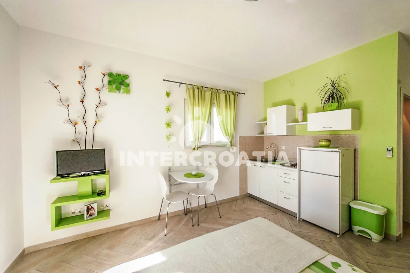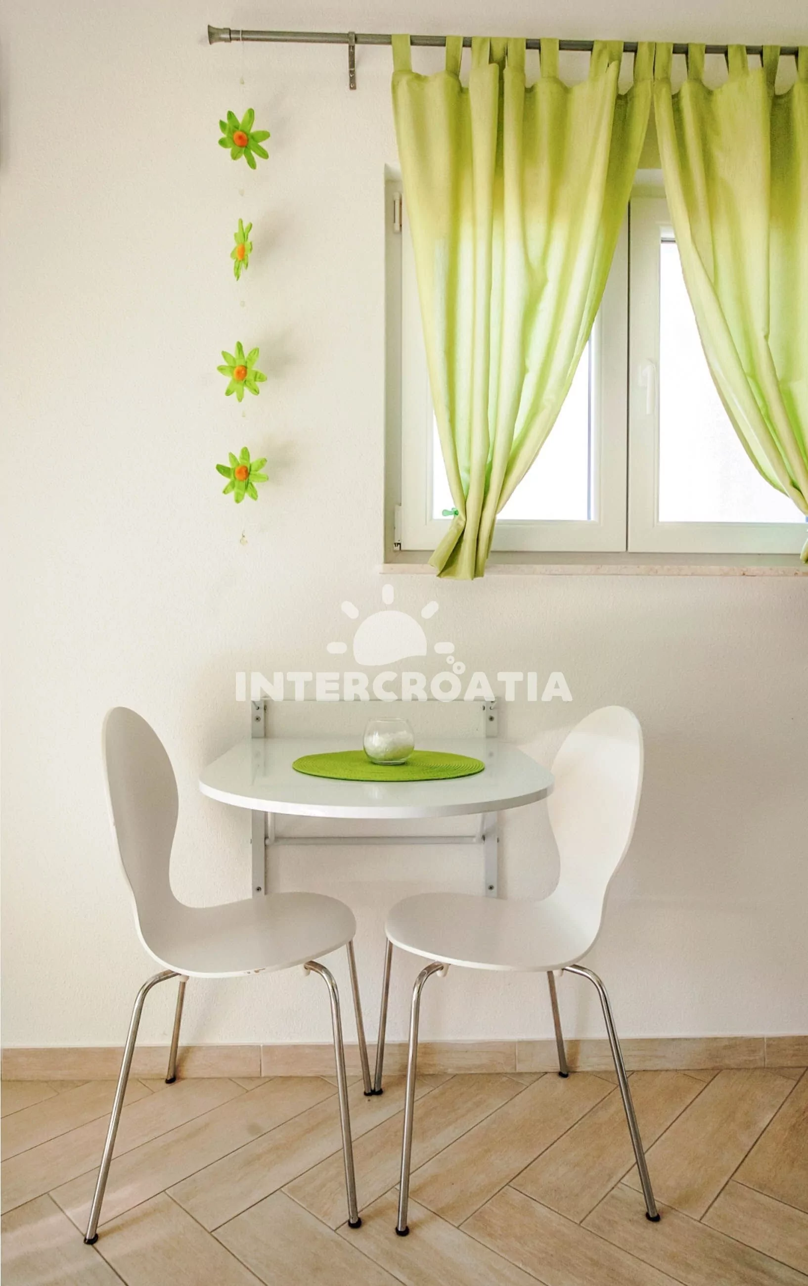 Apartmán (25 m2) typu studio s terasou, posezením a výhledem do klidné ulice se nachází v přízemí domu. Apartmán je vhodný pro 2 osoby. Obývací místnost je spojena s kuchyní. Kuchyňská linka je vybavena dvouplotýnkovou varnou deskou, nádobím a lednicí s mrazákem. Obývací místnost s jídelním stolem pro 2 osoby, dvoulůžkem, televizí se satelitním programem, klimatizací a vstupem na terasu. Koupelna se sprchovým koutem, umyvadlem a wc. Hostům je k dispozici parkování u objektu zdarma.