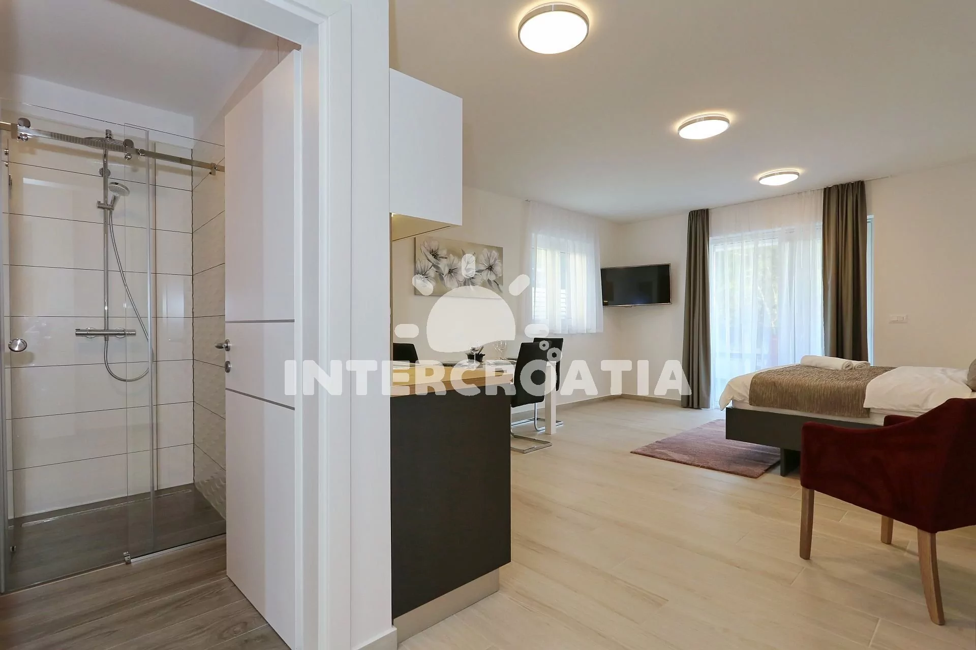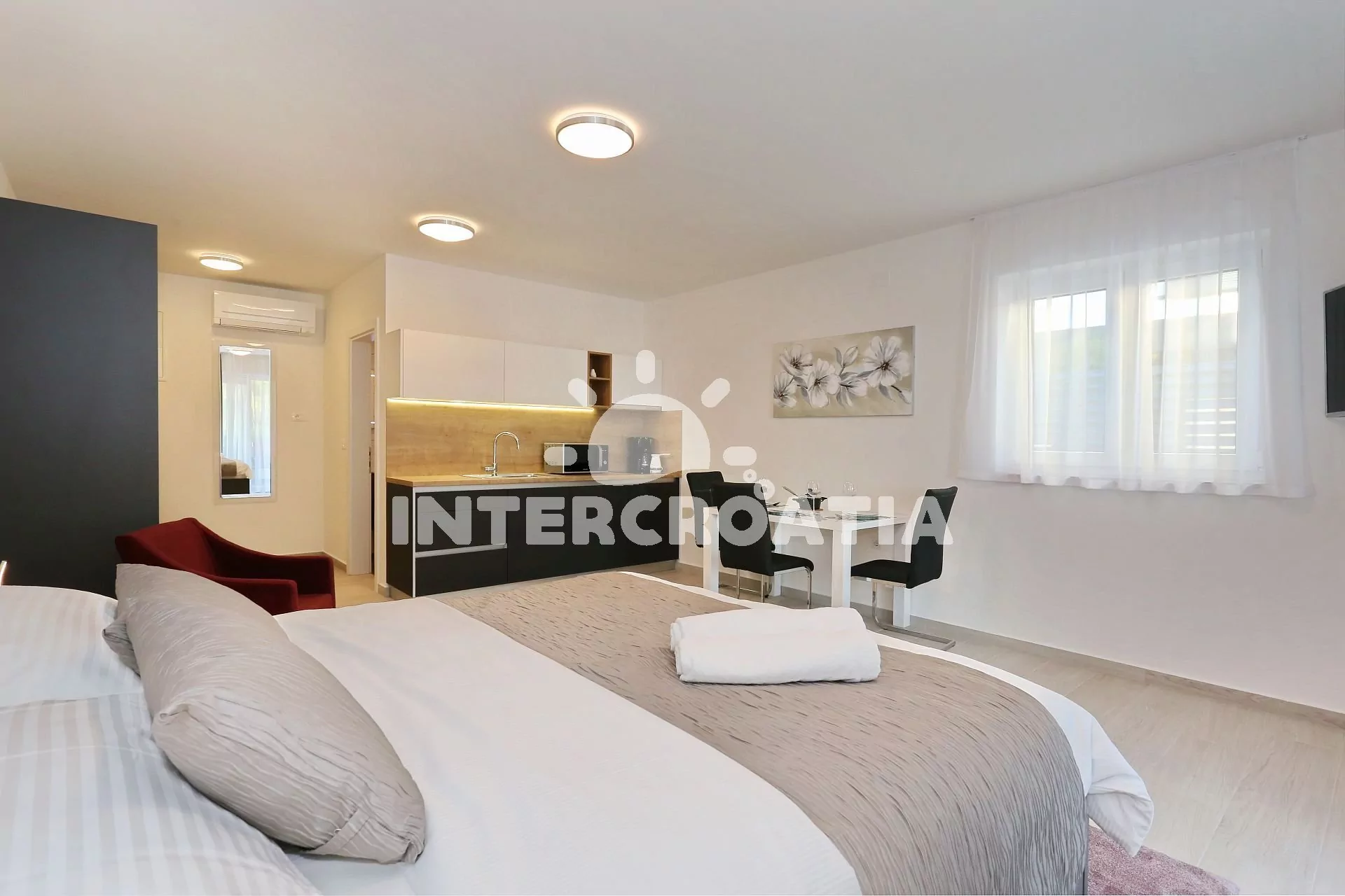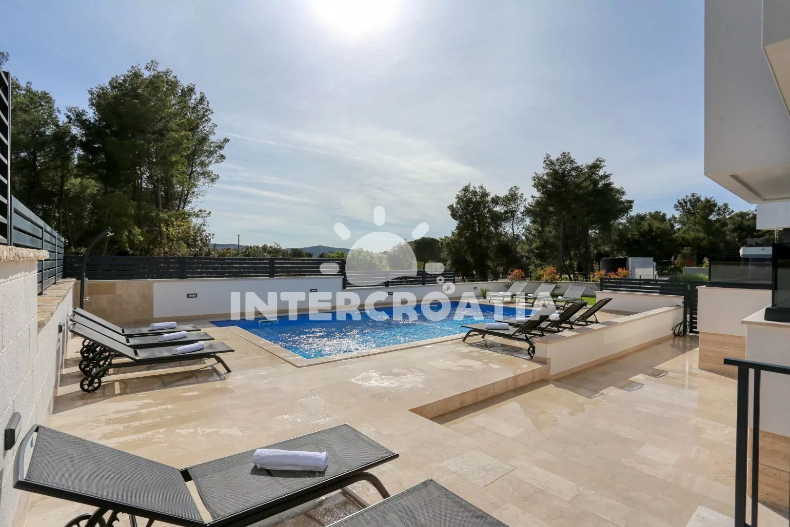 Moderně vystavěná apartmánová vila s venkovním bazénem se nachází do 200 m pěší chůzí od moře a písčito-oblázkové pláže. Vila disponuje několika apartmány s lodžiemi a venkovním posezením. U vily osvětlený venkovní bazén s lehátky a terasou. Parkovací místa pro automobily u objektu.