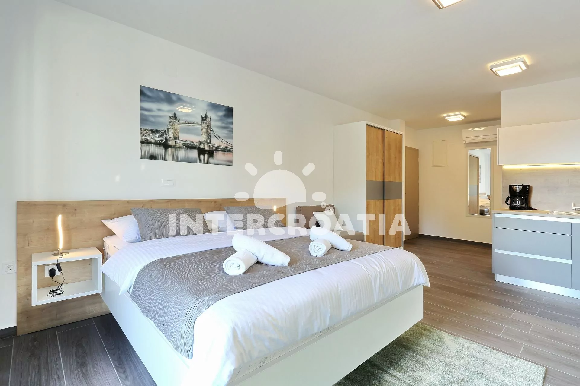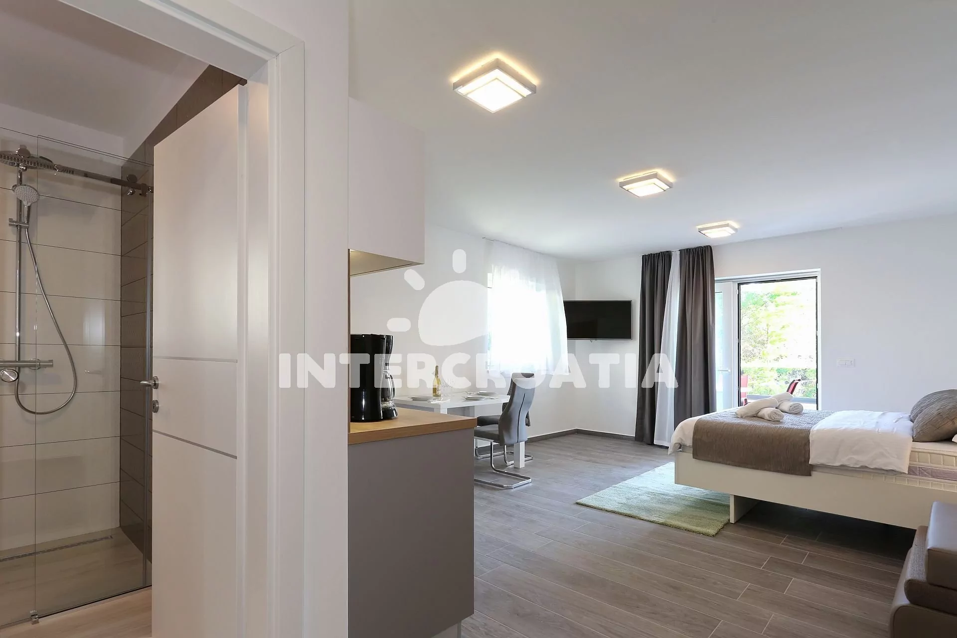 Apartmán (34 m2) typu studio s výhledem na moře, vlastní terasou a venkovním posezením. Apartmán se nachází v 1. patře vily a je vhodný pro 2 osoby. Obývací místnost je spojena s kuchyní. Kuchyňská linka je vybavena dvouplotýnkovou varnou deskou, digestoří, mikrovlnnou troubou, kávovarem, rychlovarnou konvicí, nádobím a lednicí s mrazákem. Obývací místnost s jídelním stolem, jedním dvoulůžkem, televizí se satelitním programem, klimatizací a vstupem na terasu. Koupelna se sprchovým koutem, umyvadlem a wc. Hostům jek dispozici parkování u objektu zdarma.