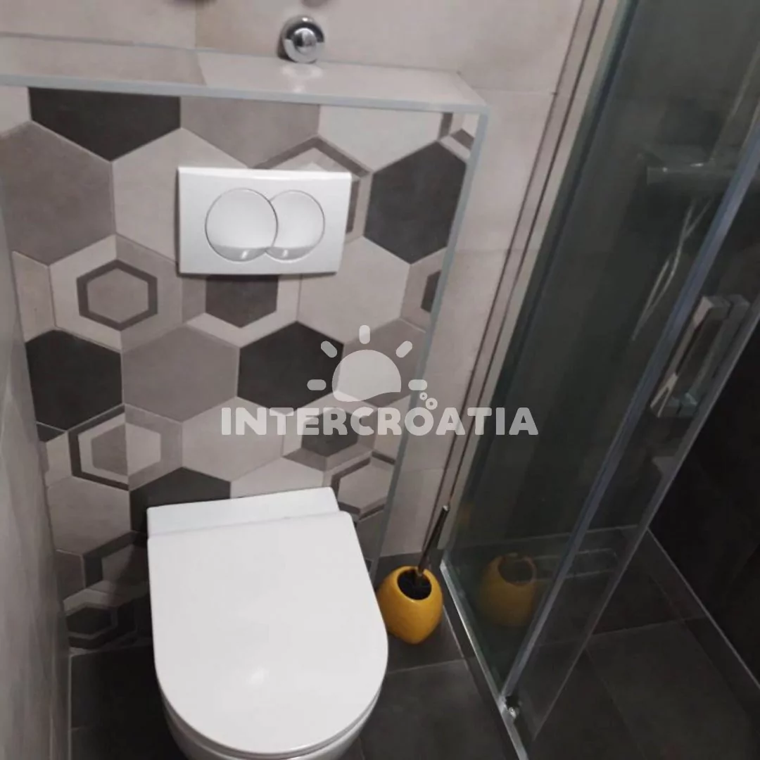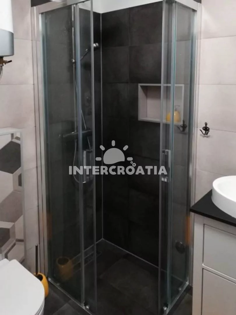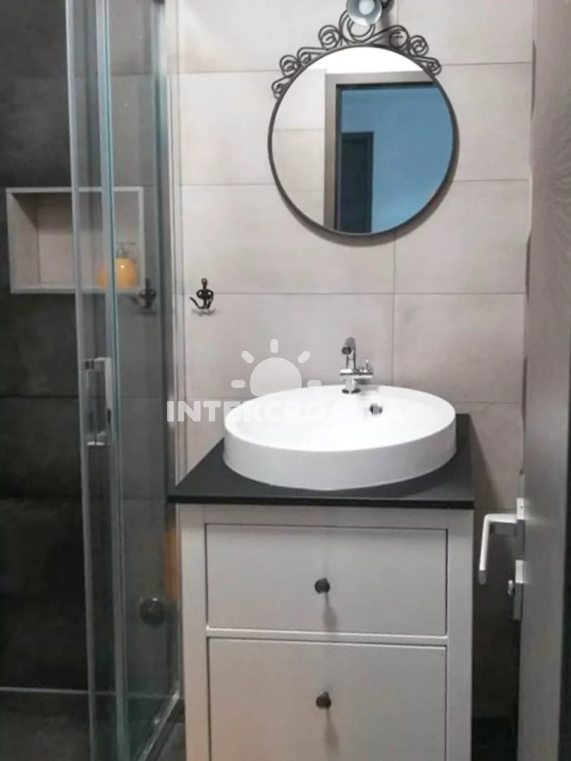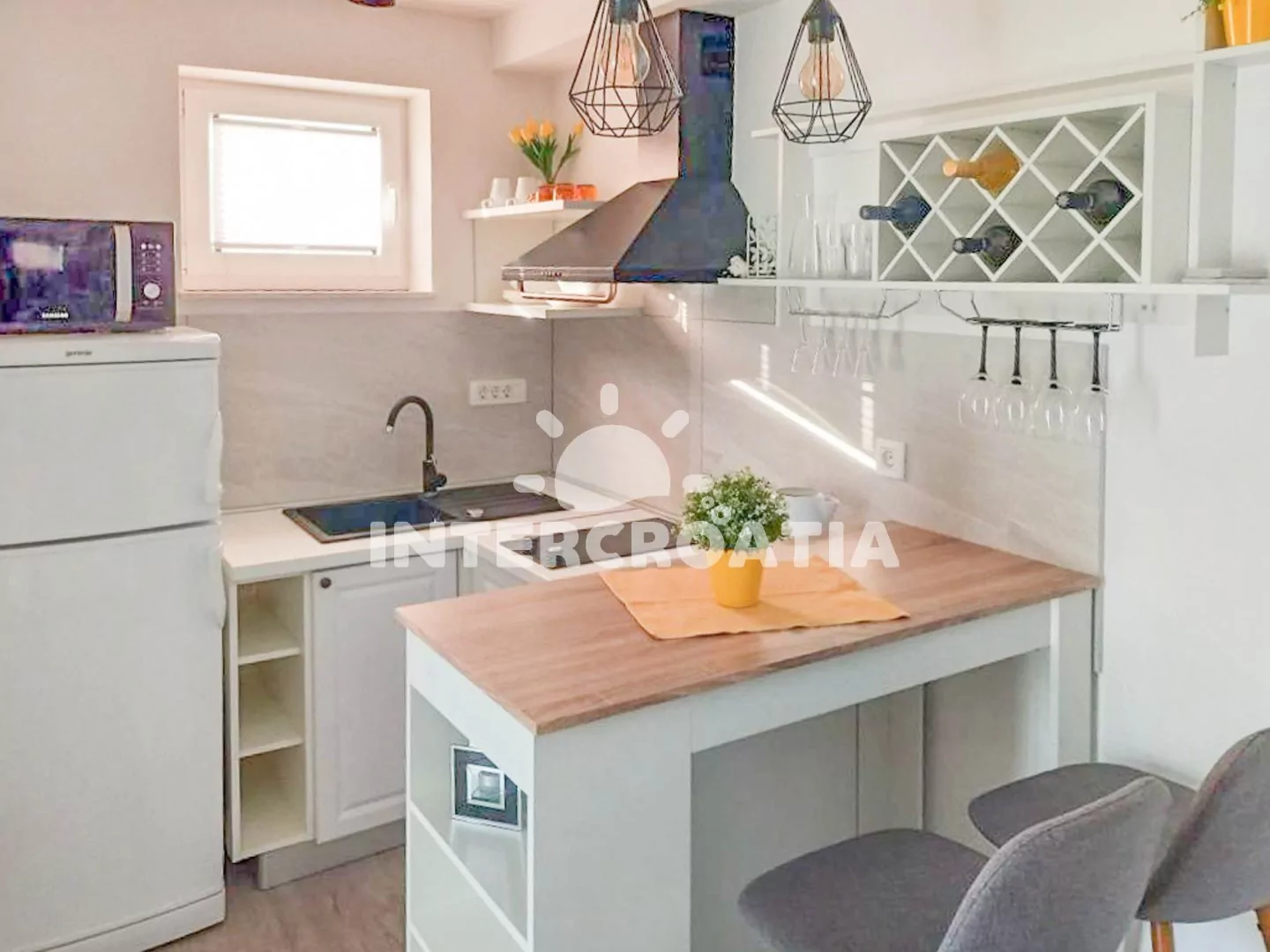 Apartmán (35 m2) s terasou posezením a částečným výhledem na moře se nachází v suterénu domu. Apartmán má 1 ložnice a je vhodný pro 2 až 4 osoby. Obývací pokoj je spojený s kuchyní. Kuchyňská linka…