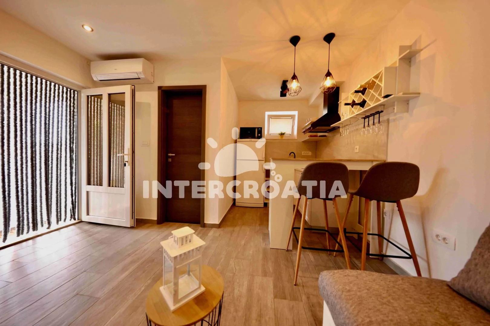 Apartmán (35 m2) s terasou posezením a částečným výhledem na moře se nachází v suterénu domu. Apartmán má 1 ložnice a je vhodný pro 2 až 4 osoby. Obývací pokoj je spojený s kuchyní. Kuchyňská linka je vybavena dvouplotýnkovým vařičem, digestoří, mikrovlnnou troubou, nádobím a lednicí s mrazákem. Obývací pokoj s jídelním stolem, pohovkou (rozložitelná na extra lůžko pro 2 osoby), televizí se satelitním programem, klimatizací a vstupem na terasu. Ložnice s jedním dvoulůžkem. Koupelna se sprchovým koutem, umyvadlem, fénem a wc. Hostům je k dispozici parkování u objektu zdarma.