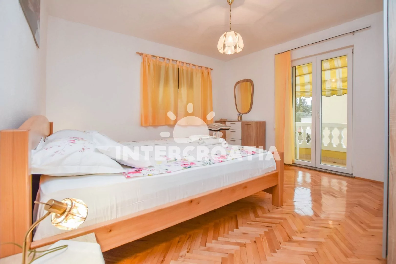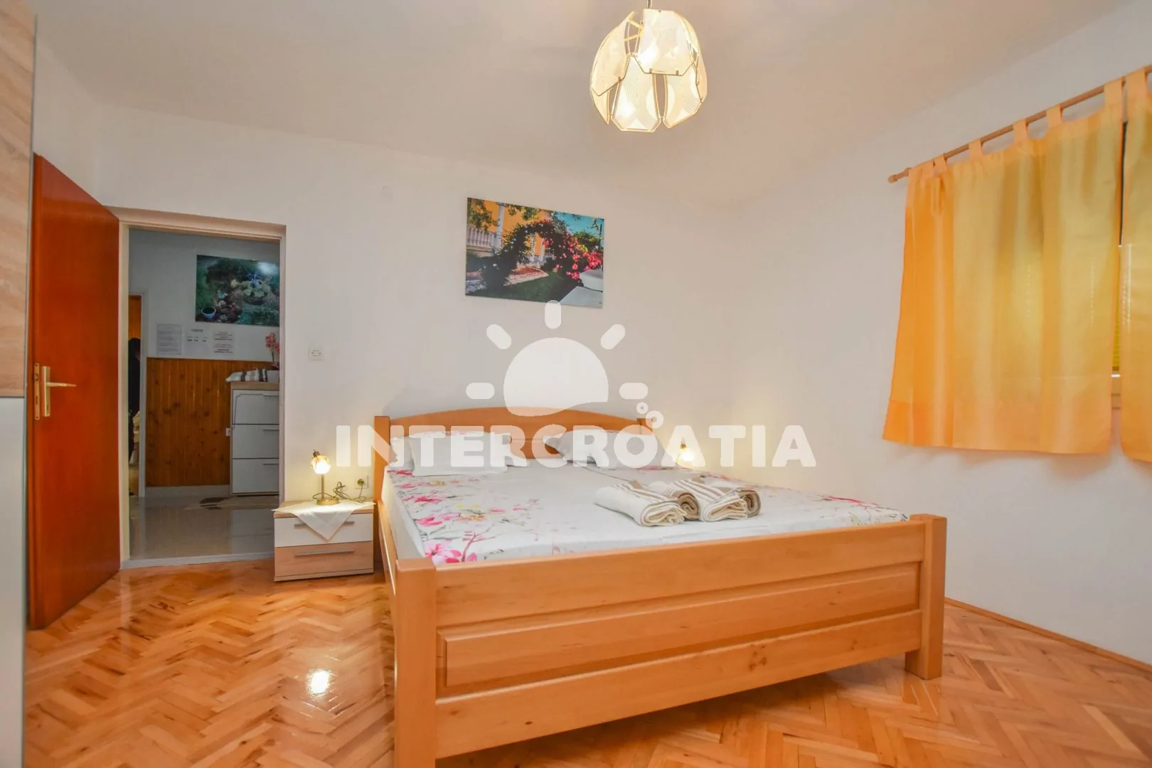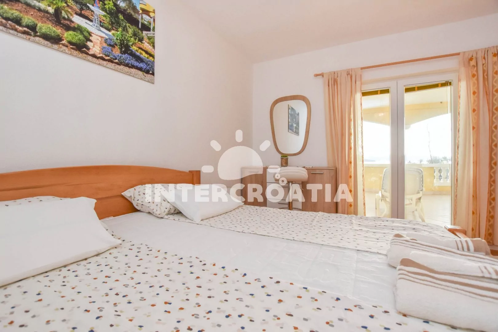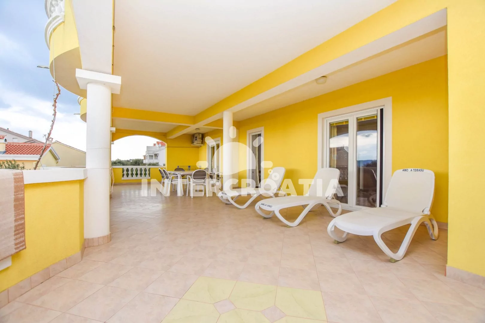 Velký apartmán (120 m2) s terasou, posezením, lehátky a výhledem na moře se nachází v 1. patře domu. Apartmán má 3 ložnice a je vhodný pro 5 až 7 osob. Obývací pokoj je spojený s kuchyní. Kuchyňská linka je vybavena varnou deskou, digestoří, vestavěnou troubou, rychlovarnou konvicí, kávovarem, mikrovlnnou troubou, nádobím a lednicí s mrazákem. Obývací pokoj s jídelním stolem pro 6 osob, pohovkou (rozložitelná na extra lůžko pro 2 osoby), televizí se satelitním programem, klimatizací a vstupem na terasu. První ložnice s dvoulůžkem a vstupem na terasu. Druhá ložnice s dvoulůžkem a vstupem na terasu. Třetí ložnice s jedním jednolůžkem. Koupelna s vanou, umyvadlem, fénem, pračkou a wc. Hostům je k dispozici parkování u objektu zdarma.
