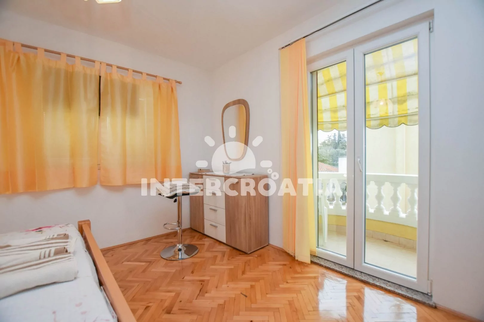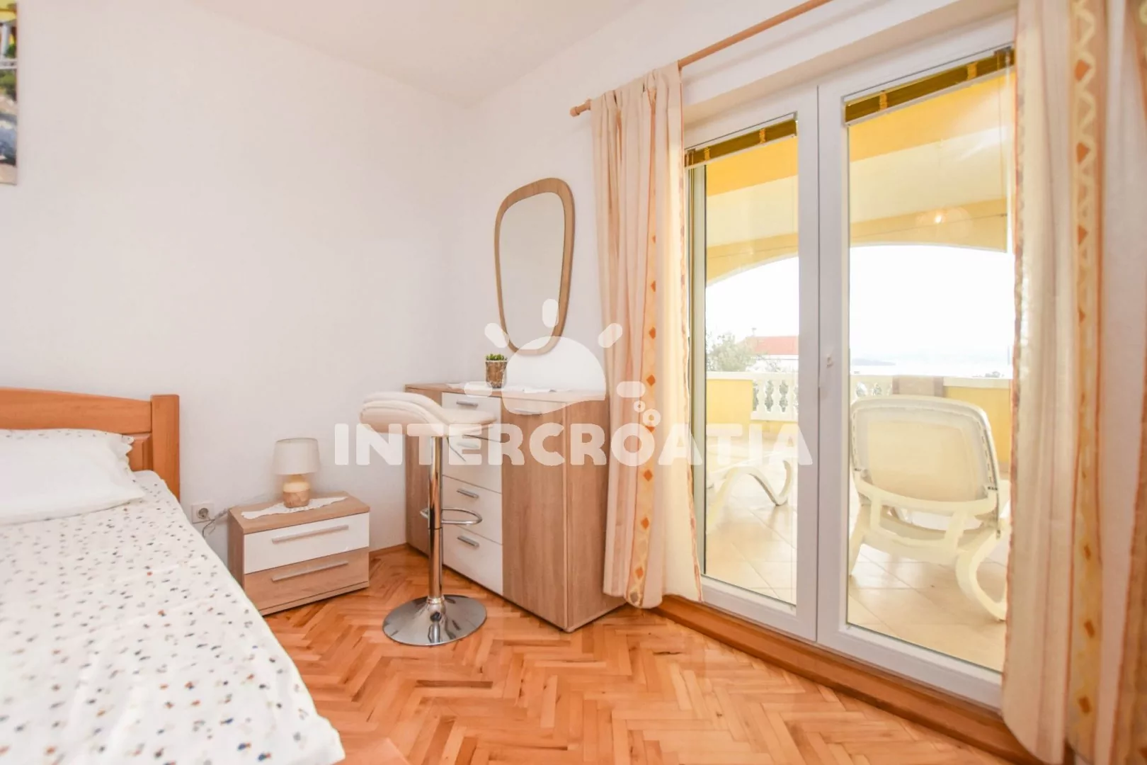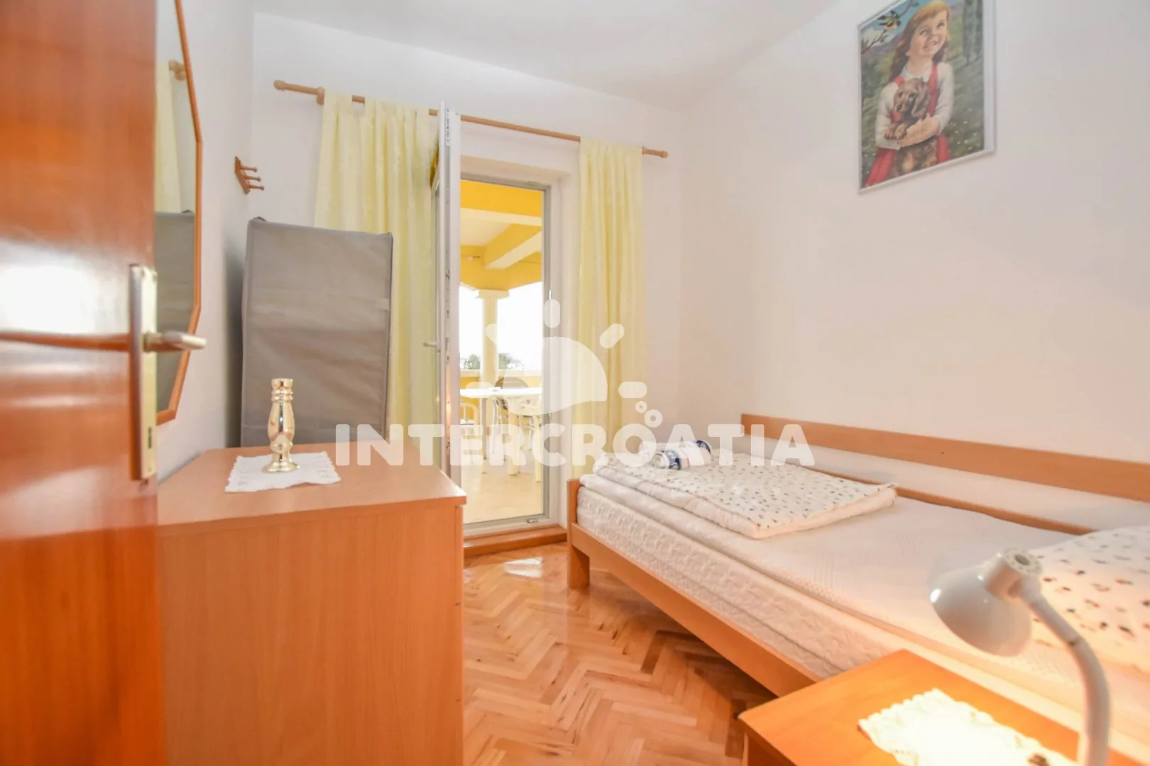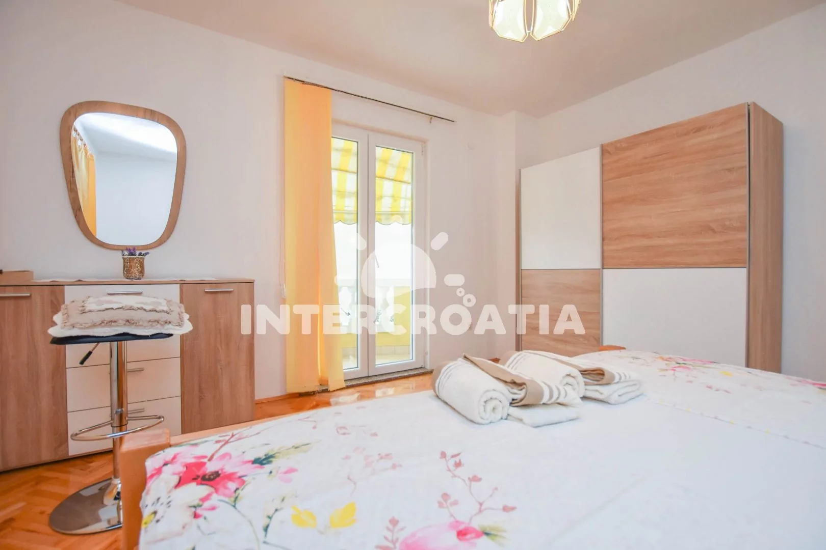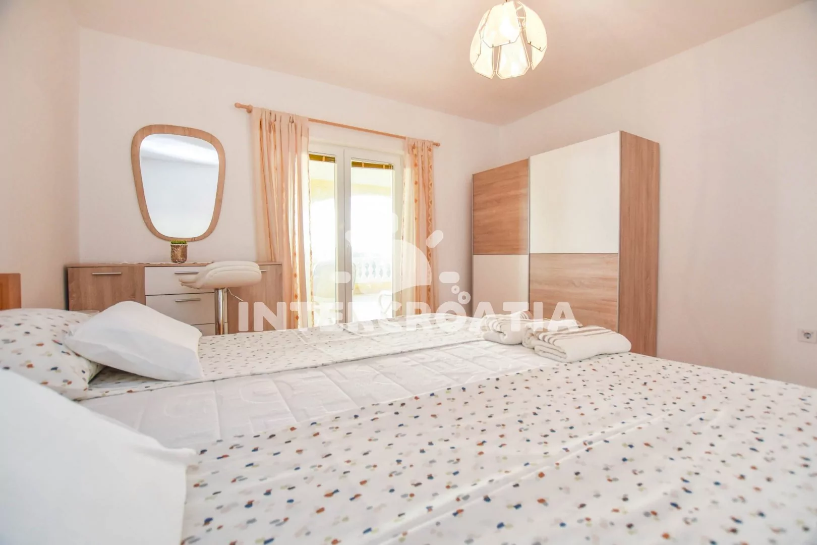 Velký apartmán (120 m2) s terasou, posezením, lehátky a výhledem na moře se nachází v 1. patře domu. Apartmán má 3 ložnice a je vhodný pro 5 až 7 osob. Obývací pokoj je spojený s kuchyní. Kuchyňská linka je vybavena varnou deskou, digestoří, vestavěnou troubou, rychlovarnou konvicí, kávovarem, mikrovlnnou troubou, nádobím a lednicí s mrazákem. Obývací pokoj s jídelním stolem pro 6 osob, pohovkou (rozložitelná na extra lůžko pro 2 osoby), televizí se satelitním programem, klimatizací a vstupem na terasu. První ložnice s dvoulůžkem a vstupem na terasu. Druhá ložnice s dvoulůžkem a vstupem na terasu. Třetí ložnice s jedním jednolůžkem. Koupelna s vanou, umyvadlem, fénem, pračkou a wc. Hostům je k dispozici parkování u objektu zdarma.