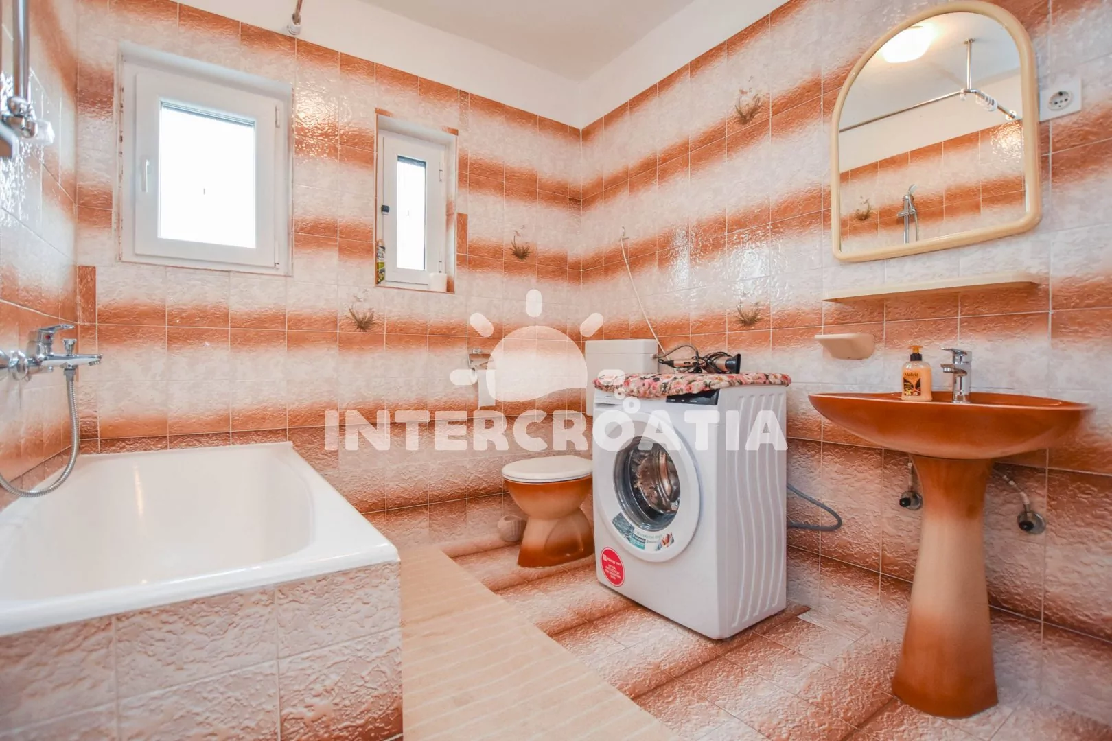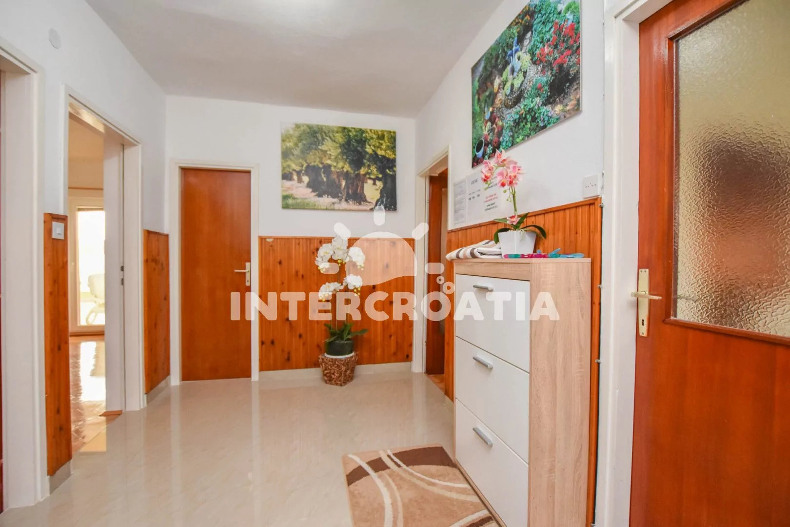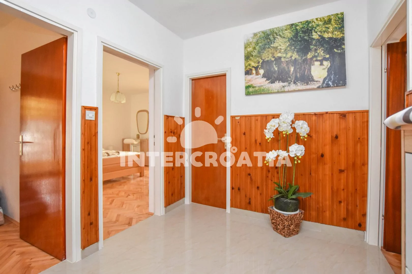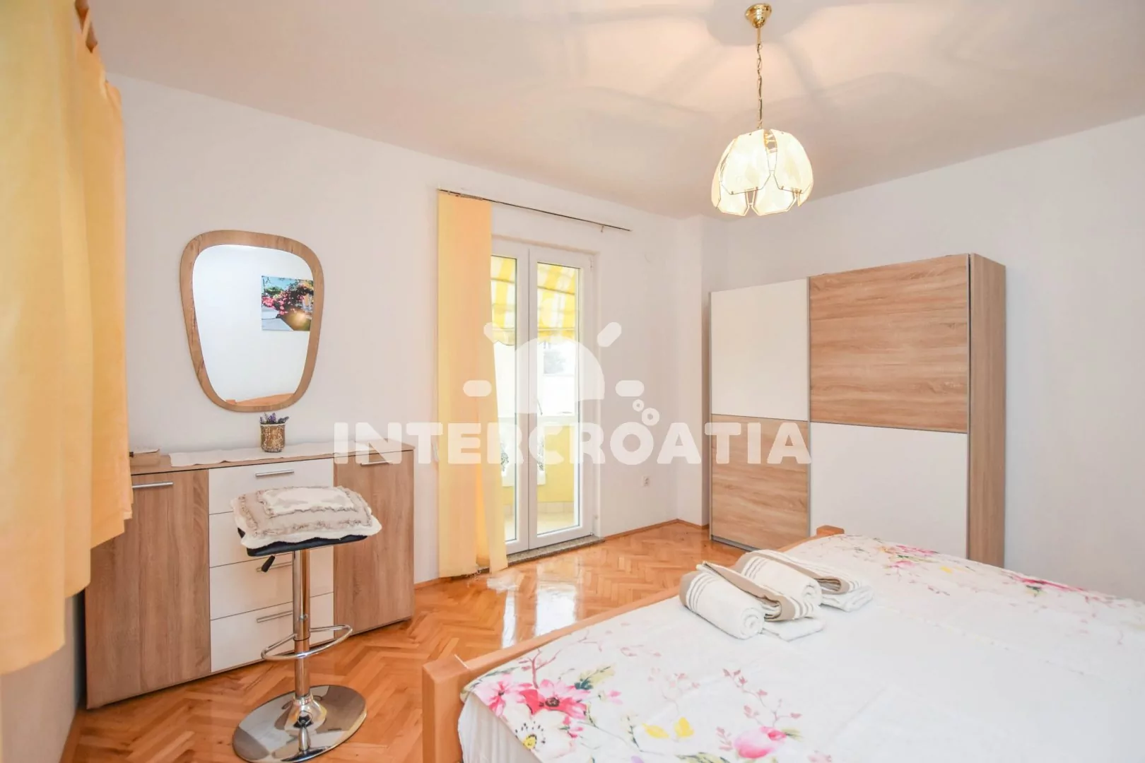 Velký apartmán (120 m2) s terasou, posezením, lehátky a výhledem na moře se nachází v 1. patře domu. Apartmán má 3 ložnice a je vhodný pro 5 až 7 osob. Obývací pokoj je spojený s kuchyní. Kuchyňská linka je vybavena varnou deskou, digestoří, vestavěnou troubou, rychlovarnou konvicí, kávovarem, mikrovlnnou troubou, nádobím a lednicí s mrazákem. Obývací pokoj s jídelním stolem pro 6 osob, pohovkou (rozložitelná na extra lůžko pro 2 osoby), televizí se satelitním programem, klimatizací a vstupem na terasu. První ložnice s dvoulůžkem a vstupem na terasu. Druhá ložnice s dvoulůžkem a vstupem na terasu. Třetí ložnice s jedním jednolůžkem. Koupelna s vanou, umyvadlem, fénem, pračkou a wc. Hostům je k dispozici parkování u objektu zdarma.