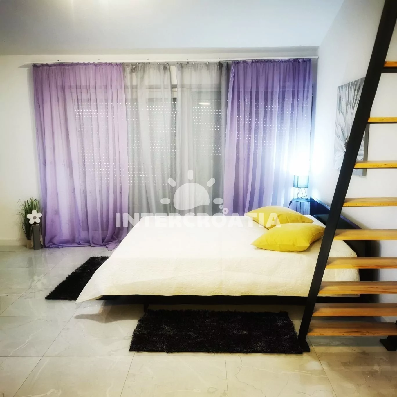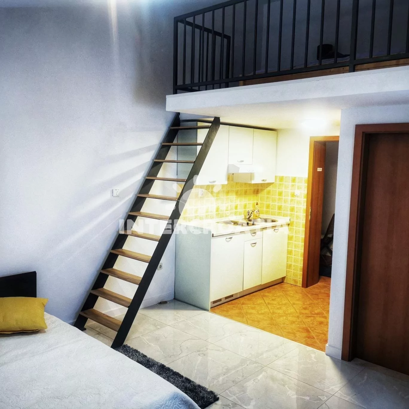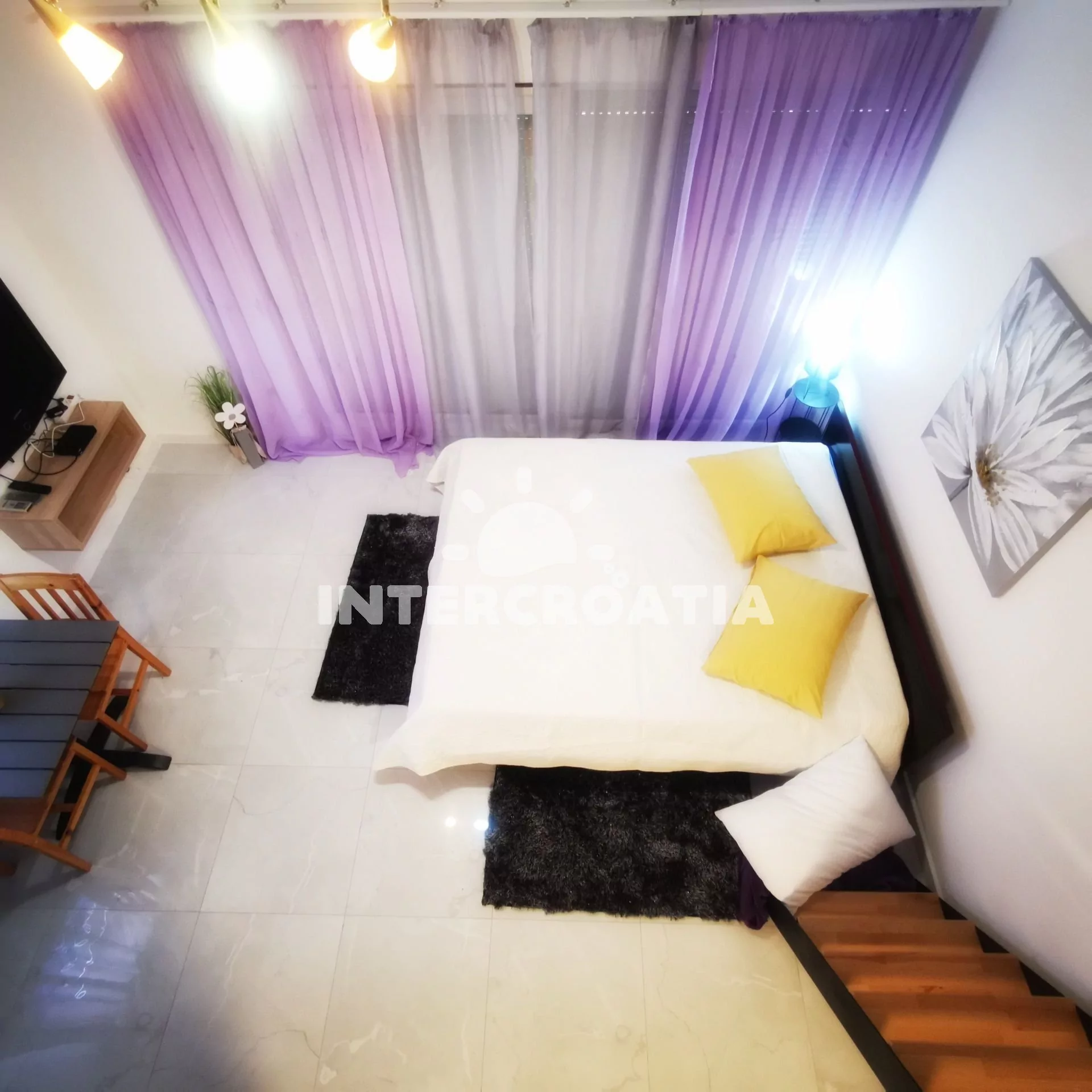 Apartmán (30 m2) typu studio s balkonem, výhledem do zahrady a klidné ulice se nachází ve 2. patře domu. Apartmán je vhodný pro 2 až 3 osoby. Obývací místnost je spojena s kuchyní. Kuchyňská linka je vybavena dvouplotýnkovým vařičem, digestoří, rychlovarnou konvicí, nádobím a lednicí s mrazákem. Obývací místnost s jídelním stolem, televizí, klimatizací, vstupem na balkon, jedním dvoulůžkem a v patře jedním jednolůžkem. Koupelna se sprchovým koutem, umyvadlem a wc. Hostům je k dispozici parkování u objektu zdarma.