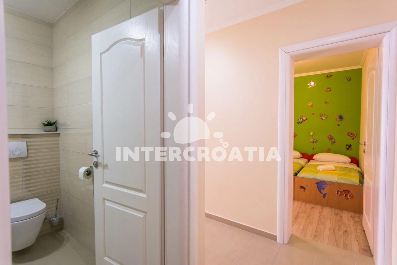 Vzdálenosti: mini golf 0 m, Moře 200 m, pláž 200 m (oblázky), supermarket 20 m, bar 50 m, centrum 50 m, banka 80 m, směnárna 80 m, veřejná doprava 100 m, pošta 120 m, lékárna 150 m, restaurace 150 m, půjčovna kol 150 m, půjčovna motorových člunů 150 m, potápění 300 m, ambulance 450 m, marina 550 m, trajekt (Biograd) 550 m, čerpací stanice 550 m, muzeum 600 m, tenisové kurty 800 m, diskotéka 800 m, letiště (Zadar) 30 km, park Plitvice 30 km,