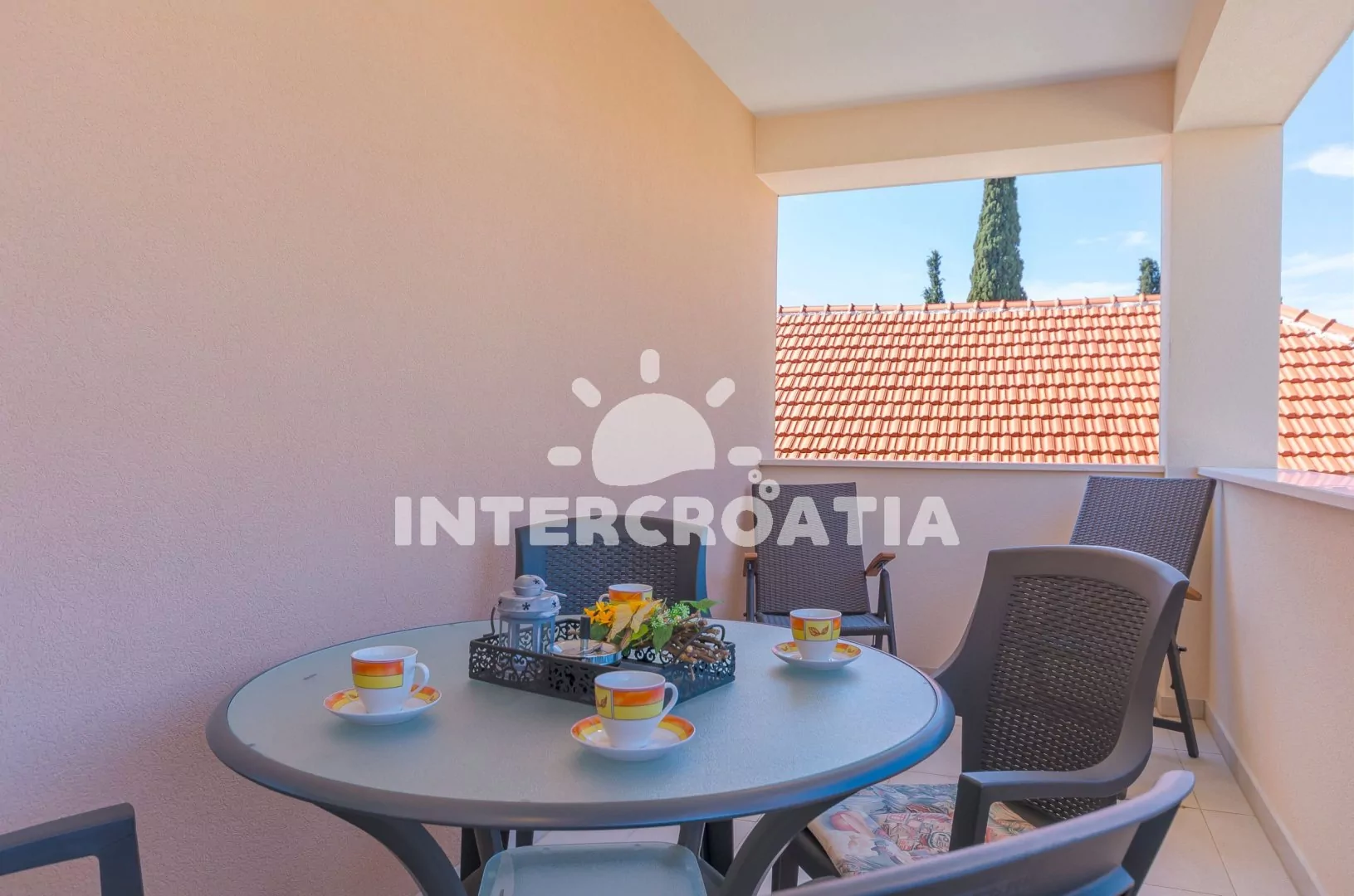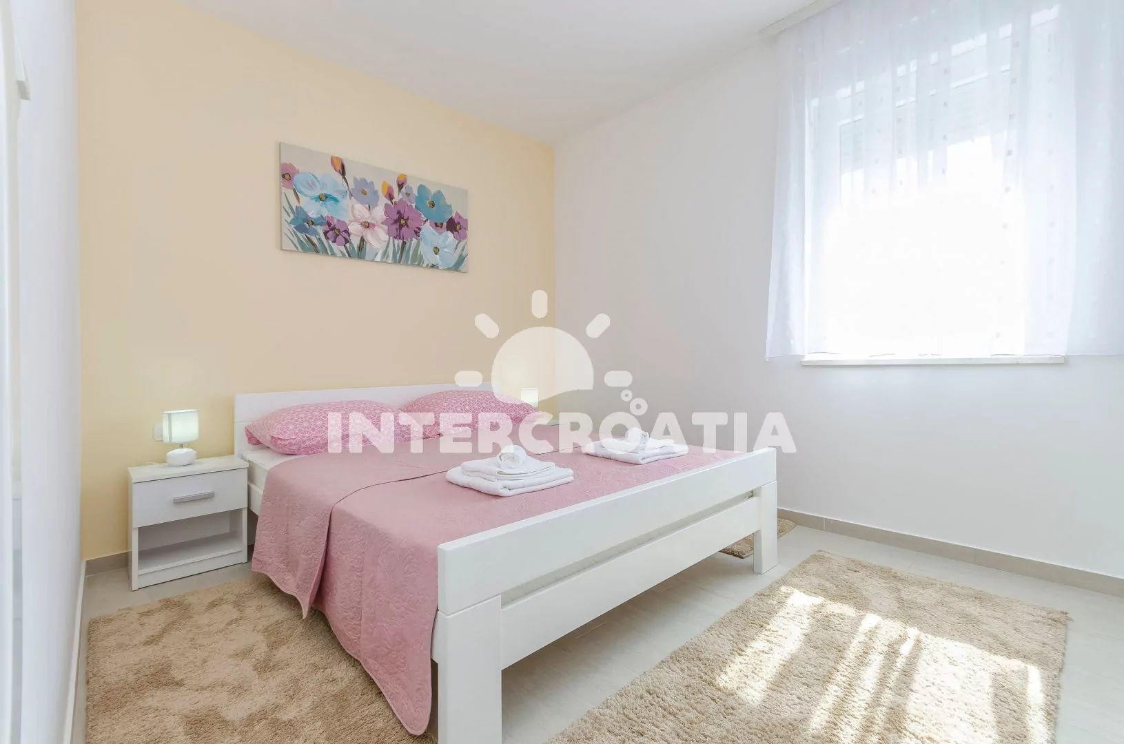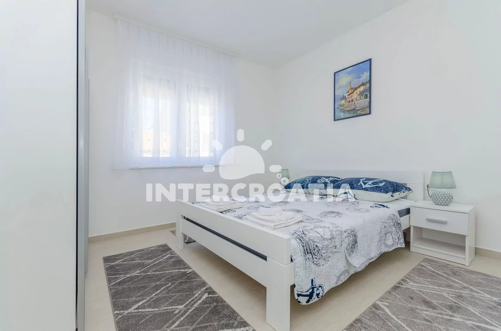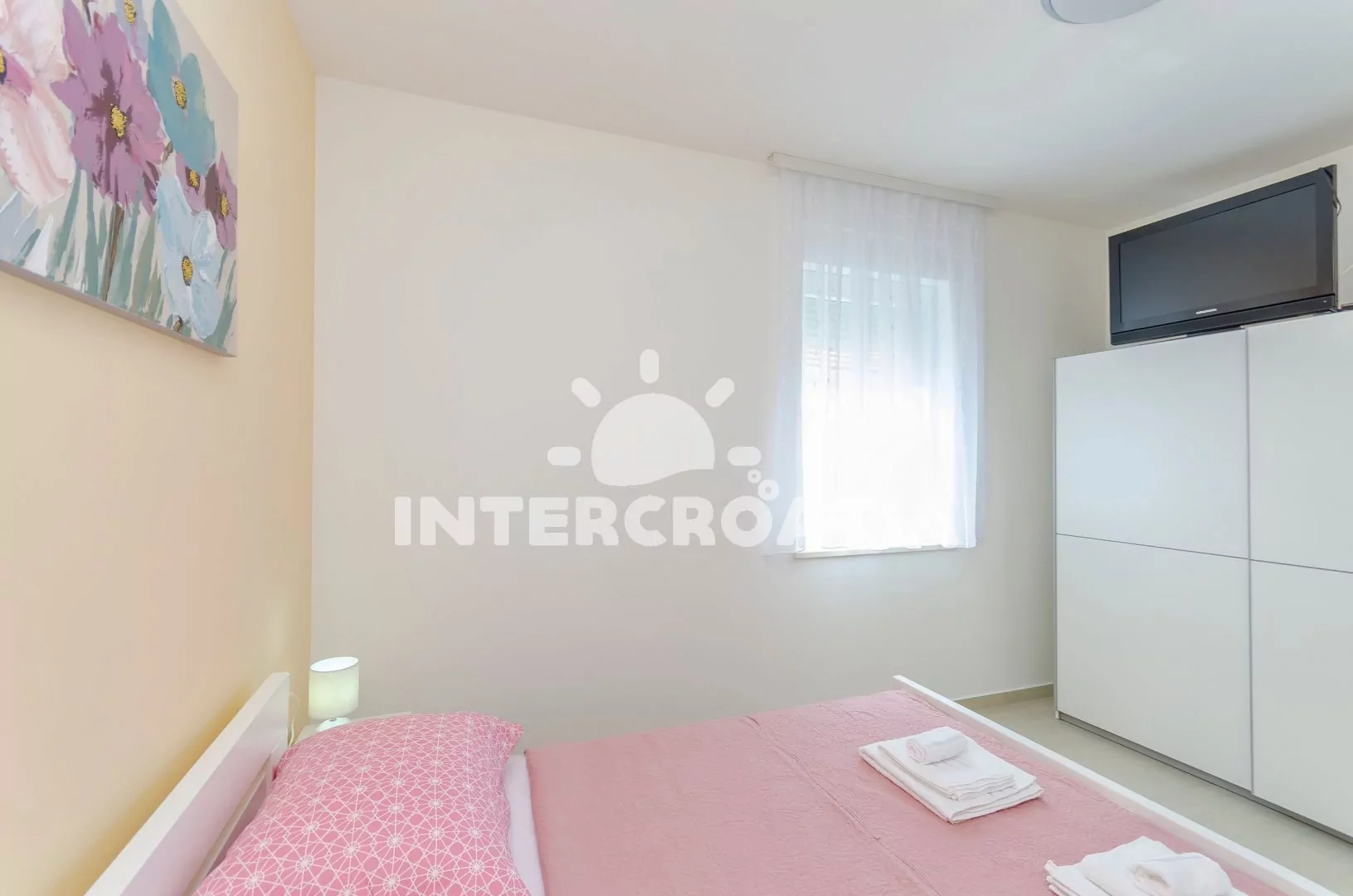 Světlý a moderně zařízený apartmán (80 m2), pro 4 až 5 osob s terasou a výhledem na moře se nachází v prvním patře vily. Obývací pokoj je spojený s kuchyní. Kuchyňská linka je vybavena sklokeramickou varnou deskou, vestavěnou troubou, myčkou na nádobí, rychlovarnou konvicí, nádobím a lednicí s mrazákem. Obývací pokoj s jídelním stolem pro 6 osob, rohovou pohovkou (rozložitelná na extra lůžko pro 1 osobu), televizí se satelitním programem, klimatizací a vstupem na terasu. První i druhá ložnice je vybavena vždy s jedním dvoulůžkem. Koupelna se sprchovým koutem, umyvadlem, fénem a wc. Dále samostatné wc s umyvadlem. Hostům je k dispozici parkování u objektu zdarma.