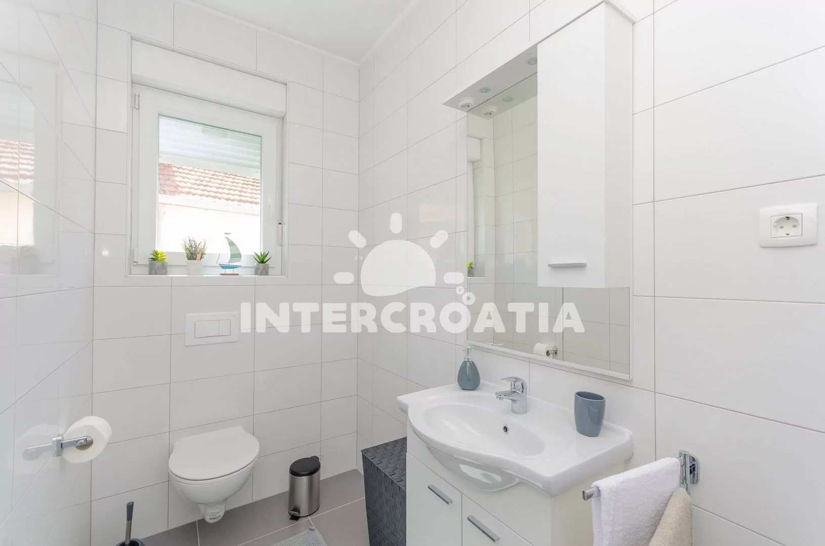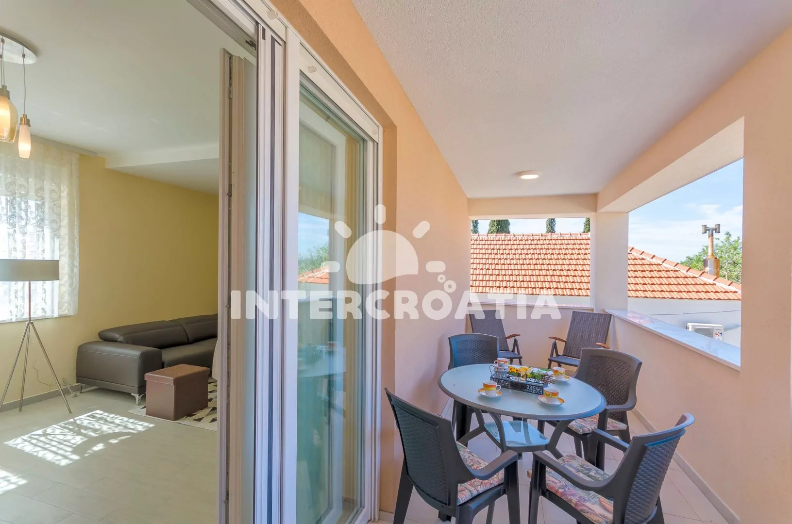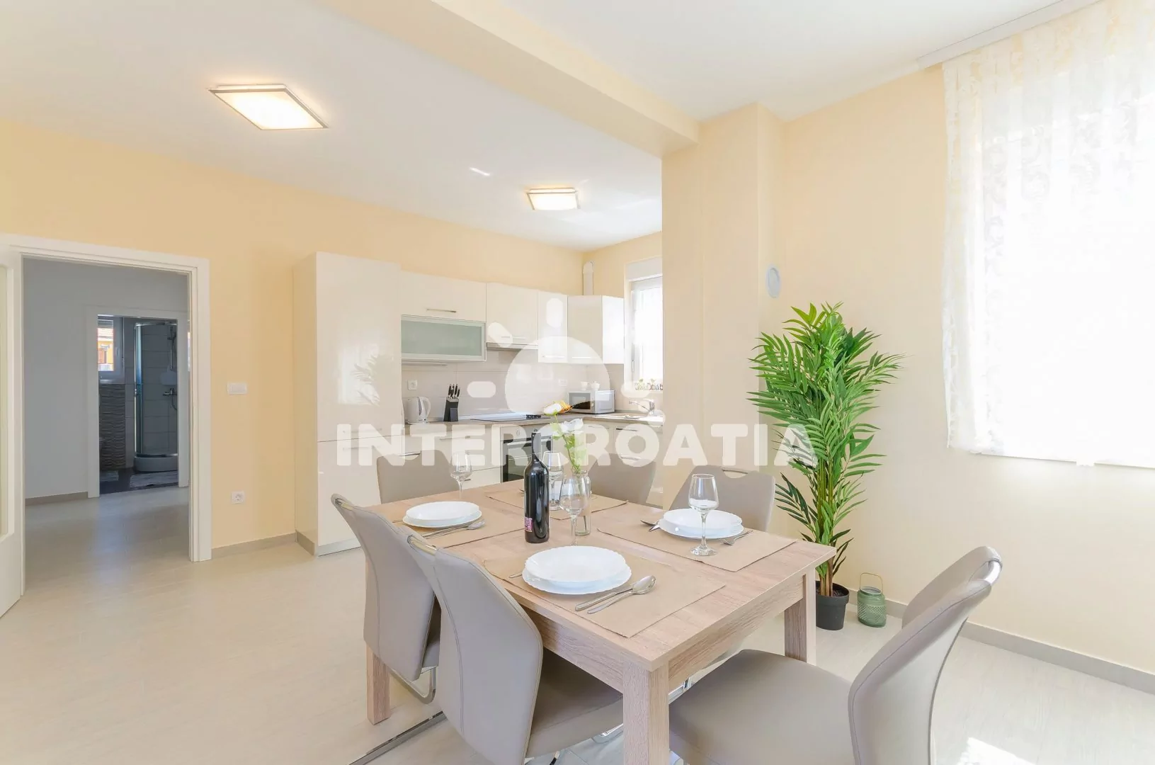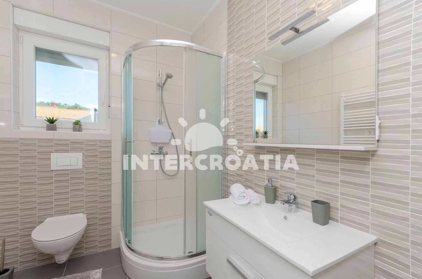 Světlý a moderně zařízený apartmán (80 m2), pro 4 až 5 osob s terasou a výhledem na moře se nachází v prvním patře vily. Obývací pokoj je spojený s kuchyní. Kuchyňská linka je vybavena sklokeramickou varnou deskou, vestavěnou troubou, myčkou na nádobí, rychlovarnou konvicí, nádobím a lednicí s mrazákem. Obývací pokoj s jídelním stolem pro 6 osob, rohovou pohovkou (rozložitelná na extra lůžko pro 1 osobu), televizí se satelitním programem, klimatizací a vstupem na terasu. První i druhá ložnice je vybavena vždy s jedním dvoulůžkem. Koupelna se sprchovým koutem, umyvadlem, fénem a wc. Dále samostatné wc s umyvadlem. Hostům je k dispozici parkování u objektu zdarma.