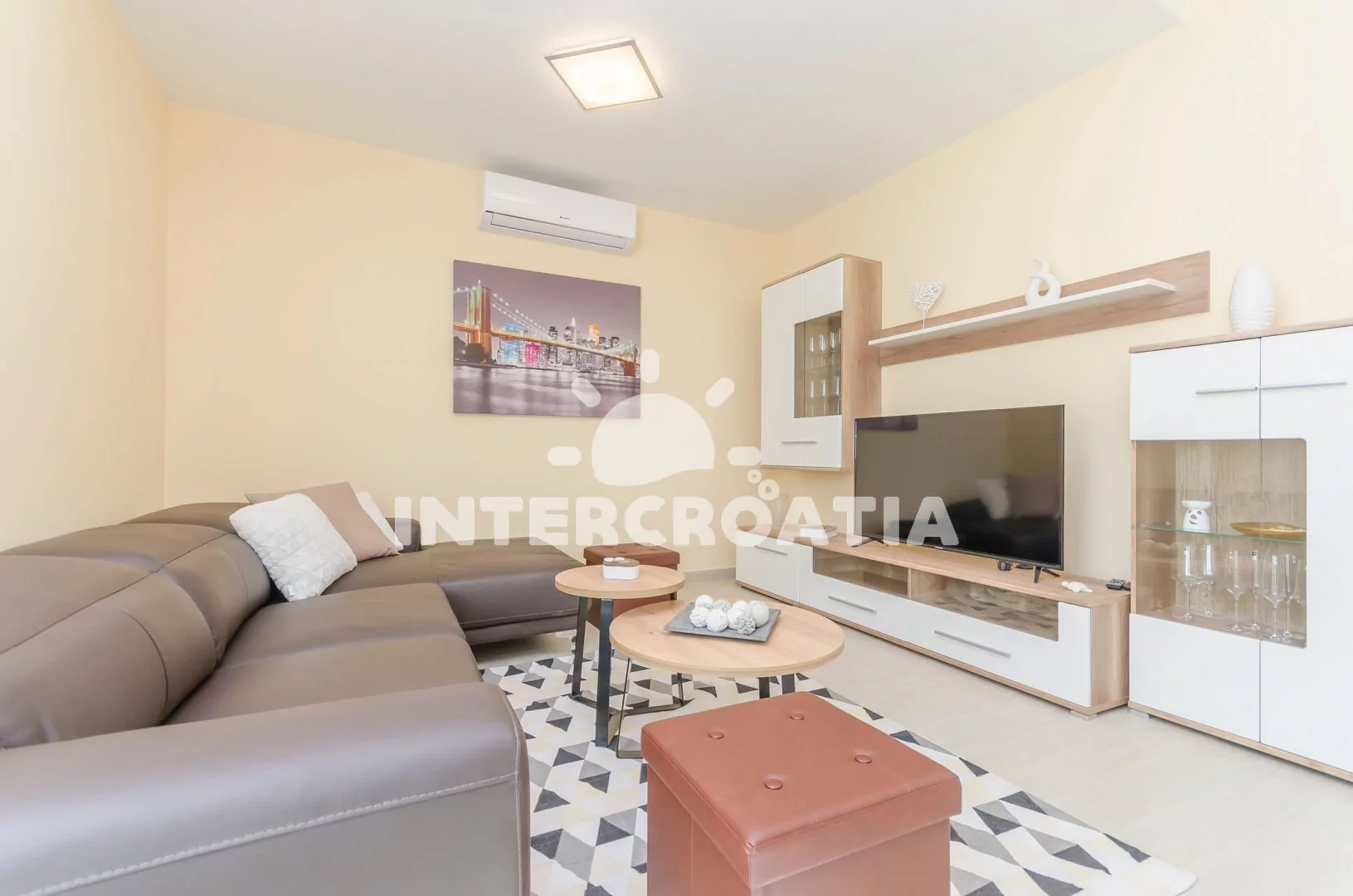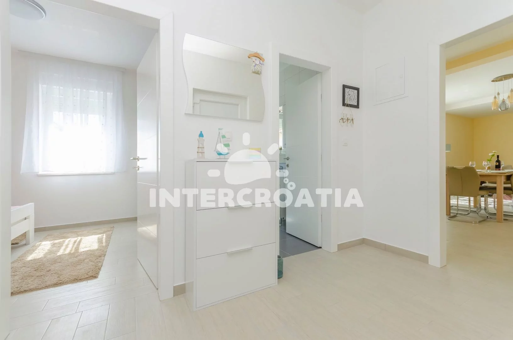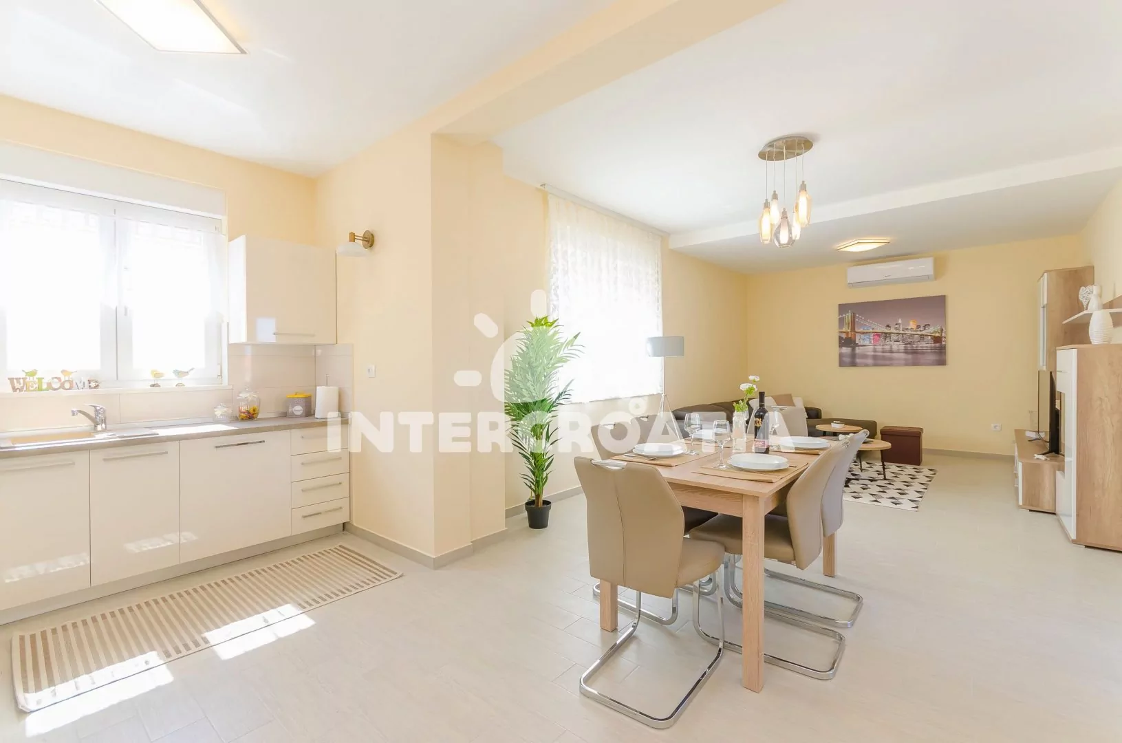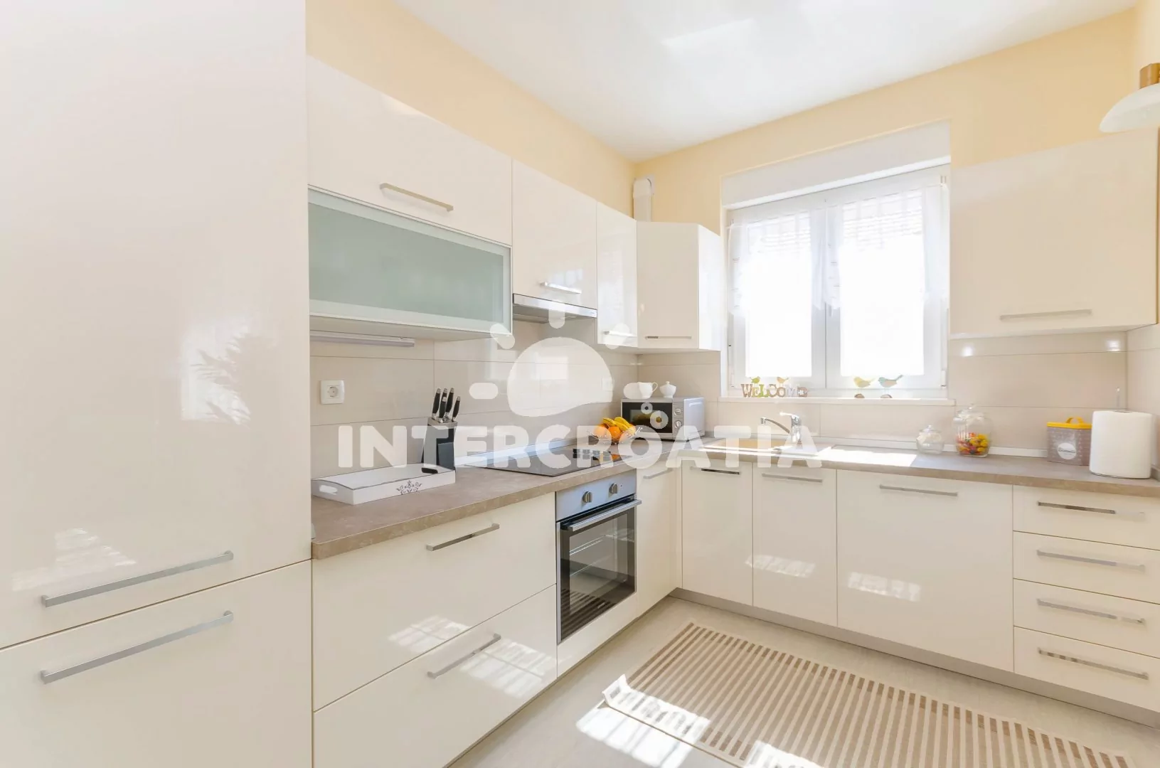 Světlý a moderně zařízený apartmán (80 m2), pro 4 až 5 osob s terasou a výhledem na moře se nachází v prvním patře vily. Obývací pokoj je spojený s kuchyní. Kuchyňská linka je vybavena sklokeramickou varnou deskou, vestavěnou troubou, myčkou na nádobí, rychlovarnou konvicí, nádobím a lednicí s mrazákem. Obývací pokoj s jídelním stolem pro 6 osob, rohovou pohovkou (rozložitelná na extra lůžko pro 1 osobu), televizí se satelitním programem, klimatizací a vstupem na terasu. První i druhá ložnice je vybavena vždy s jedním dvoulůžkem. Koupelna se sprchovým koutem, umyvadlem, fénem a wc. Dále samostatné wc s umyvadlem. Hostům je k dispozici parkování u objektu zdarma.