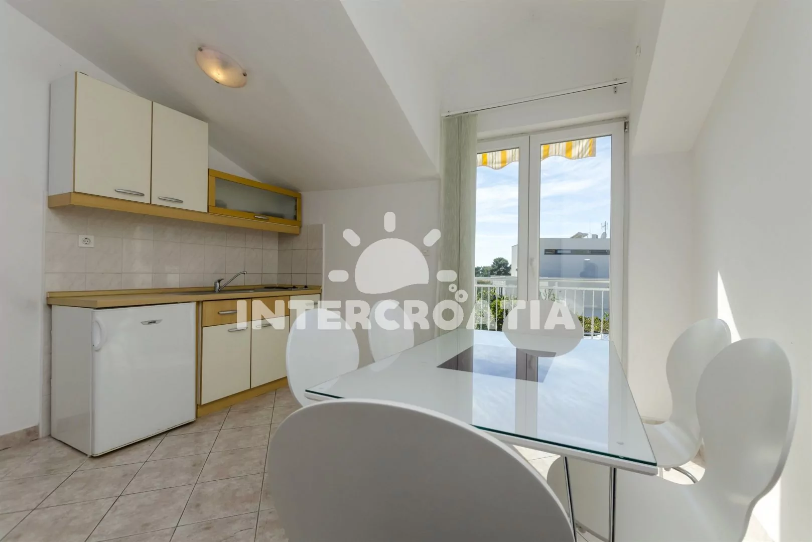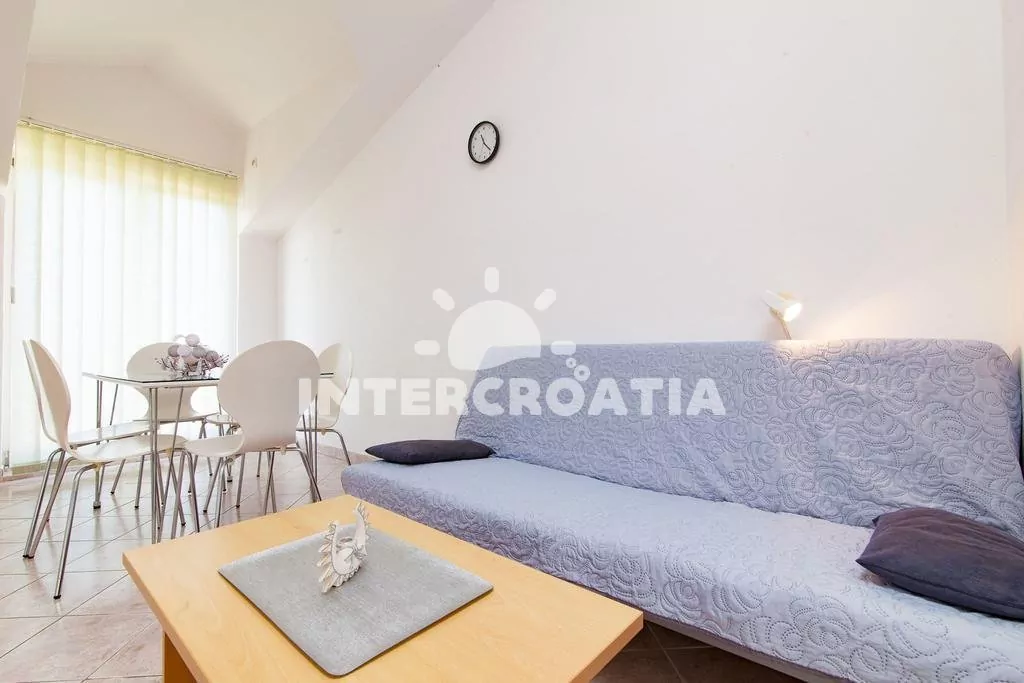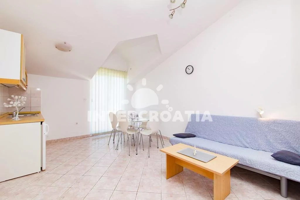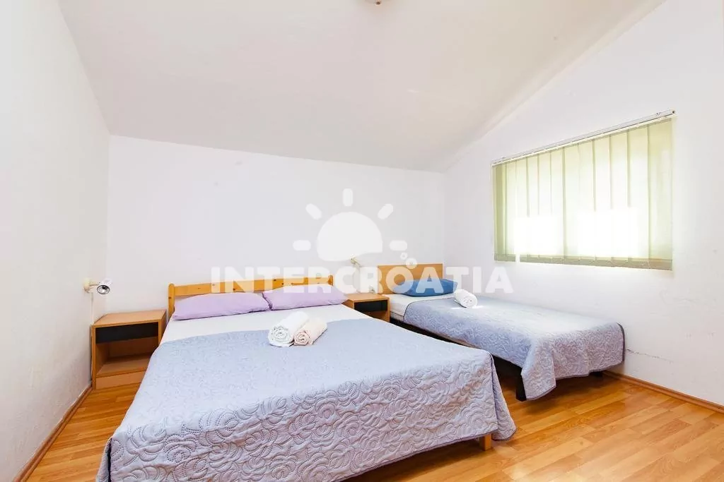 Apartmán s vlastním balkonem se nachází v prvním patře domu a je vhodný pro 2 až 4 osoby. Obývací pokoj je spojený s kuchyní. Kuchyňská linka je vybavena dvouplotýnkovým sporákem, rychlovarnou konvicí, kávovarem, nádobím a lednicí s mrazákem. Obývací pokoj s jídelním stolem pro 6 osob, sedací soupravou, pohovkou (rozložitelná na extra lůžko pro 1 osobu), televizí se satelitním programem, klimatizací a vstupem na balkon. Ložnice s jedním dvoulůžkem a jedním jednolůžkem. Koupelna se sprchovým koutem, umyvadlem, bidetem a wc. Hostům je k dispozici parkování u objektu zdarma.