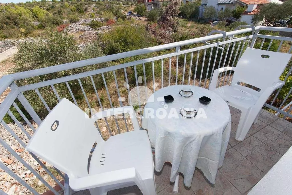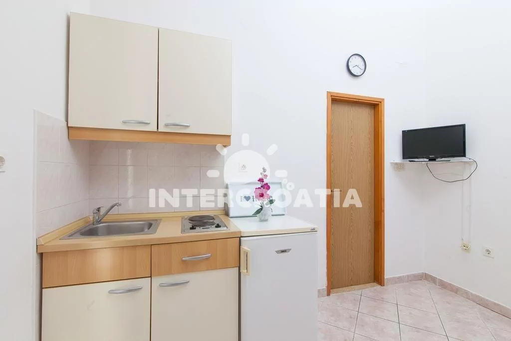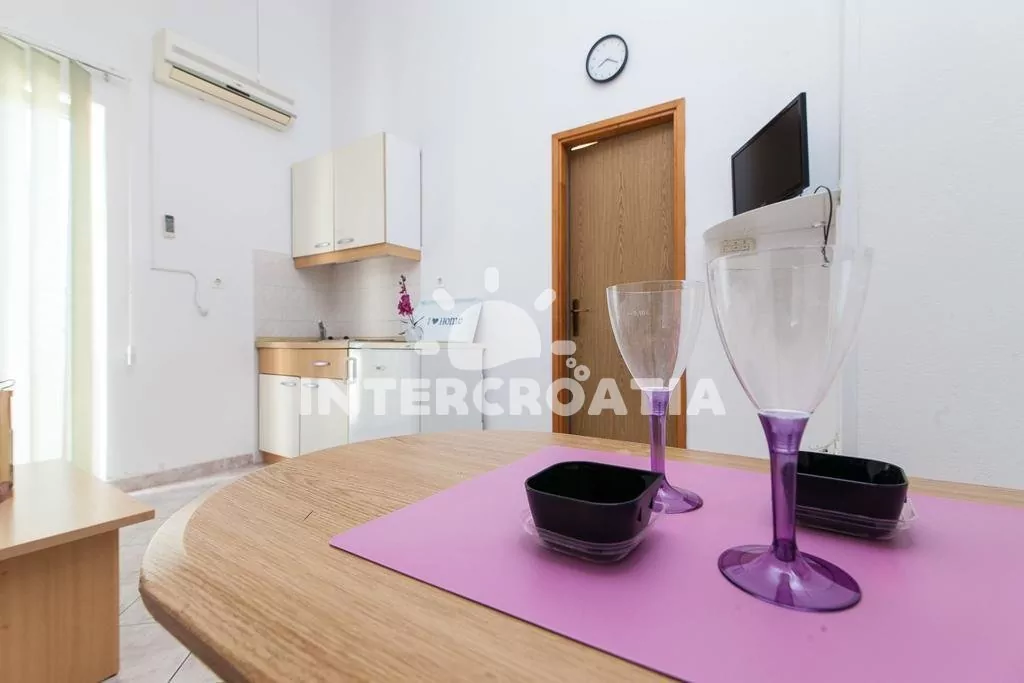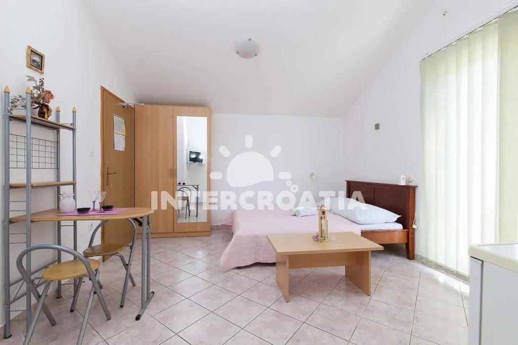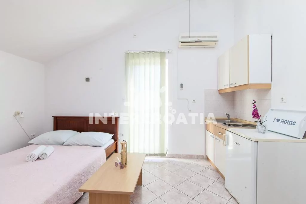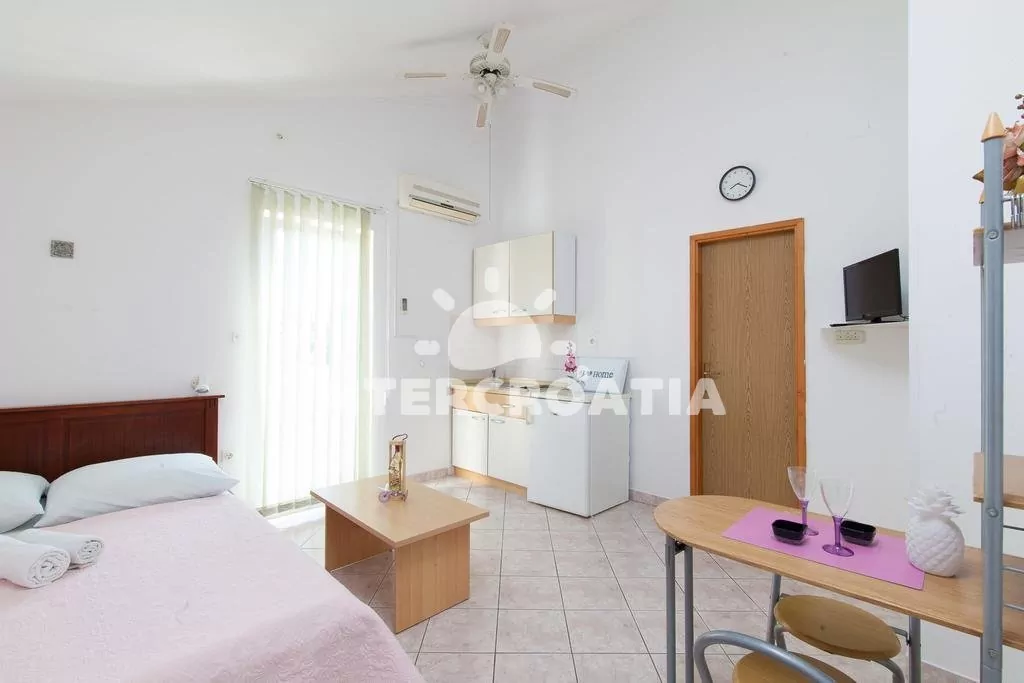 Apartmán typu studio s vlastním balkonem se nachází v prvním patře domu a je vhodný pro 2 osoby. Obývací pokoj je spojený s kuchyní. Kuchyňská linka je vybavena dvouplotýnkovým sporákem, nádobím a lednicí s mrazákem. Obývací pokoj s jídelním stolem pro 2 osoby, televizí se satelitním programem, jedním dvoulůžkem, klimatizací a vstupem na balkon. Koupelna se sprchovým koutem, umyvadlem, bidetem a wc. Hostům je k dispozici parkování u objektu zdarma.