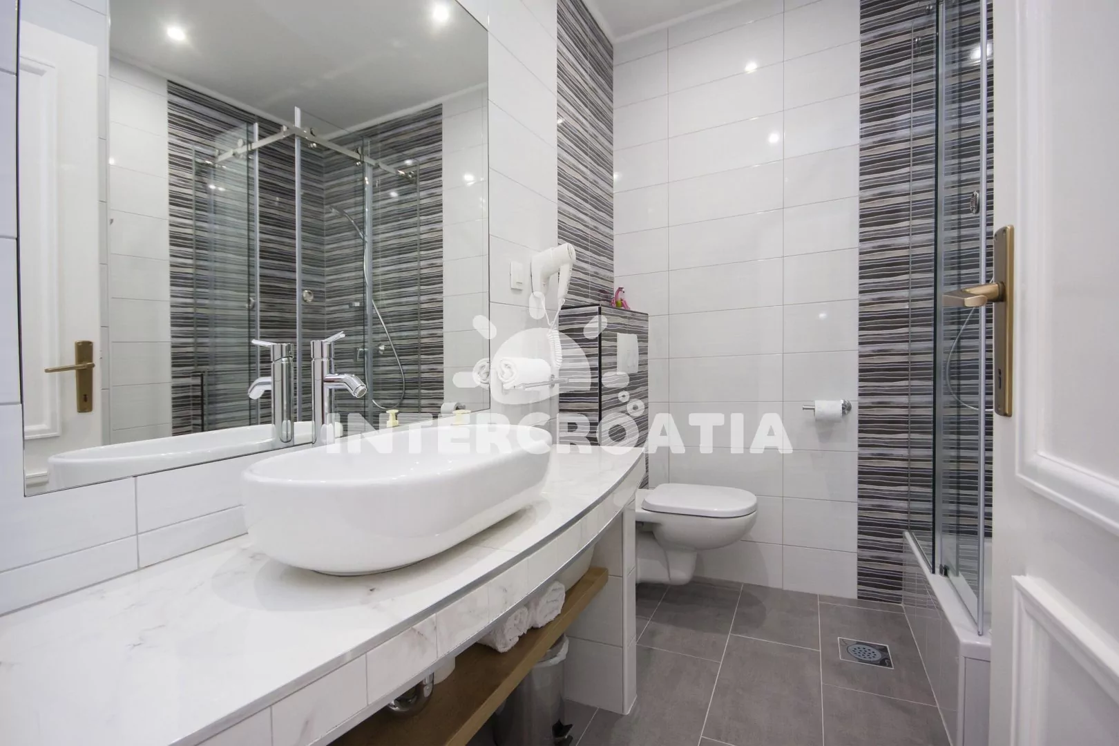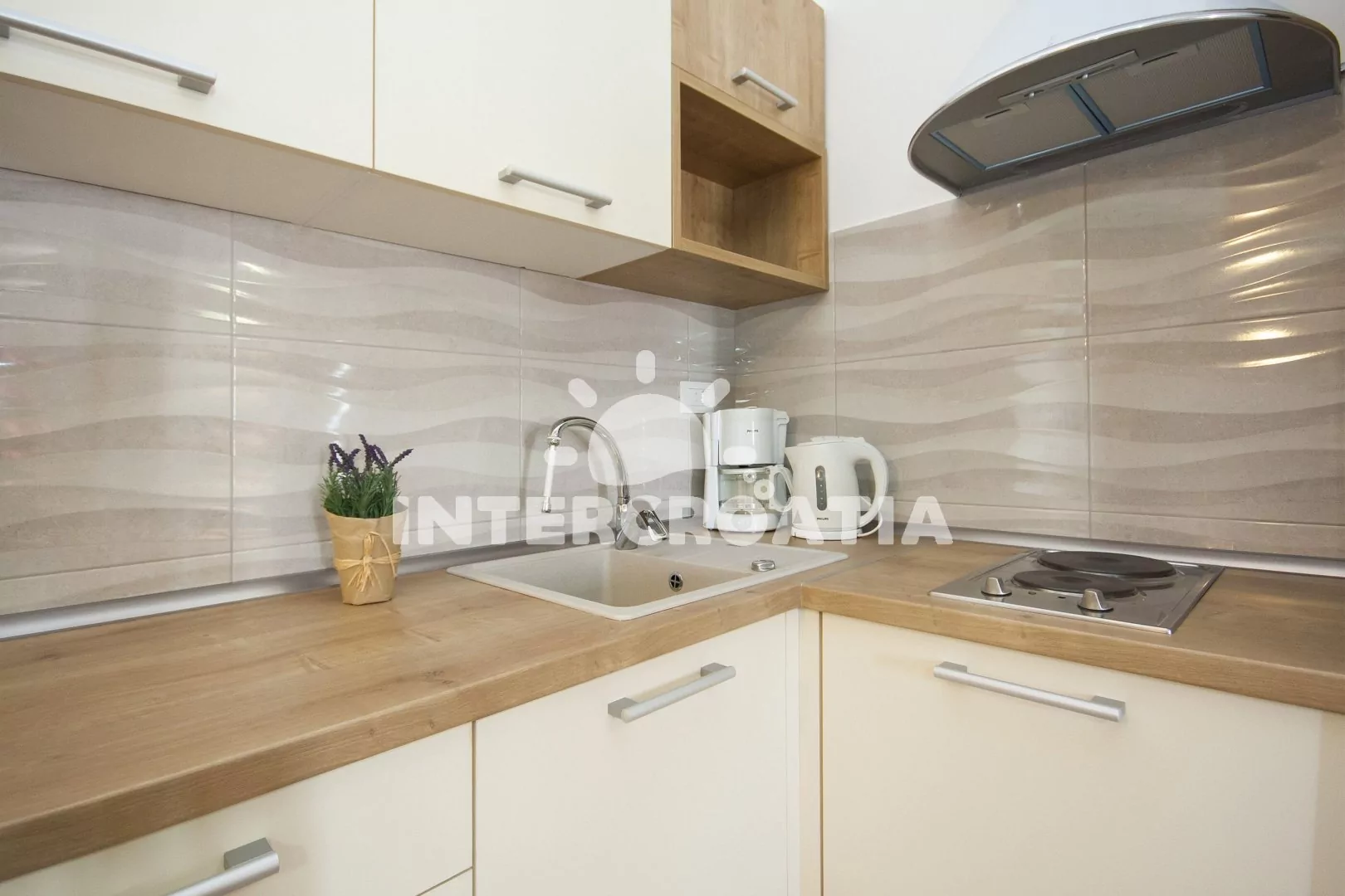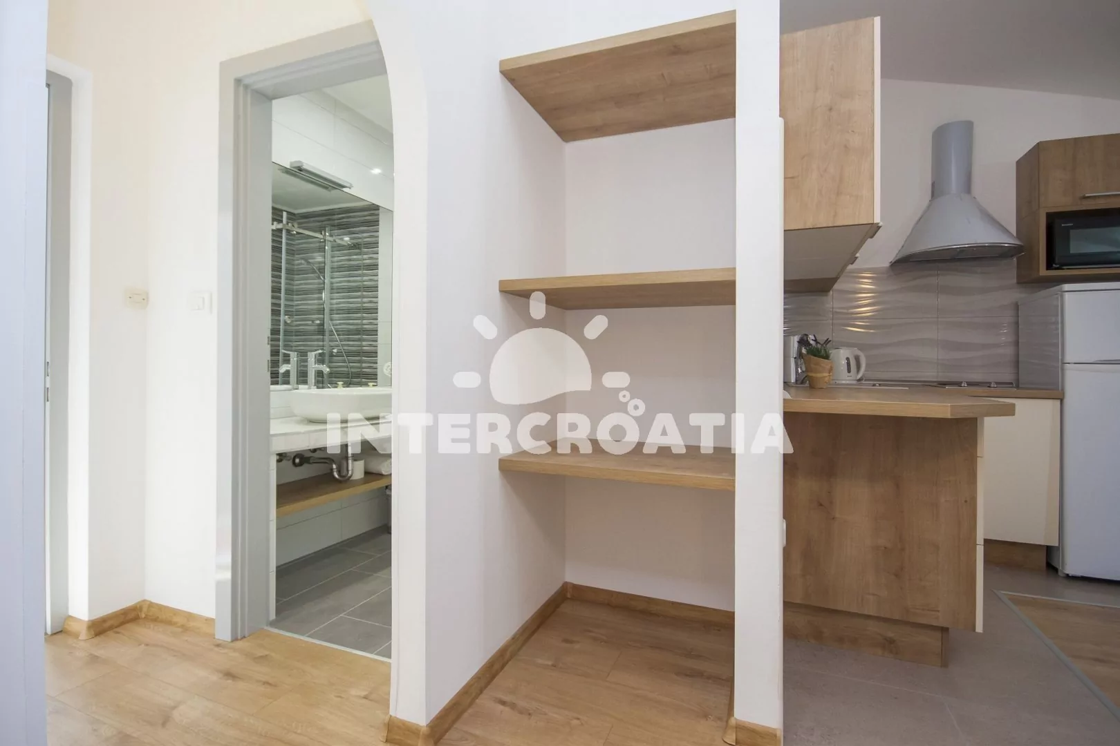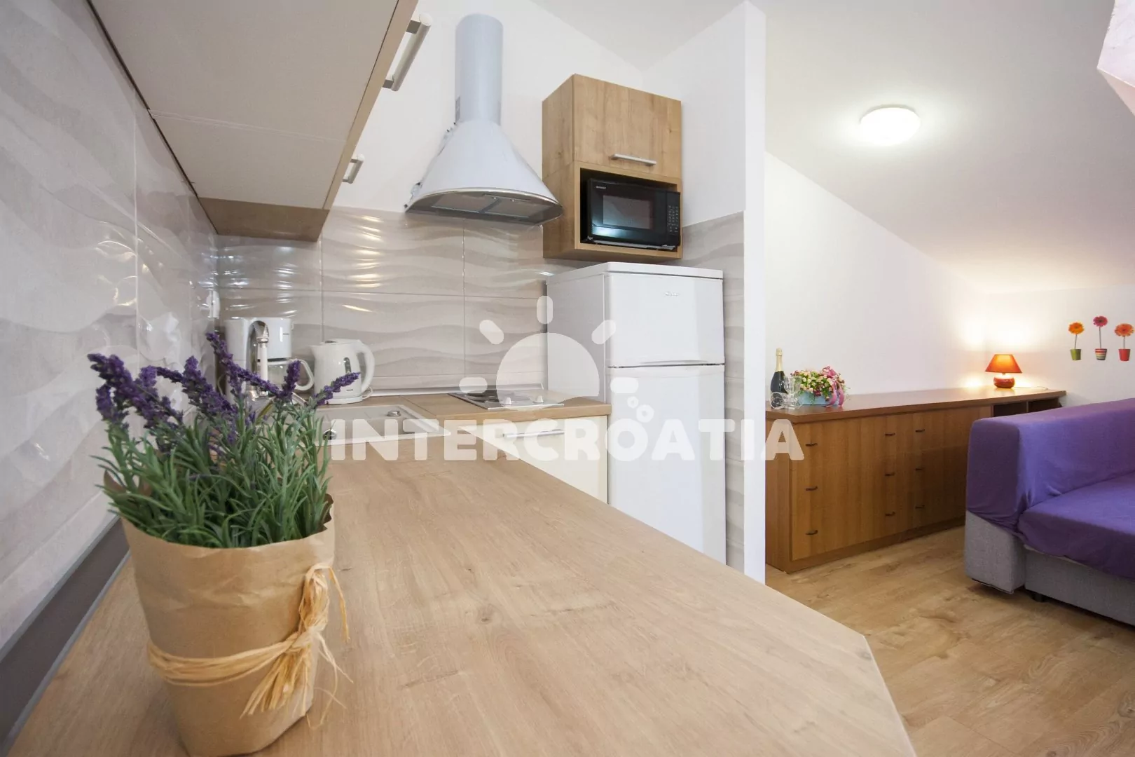 Vzdálenosti: Moře a oblázková pláž s betonovými moly 120 m, centrum 350 m, ambulance 4 km, supermarket 350 m, restaurace a bar 100 m, veřejná doprava 350 m, lékárna 350 m, pošta 300 m, směnárna 100 m, banka a čerpací stanice 6 km, park Plitvice 16 km, letiště (Split) 50 km, trajekt 80 km.