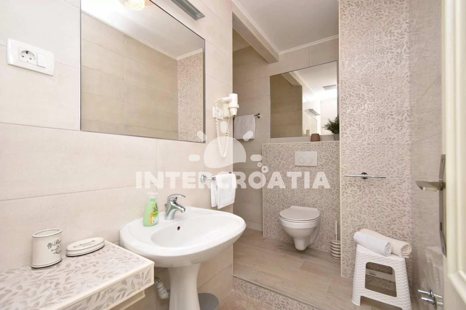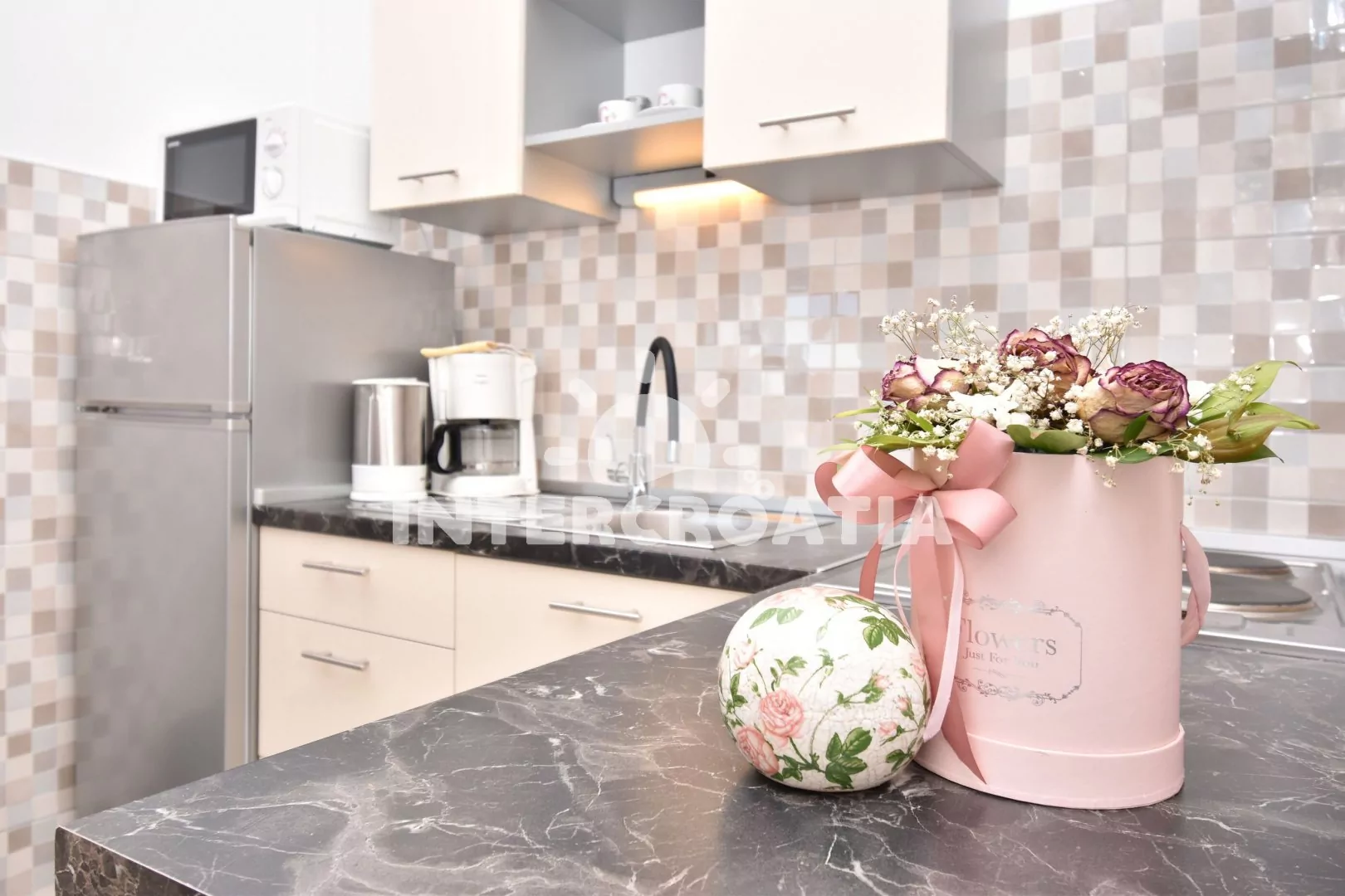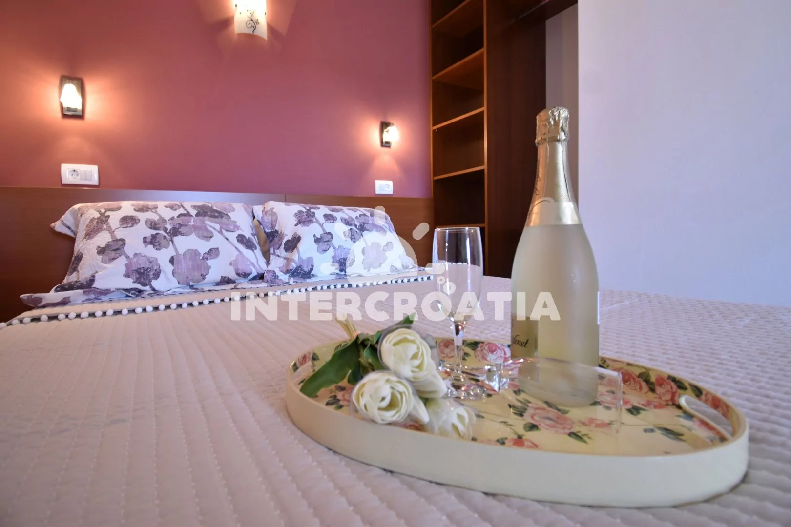 Apartmán typu studio (25 m2) s balkonem, venkovním posezením a výhledem na moře se nachází ve 2. patře domu. Obývací místnost je spojena s kuchyní. Kuchyňská linka je vybavena varnou deskou, digestoří, mikrovlnnou troubou, rychlovarnou konvicí, kávovarem, nádobím a lednicí s mrazákem. Obývací místnost s pohovkou, televizí se satelitním programem, dvoulůžkem, klimatizací a vstupem na balkon. Koupelna se sprchovým koutem, umyvadlem, pračkou a wc. Hostům je k dispozici parkování u objektu zdarma.