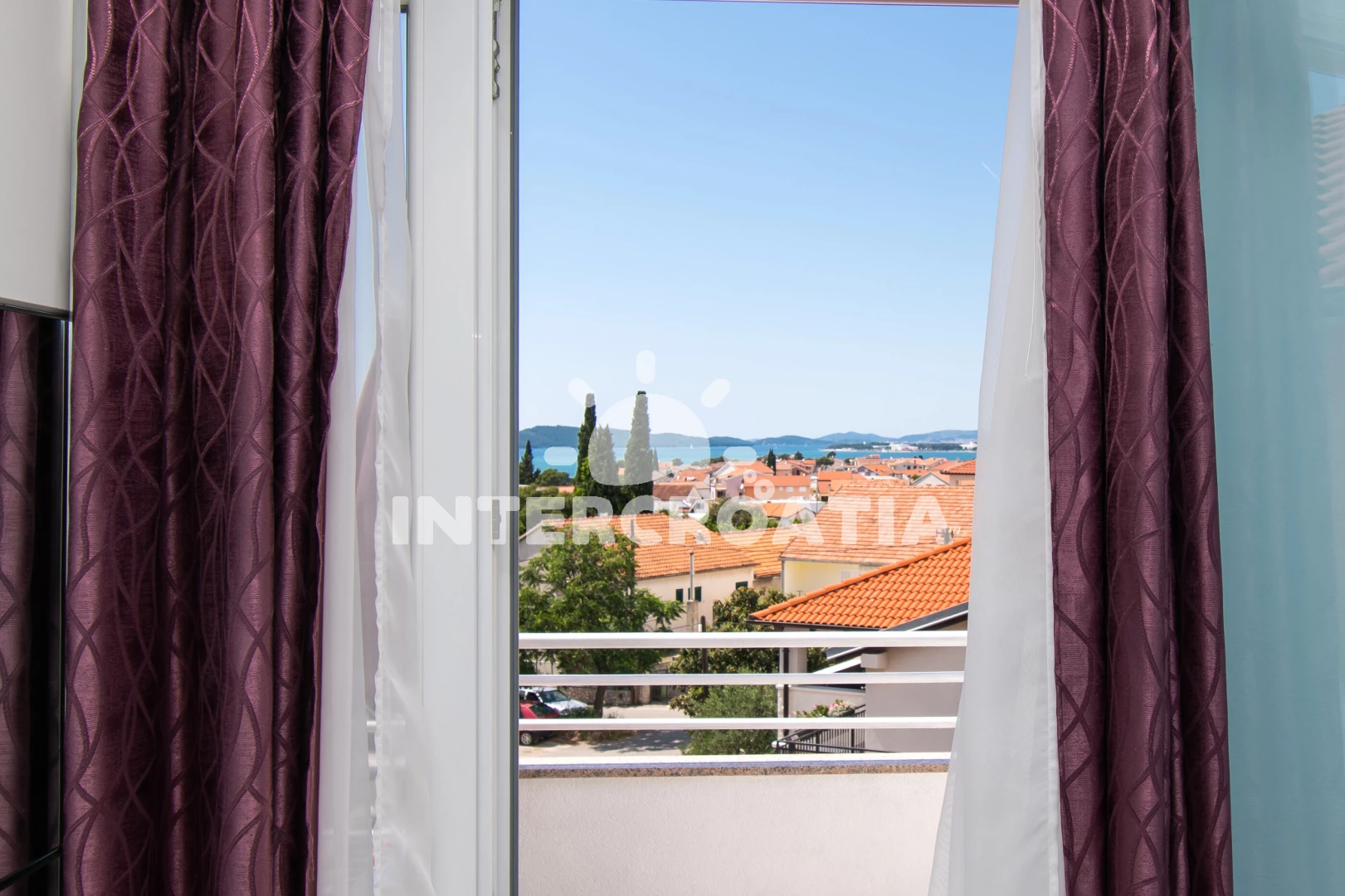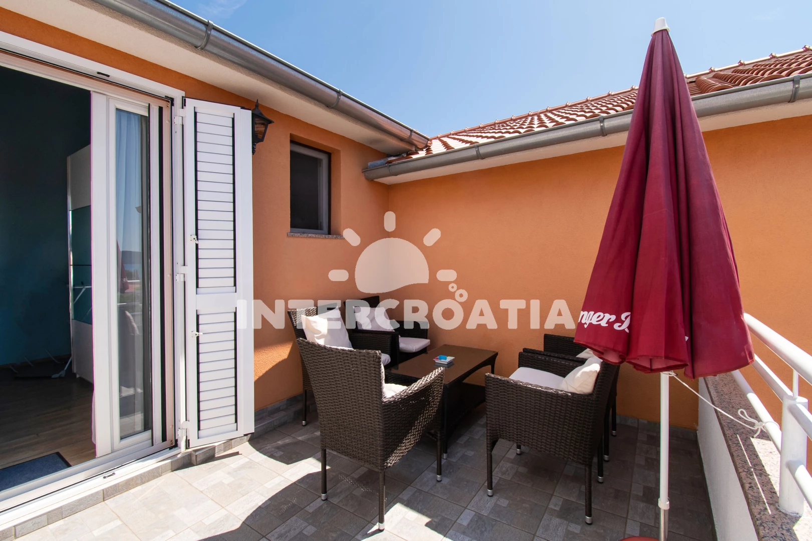 Prostorný apartmán (120 m2) s terasou, částečným výhledem na moře a venkovním posezením se nachází ve 2. patře domu. Apartmán má 2 ložnice, 2 koupelny a je vhodný pro 4 až 6 osob. Obývací pokoj je spojený s kuchyní. Kuchyňská linka je vybavena varnou deskou, vestavěnou troubou, digestoří, myčkou na nádobí, kávovarem, nádobím a lednicí s mrazákem. Obývací pokoj s jídelním stolem, pohovkou (rozložitelná na extra lůžko pro 2 osoby), televizí, rádiem a klimatizací. První ložnice s jedním dvoulůžkem. Druhá ložnice s dvěma jednolůžky. První i druhá koupelna se sprchovým koutem, umyvadlem a wc. Hostům je k dispozici parkování u objektu zdarma.