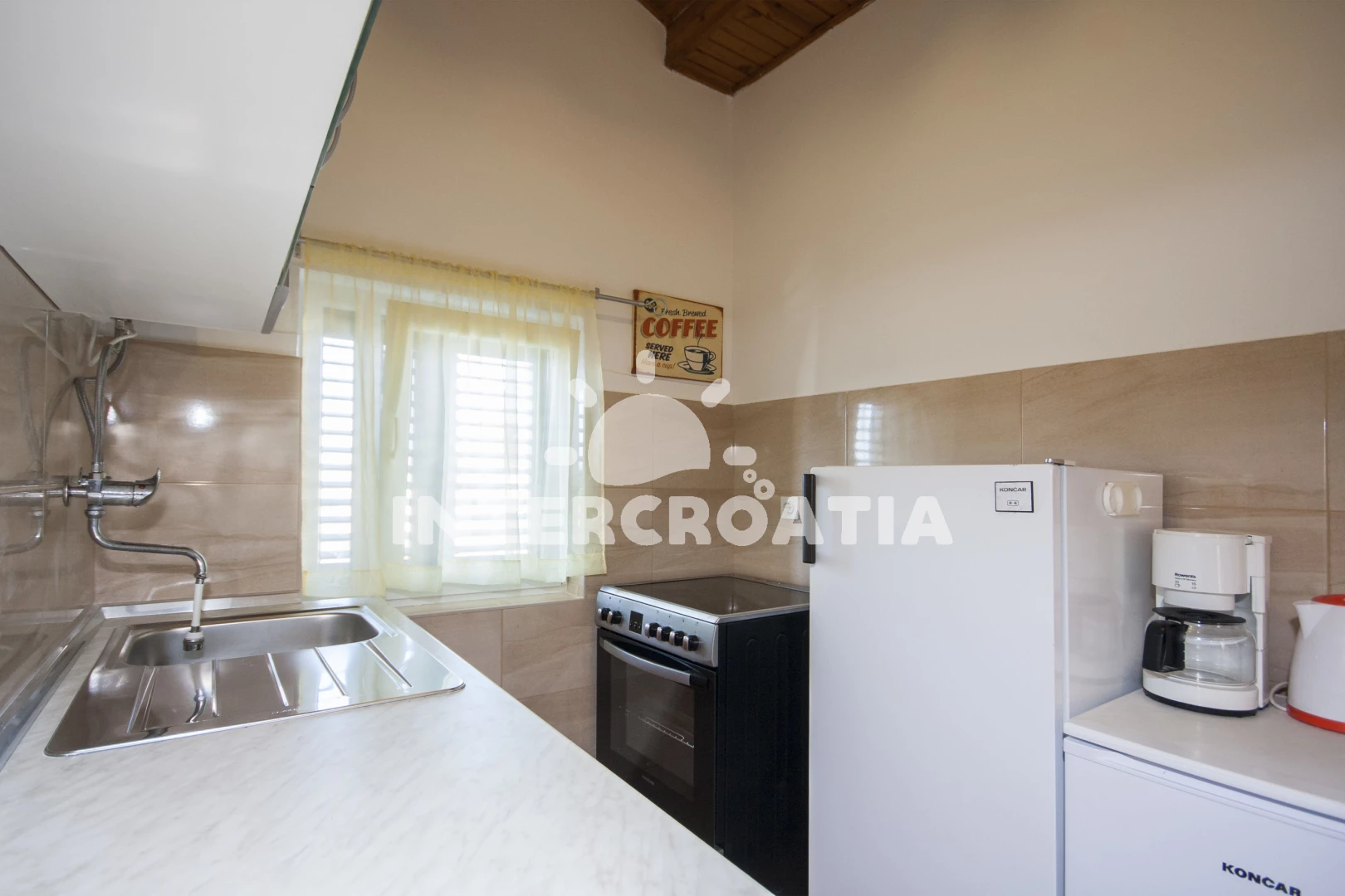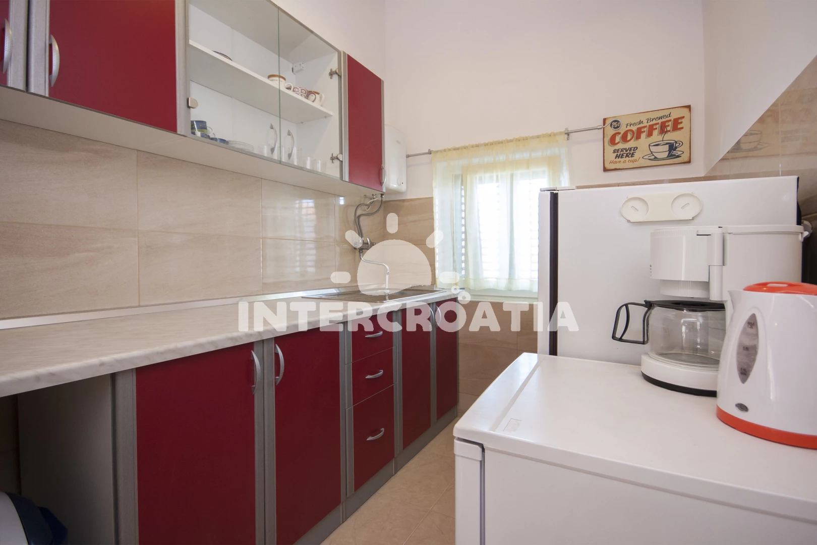 Vzdálenosti: Moře 50 m, pláž 70 m (oblázková a betonové desky), veřejná doprava 50 m, kotviště pro čluny 50 m, bar 50 m, restaurace 100 m, supermarket 300 m, půjčovna motorových člunů 600 m, půjčovna kol 600 m, centrum 700 m, směnárna 700 m, ambulance 700 m, pošta 700 m, lékárna 800 m, potápění 1 km, čerpací stanice 4 km, mini golf 6 km, banka 6 km, tenisové kurty 6 km, diskotéka 6 km, marina 6 km, muzeum 8 km, trajekt (Šibenik) 8 km, letiště (Split) 60 km,