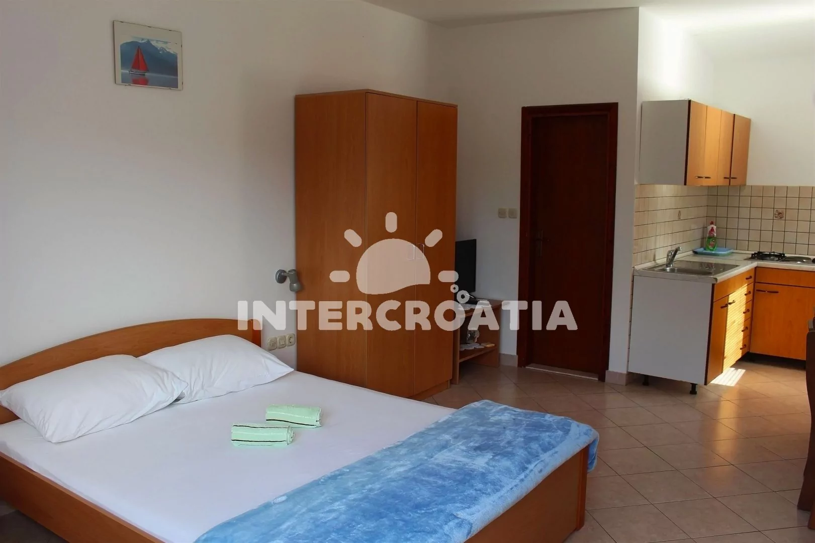 Apartmán typu studio pro 2 až 3 osoby se nachází v prvním patře domu. Rohová kuchyň s vybavením, obývací část s jídelním stolem, televizí se satelitem, rozkládací pohovkou (extra lůžko pro 3 osobu), šatní skříní a dvoulůžkem. Koupelna se sprchovým koutem, umyvadlem a wc. K dispozici WiFi, klimatizace, radio. Dětská postýlka, žehlička a fén (pouze po předchozí domluvě s agenturou).