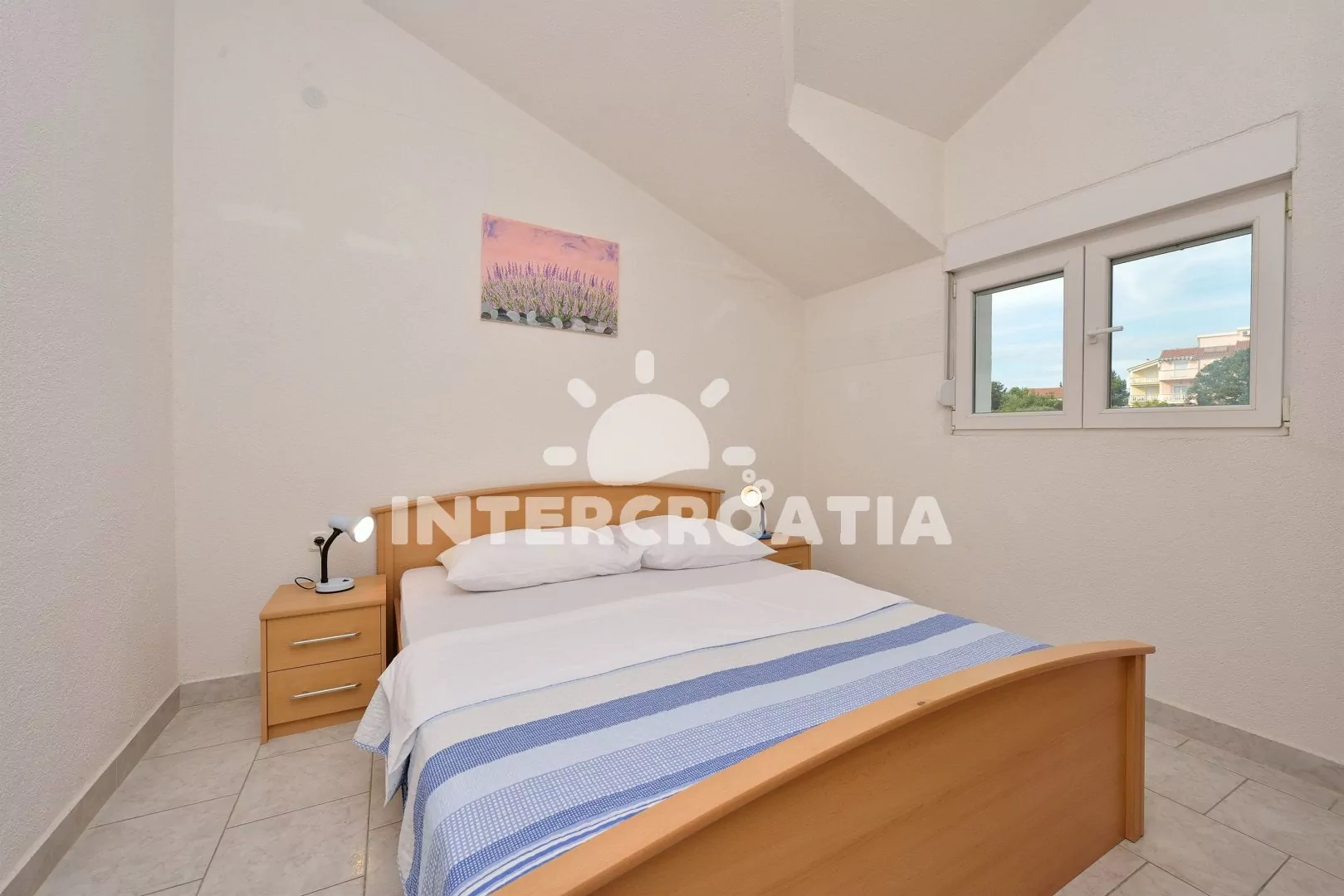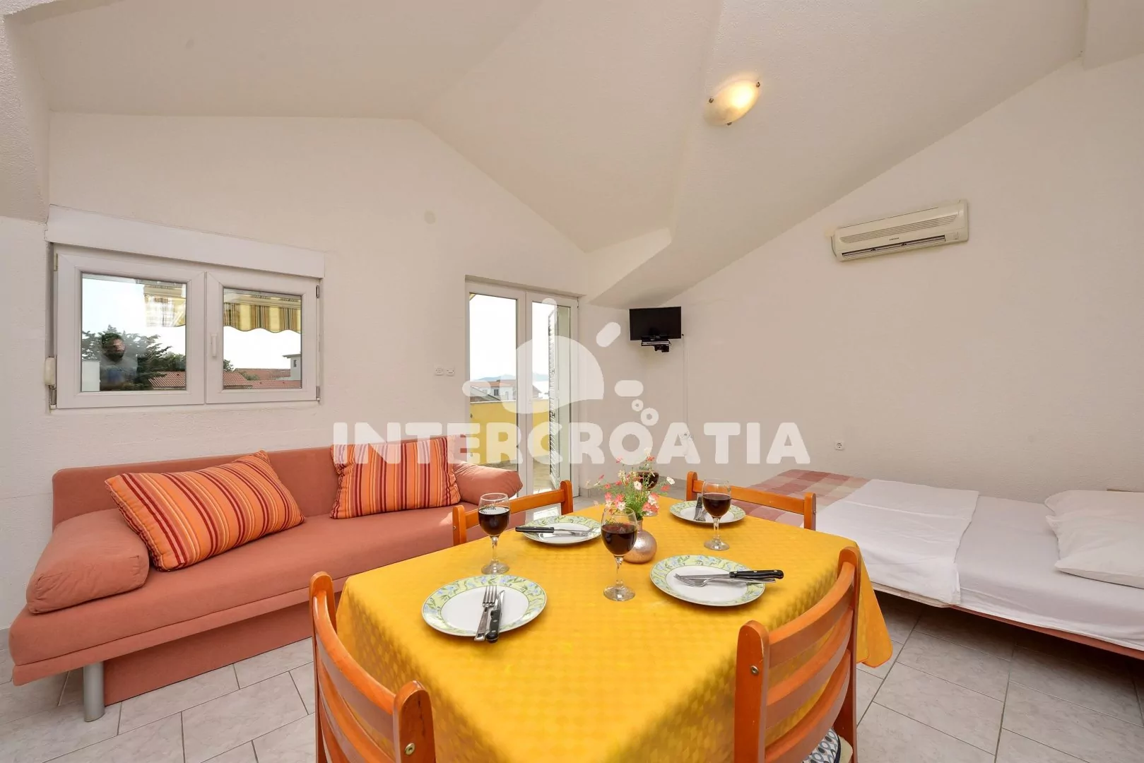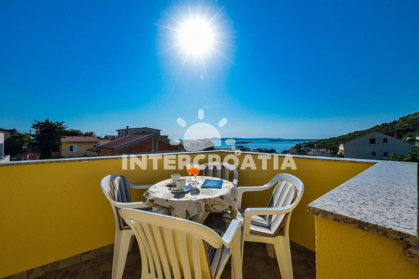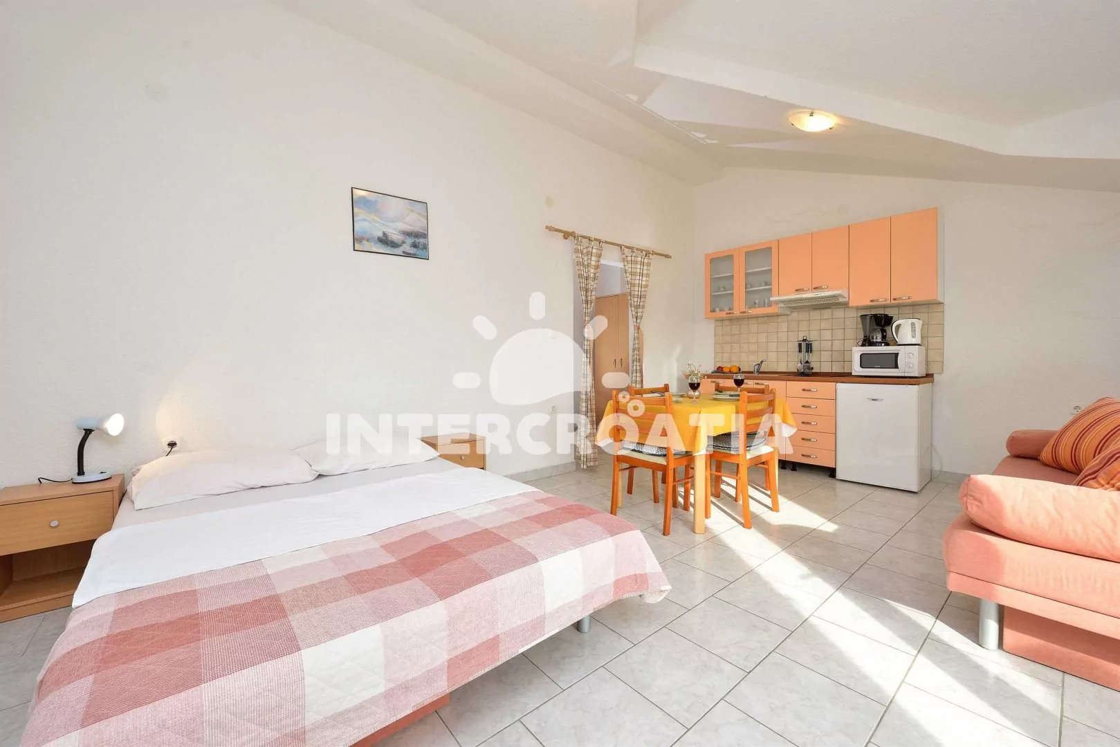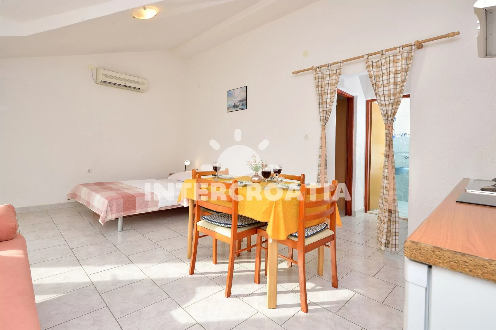 Apartmán v druhém patře domu s vlastní terasou, výhledem na moře je vhodný pro až 4 osoby. Obývací pokoj je spojený s kuchyní. Kuchyňská linka je vybavena dvouplotýnkovým sporákem, digestoří, mikrovlnnou troubou, rychlovarnou konvicí, nádobím a lednicí s mrazákem. Obývací pokoj s jídelním stolem pro 4 osoby, pohovkou, dvěma přistýlkami, televizí se satelitním programem. klimatizací a vstupem na terasu. Ložnice je vybavena jedním dvoulůžkem. Koupelna se sprchovým koutem, umyvadlem a wc. Hostům je k dispozici parkování u objektu zdarma.