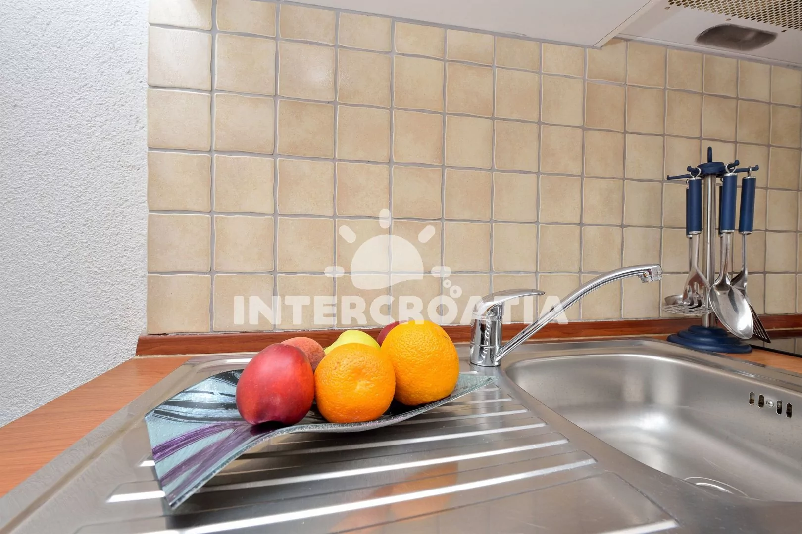 Apartmán v druhém patře domu s vlastní terasou, výhledem na moře je vhodný pro až 4 osoby. Obývací pokoj je spojený s kuchyní. Kuchyňská linka je vybavena dvouplotýnkovým sporákem, digestoří,…