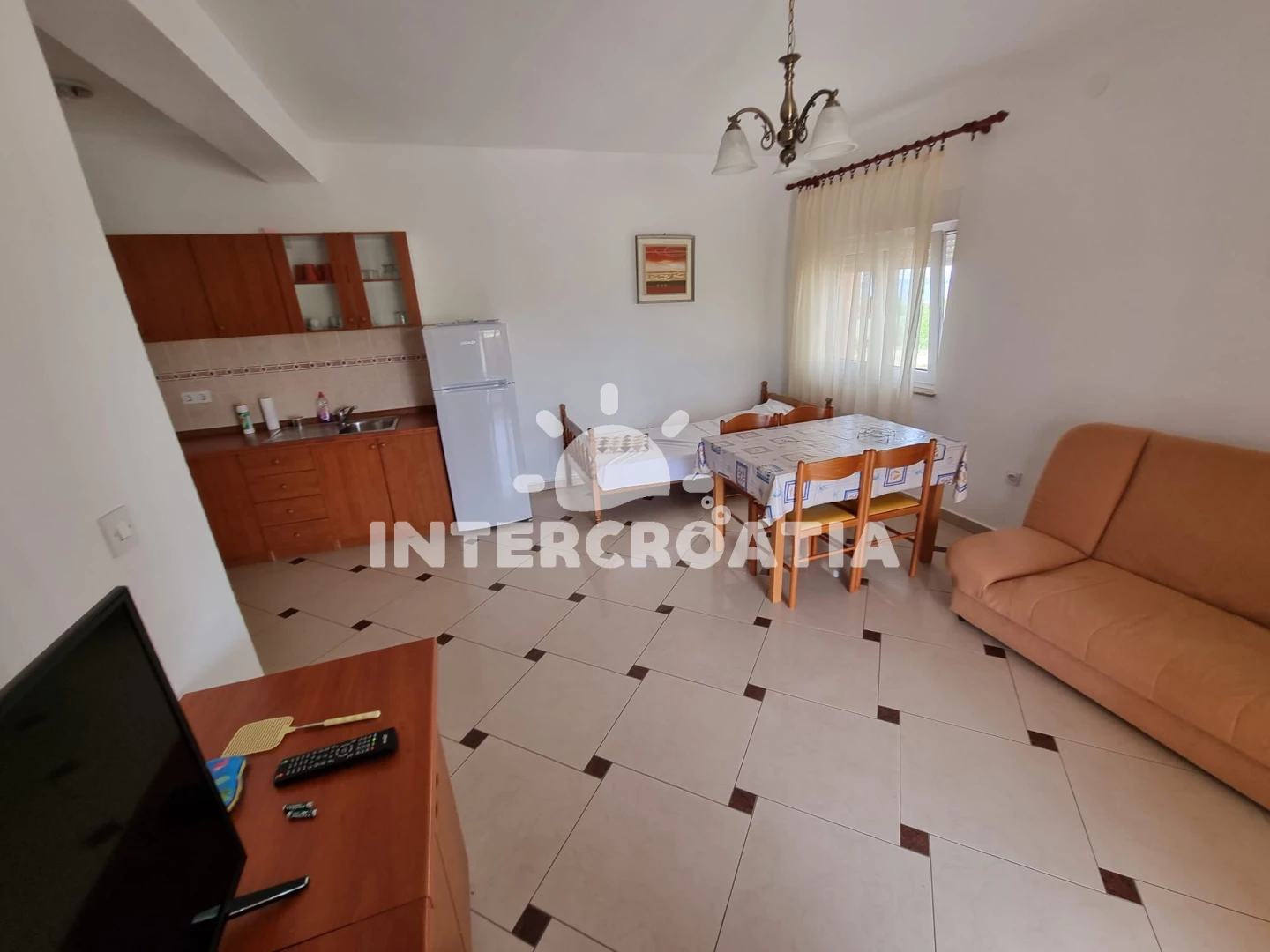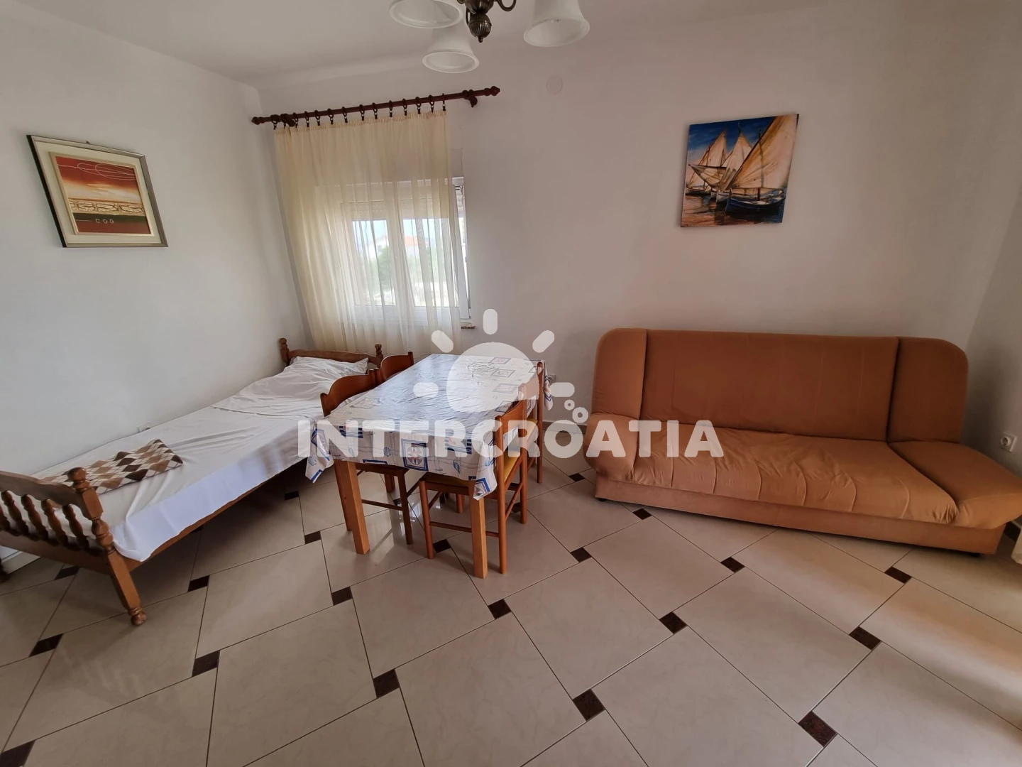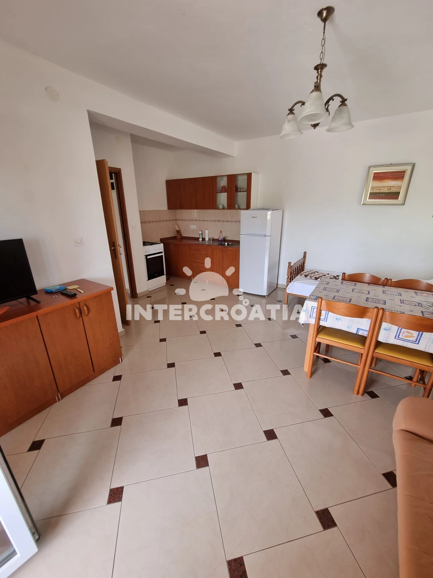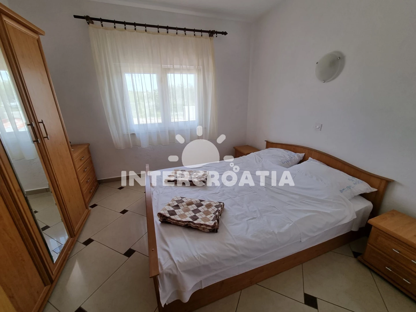 Vzdálenosti: Moře a oblázková-betonová pláž 500 m, velká oblázková pláž Porat 950 m, restaurace, supermarket, veřejná doprava a lékárna 250 m, centrum 500 m, diskotéka 1 km, čerpací stanice 4 km, banka 5 km, trajekt (Biograd) 10 km, letiště (Zadar) 30 km.