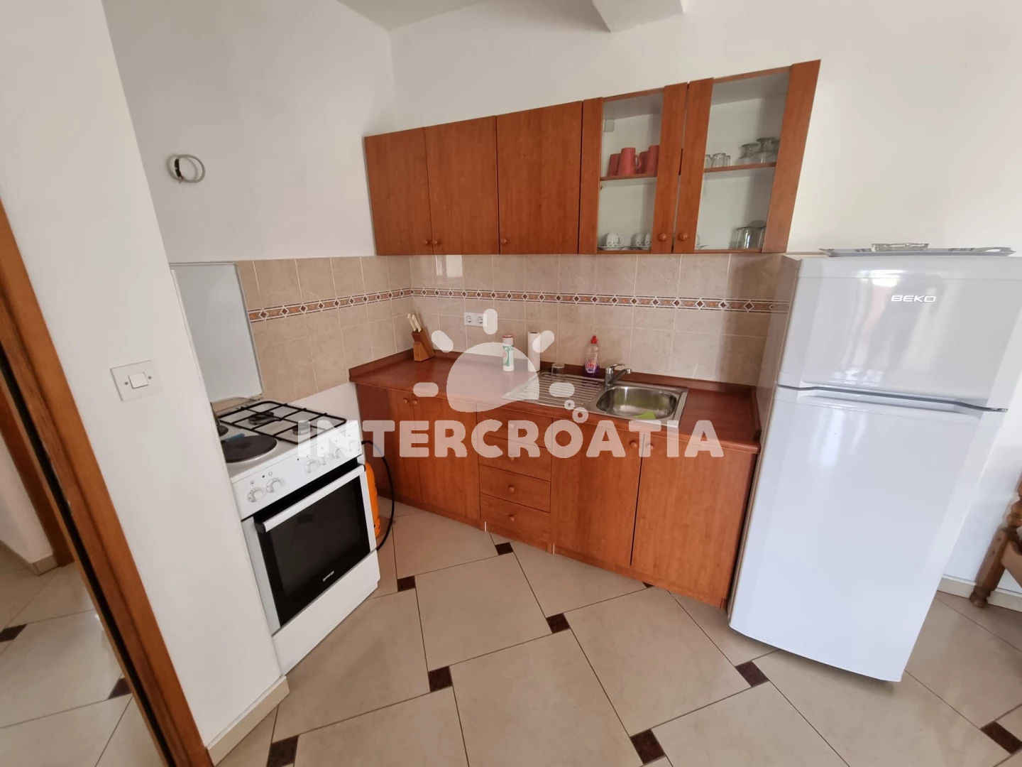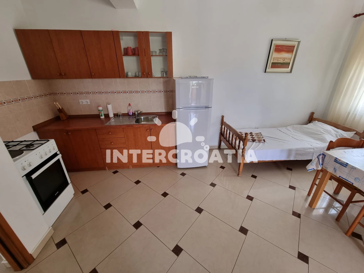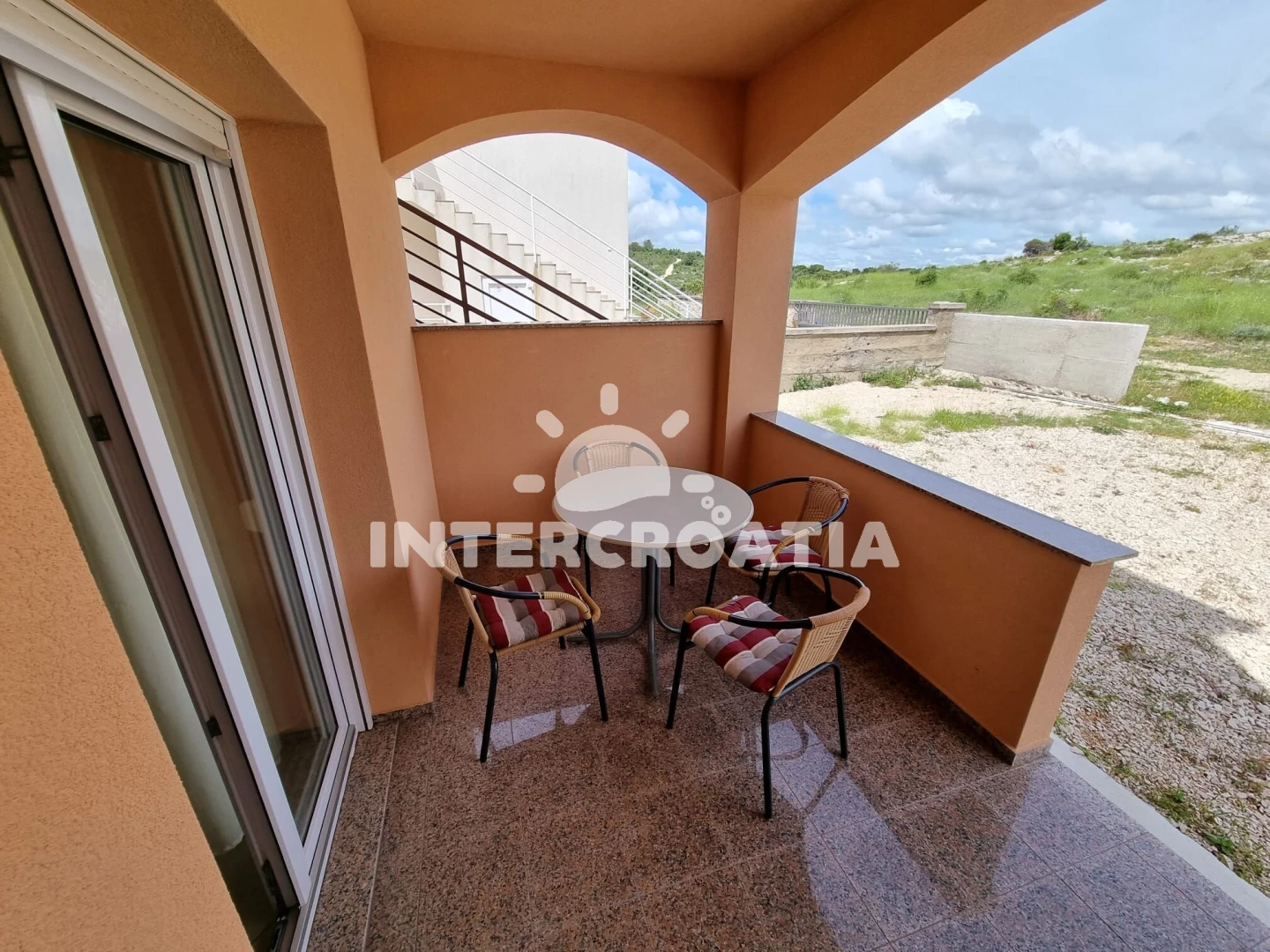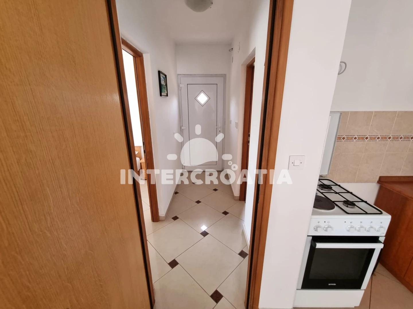 Vzdálenosti: Moře a oblázková-betonová pláž 500 m, velká oblázková pláž Porat 950 m, restaurace, supermarket, veřejná doprava a lékárna 250 m, centrum 500 m, diskotéka 1 km, čerpací stanice 4 km, banka 5 km, trajekt (Biograd) 10 km, letiště (Zadar) 30 km.