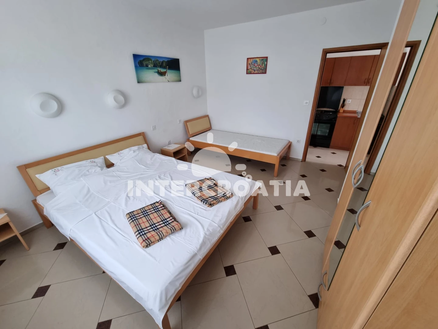 Apartmán (45 m2) s balkonem, venkovním posezením a výhledem na moře se nachází v 1. patře domu. Apartmán má 1 ložnici a je vhodný pro až 4 osoby. Obývací pokoj je spojený s kuchyní. Kuchyňská linka je vybavena sporákem s troubou, rychlovarnou konvicí, nádobím a lednicí s mrazákem. Obývací pokoj s jídelním stolem, pohovkou (rozložitelná na extra lůžko pro 1 osobu), televizí, klimatizací a vstupem na balkon. Ložnice s dvoulůžkem a jedním jednolůžkem. Koupelna se sprchovým koutem, umyvadlem a wc. Hostům je k dispozici parkování u objektu zdarma.