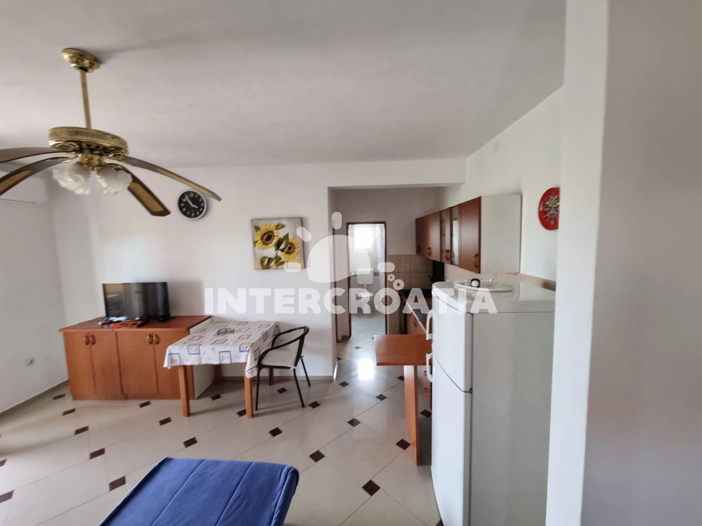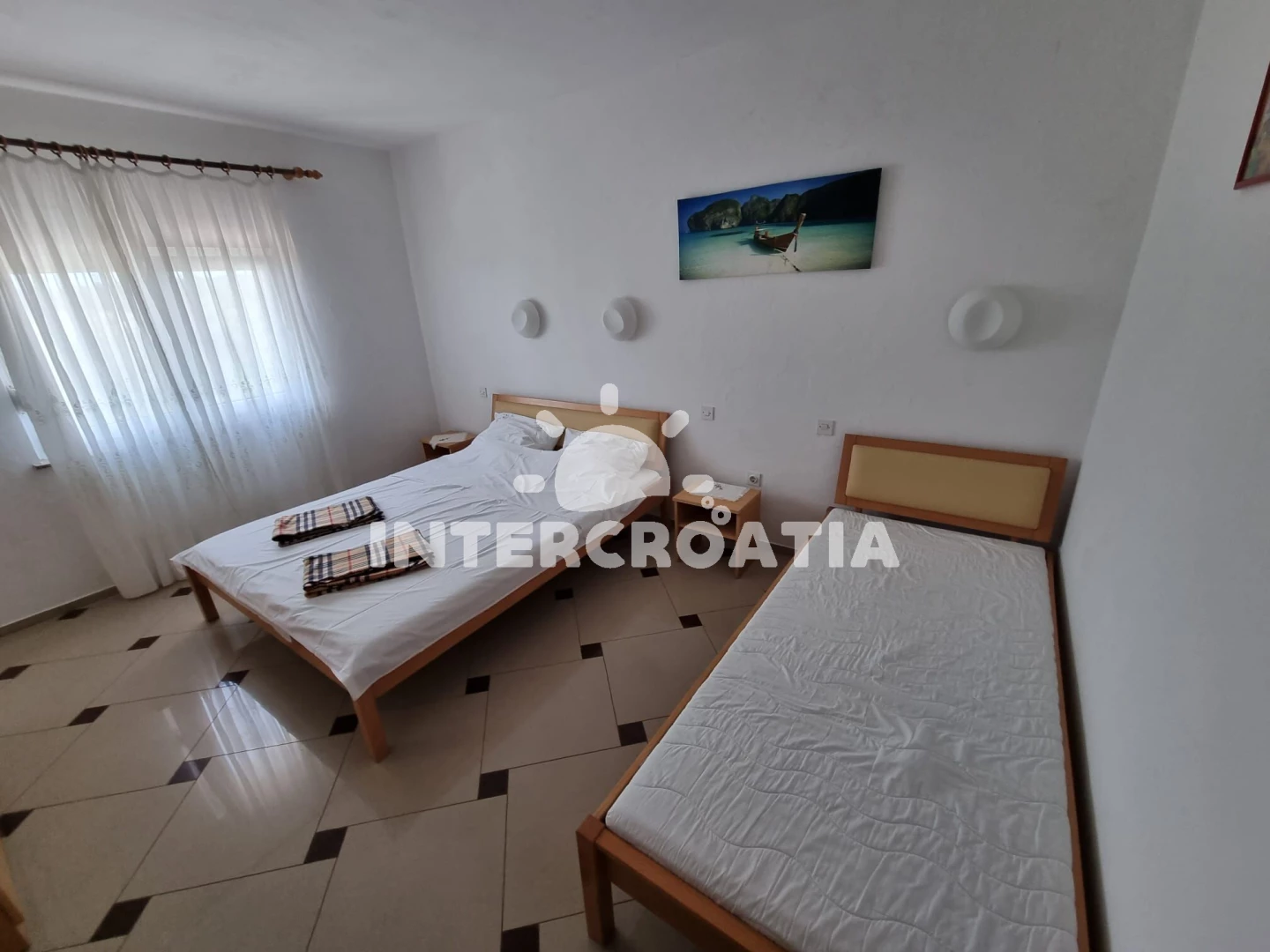 Vzdálenosti: Moře a oblázková-betonová pláž 500 m, velká oblázková pláž Porat 950 m, restaurace, supermarket, veřejná doprava a lékárna 250 m, centrum 500 m, diskotéka 1 km, čerpací stanice 4 km, banka 5 km, trajekt (Biograd) 10 km, letiště (Zadar) 30 km.