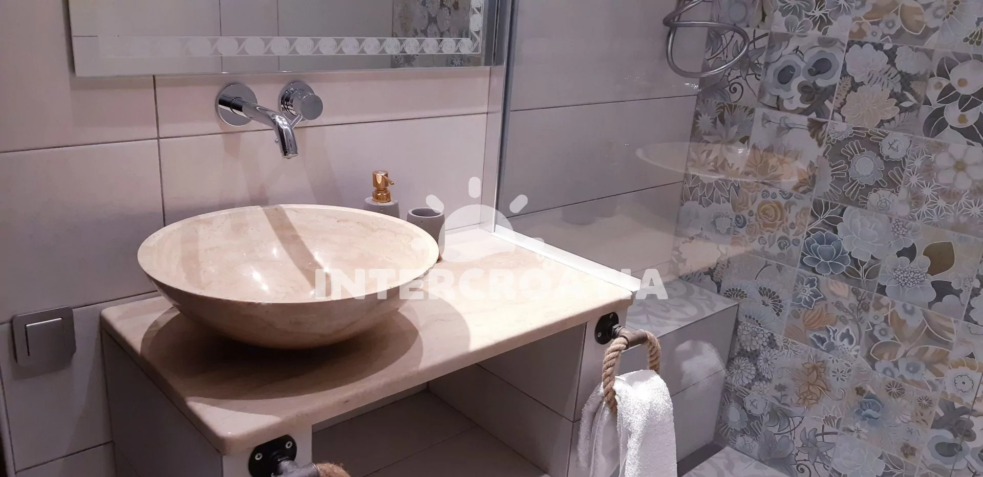 Zajímavě zařízený apartmán s dvěma ložnicemi a terasou, nacházející se v přízemí. Vstup, obývací místnost spojená s kuchyní. Kuchyňská linka se sporákem, troubou, mikrovlnnou troubou, rychlovarnou…