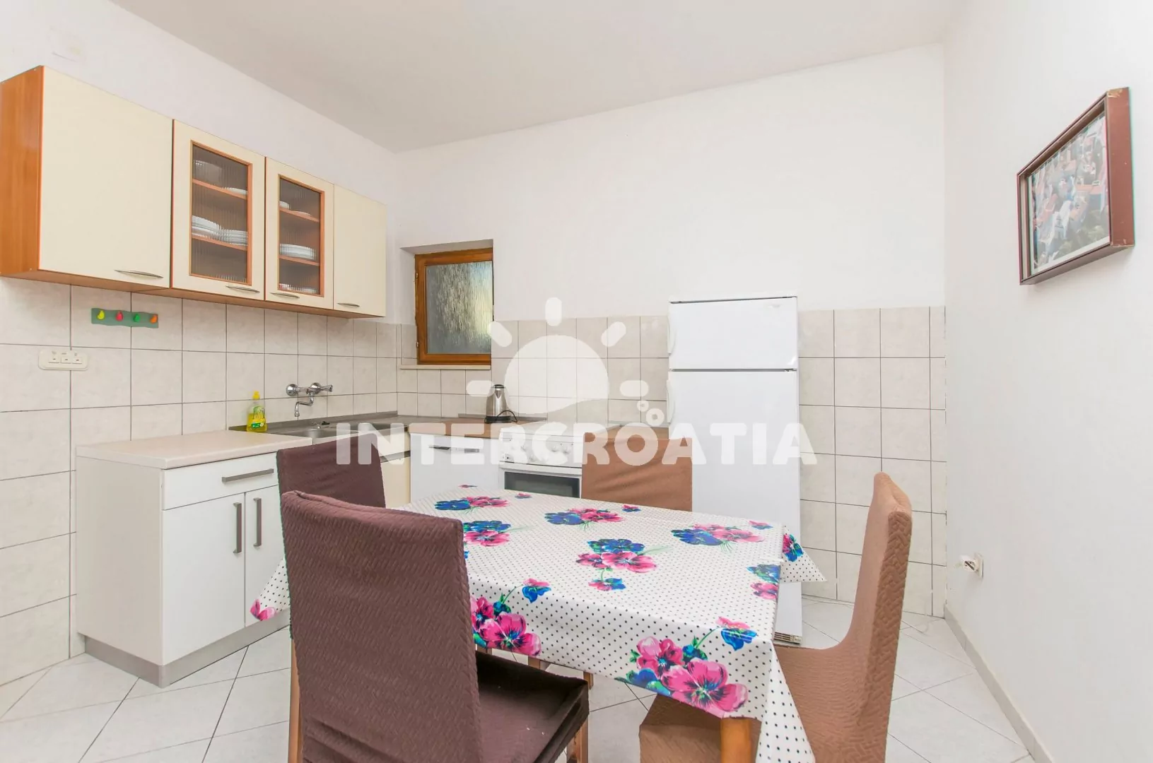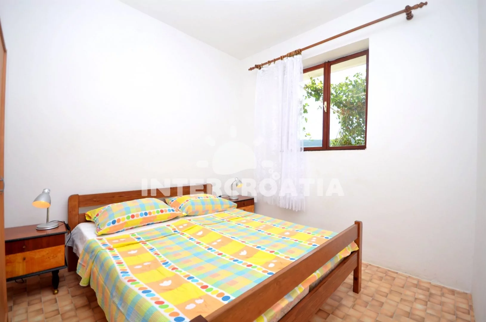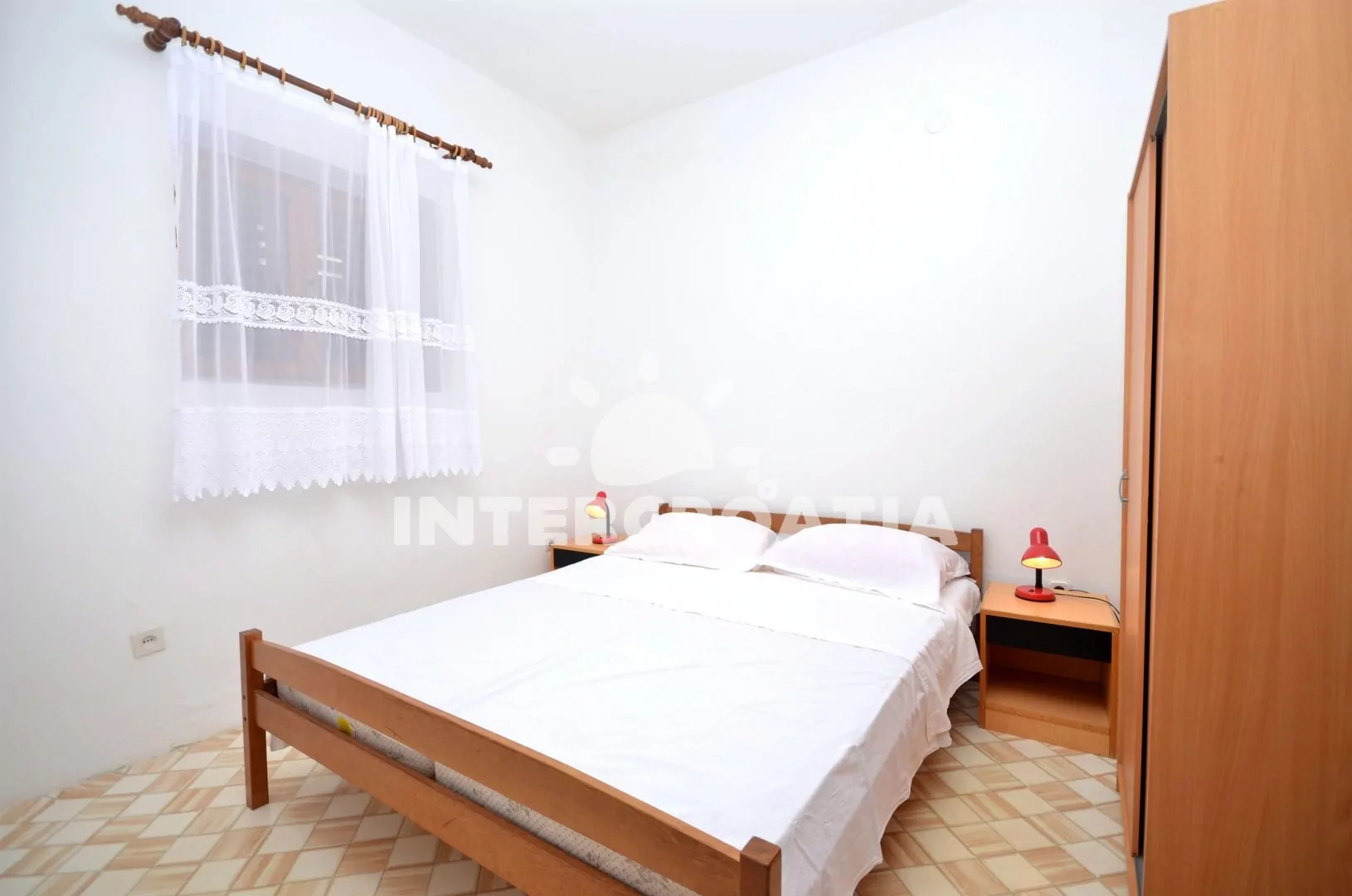 Apartmán v přízemí domu, s terasou a výhledem na moře je vhodný pro až 6 osob. Obývací pokoj je spojený s kuchyní. Kuchyňská linka se sporákem, troubou, nádobím a lednicí s mrazákem. Obývací pokoj s jídelním stolem pro 6 osob, televizí, radiem a přistýlkou (extra lůžko pro 2 osoby). Apartmán disponuje dvěma ložnicemi, každá je vybavena jedním dvoulůžkem. Koupelna s vanou, sprchou, umyvadlem a wc. Hostům je k dispozici parkování u objektu zdarma.
