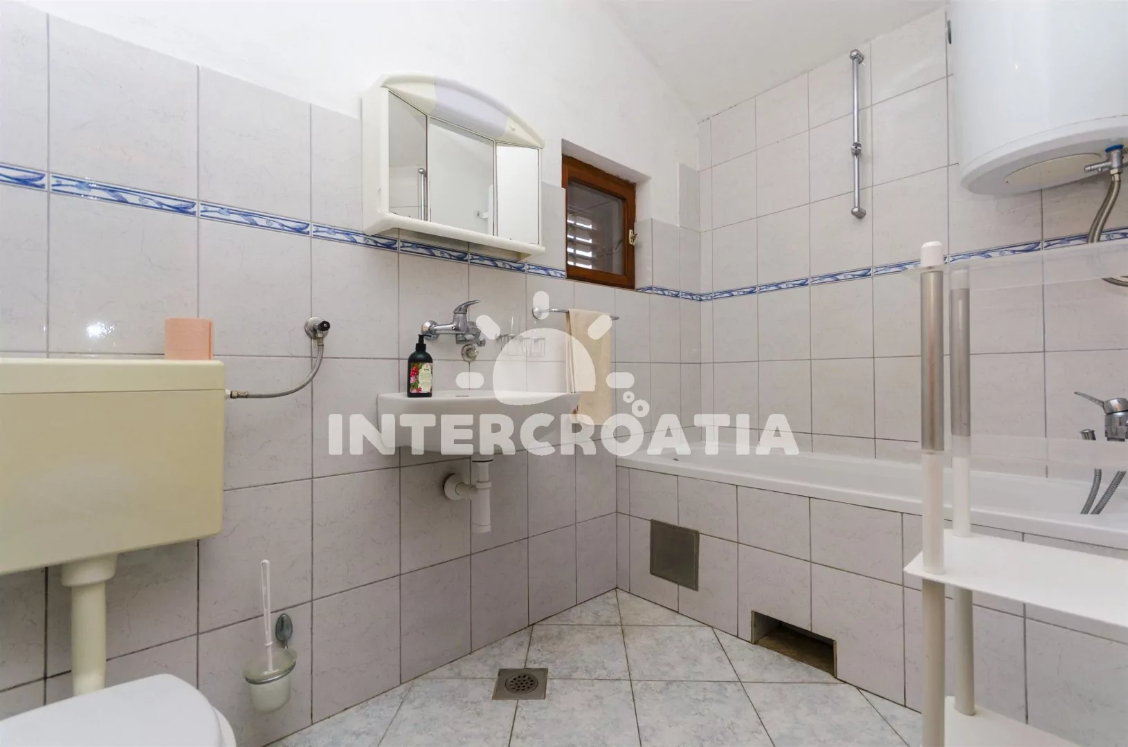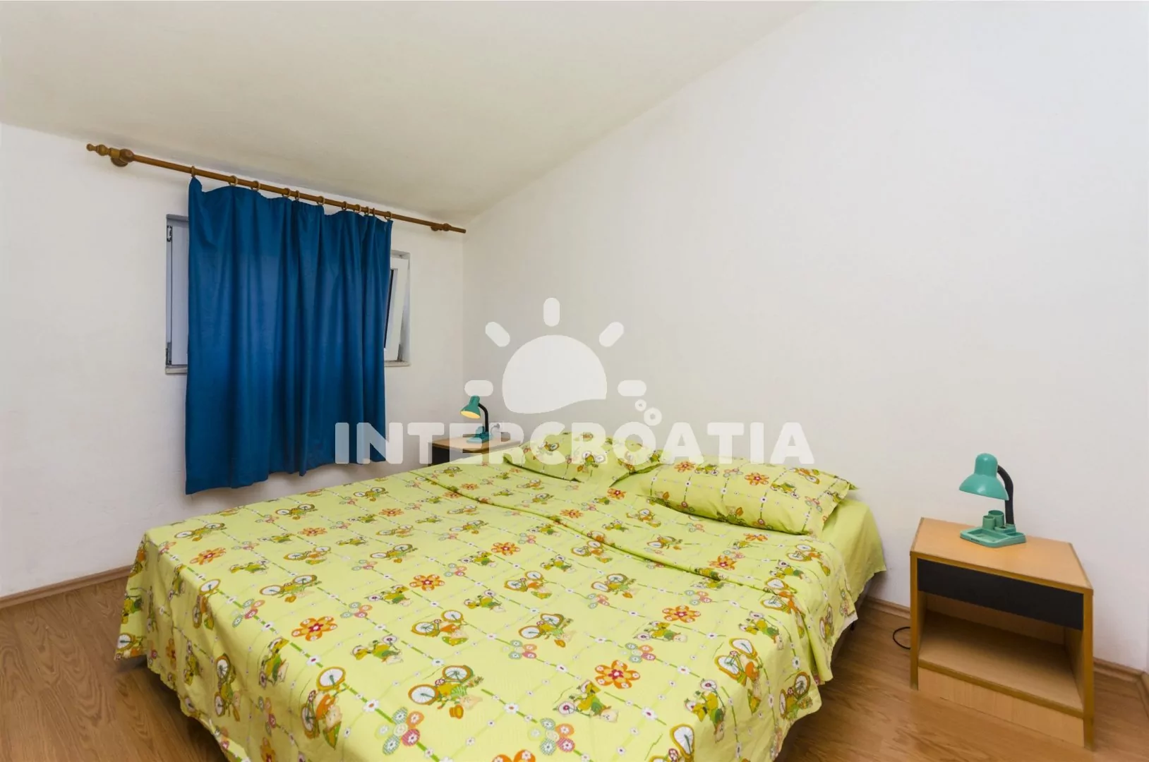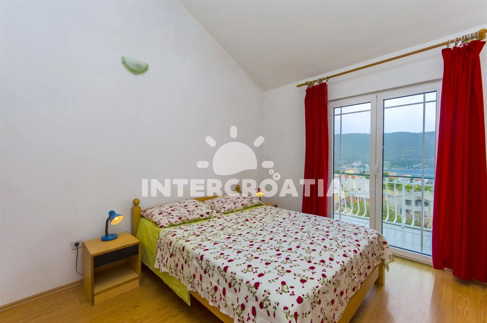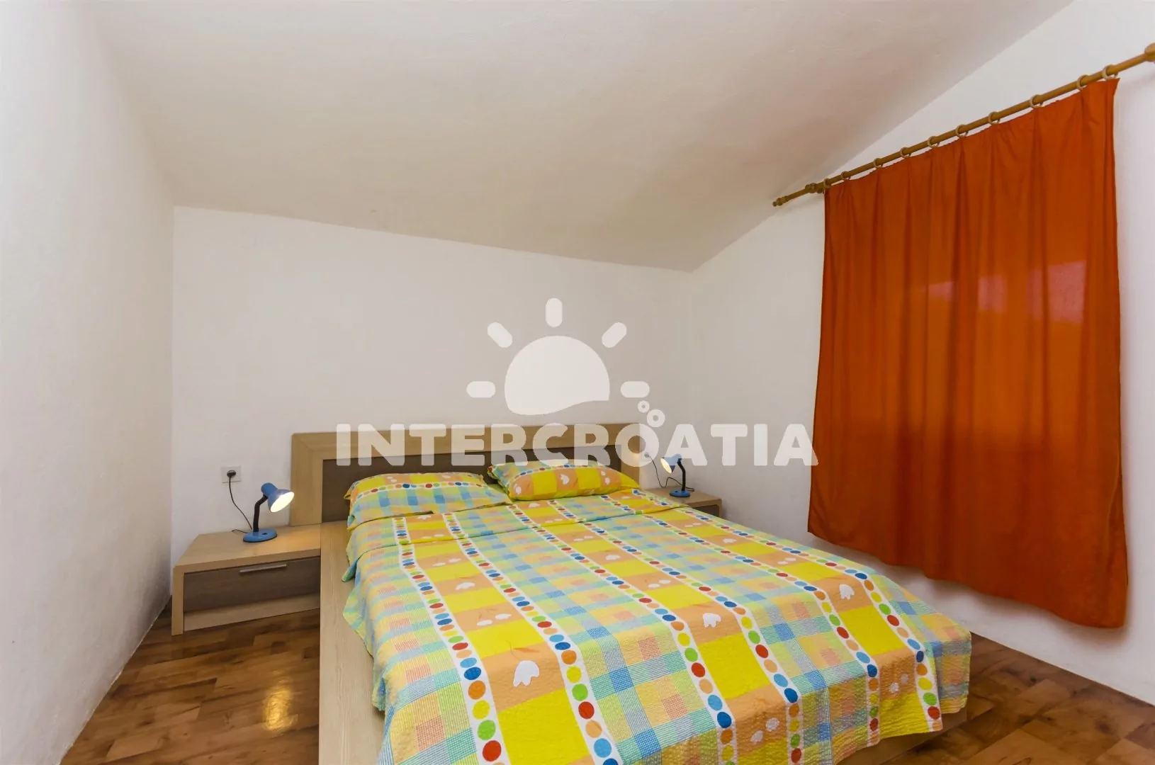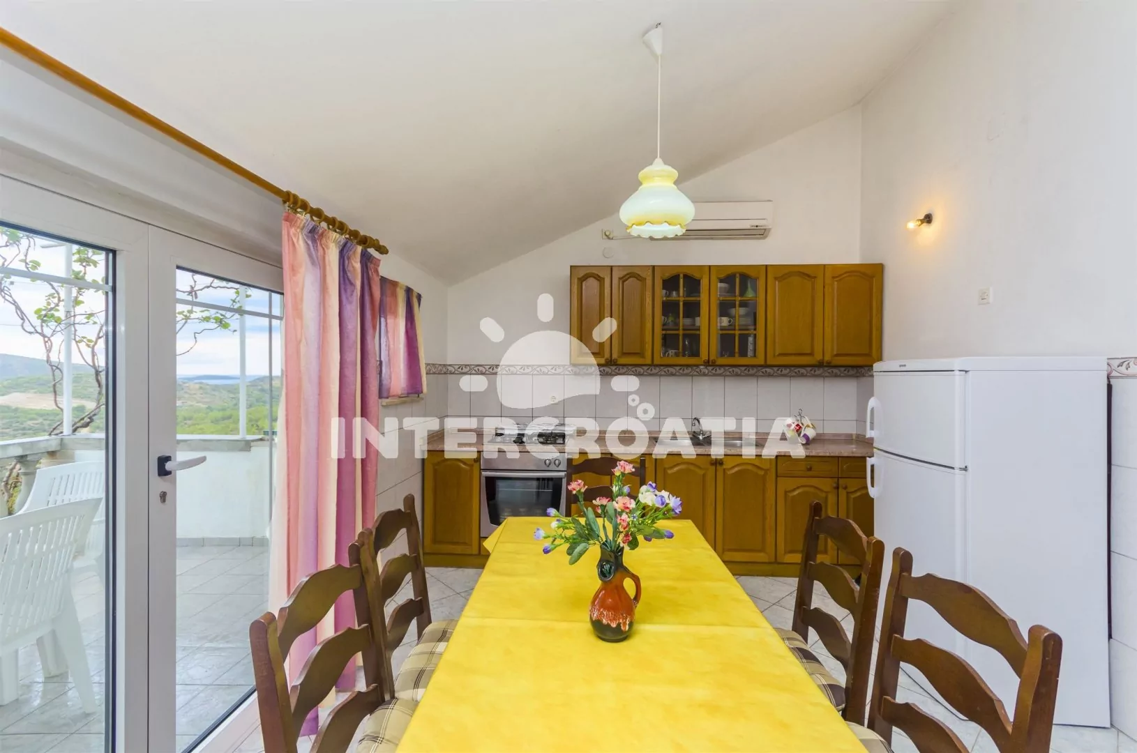 Komfortně zařízený apartmán s francouzskými okny, v druhém patře vilky je vhodný pro až 6 osob, s výhledem na moře a posezením na terase. Obývací pokoj je spojený s kuchyní. Kuchyňská linka se sporákem, troubou, nádobím a lednicí s mrazákem. Obývací pokoj s jídelním stolem pro 6 osob, sedací soupravou, pohovkou, televizí se satelitním programem, radiem, klimatizací a vstupy na terasu. Apartmán disponuje třemi ložnicemi, každá je vybavena jedním dvoulůžkem. Koupelna s vanou, sprchou, umyvadlem a wc. Dále jedno samostatné wc. Hostům je k dispozici parkování u objektu zdarma.