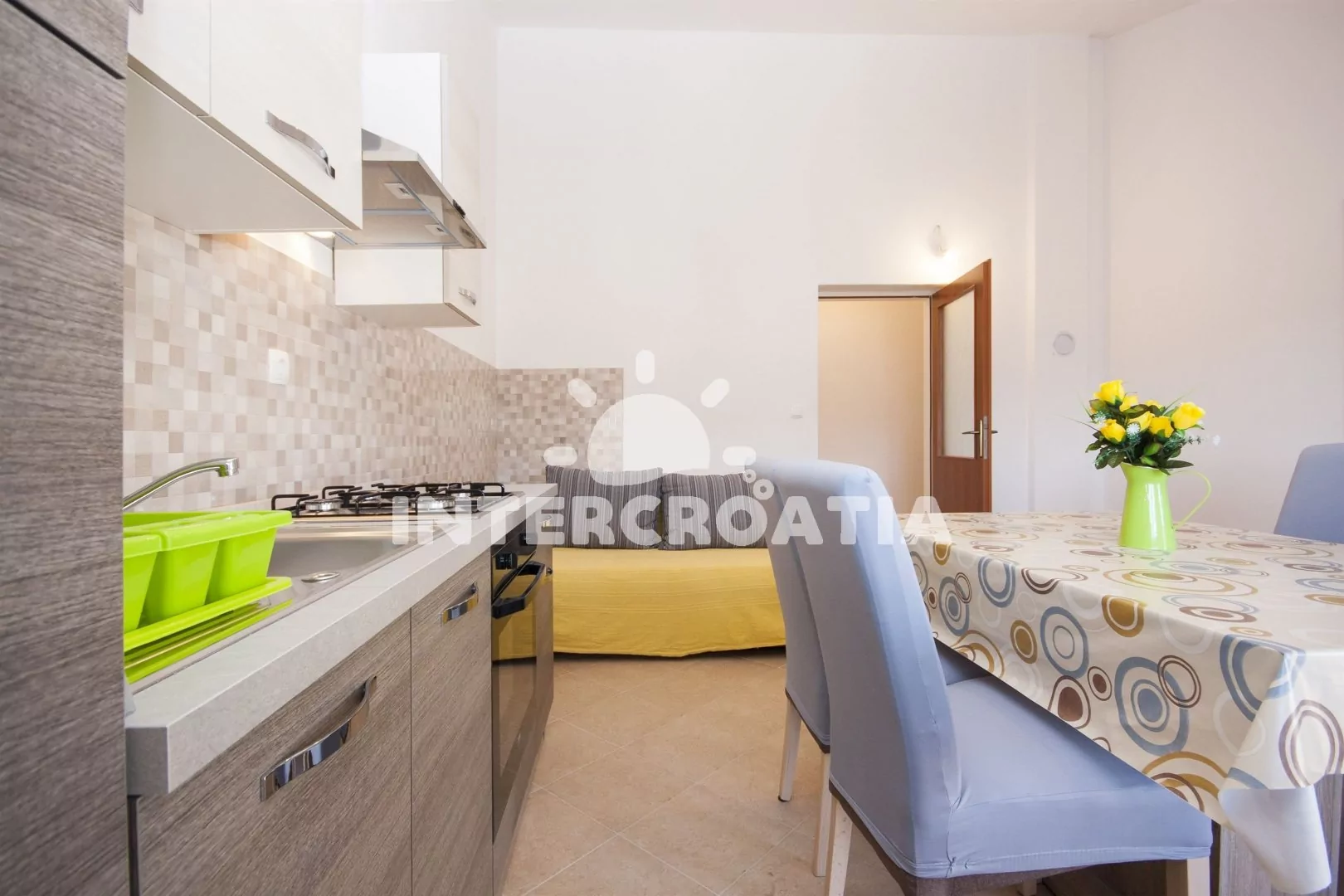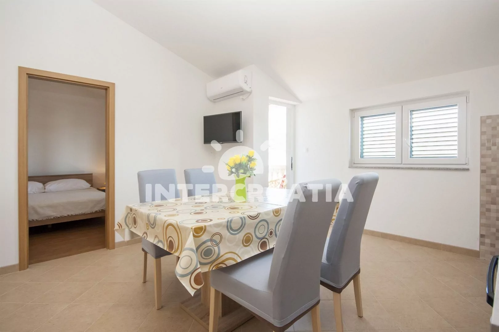 Moderně zařízený apartmán pro 2 až 4 osoby se nachází v druhém patře vilky. Obývací pokoj spojený s kuchyní. Kuchyňská linka se sporákem, digestoří, troubou, rychlovarnou konvicí, toustovačem, nádobím a lednicí s mrazákem. Obývací pokoj s jídelním stolem pro 4 osoby, televizí se satelitním programem, rozkládací pohovkou (extra lůžko pro 2 osoby), klimatizací a vstupem na terasu. Ložnice s jedním dvoulůžkem a vstupem na terasu. Koupelna se sprchovým koutem, umyvadlem a wc. Hostům je k dispozici parkování u objektu zdarma.