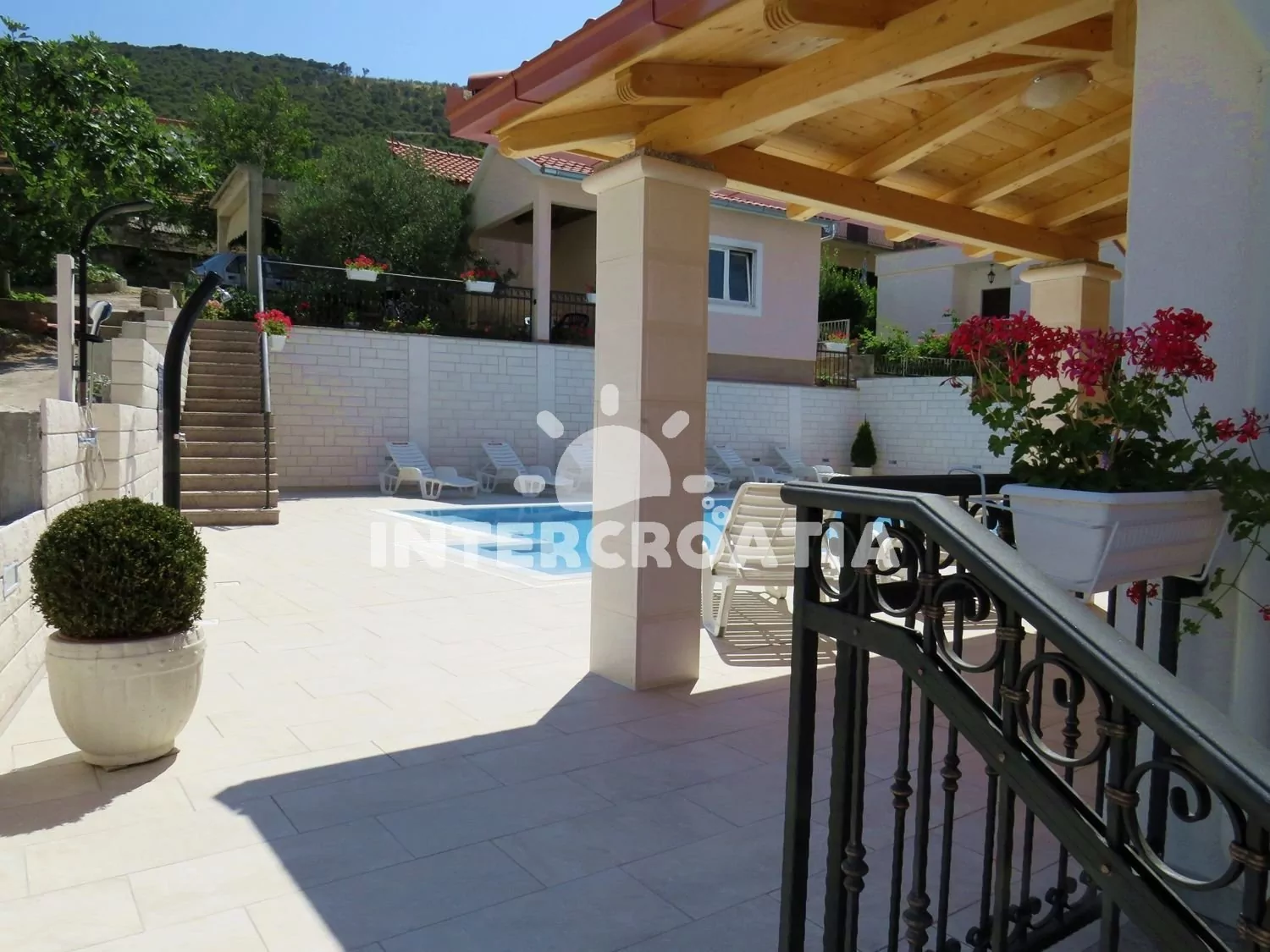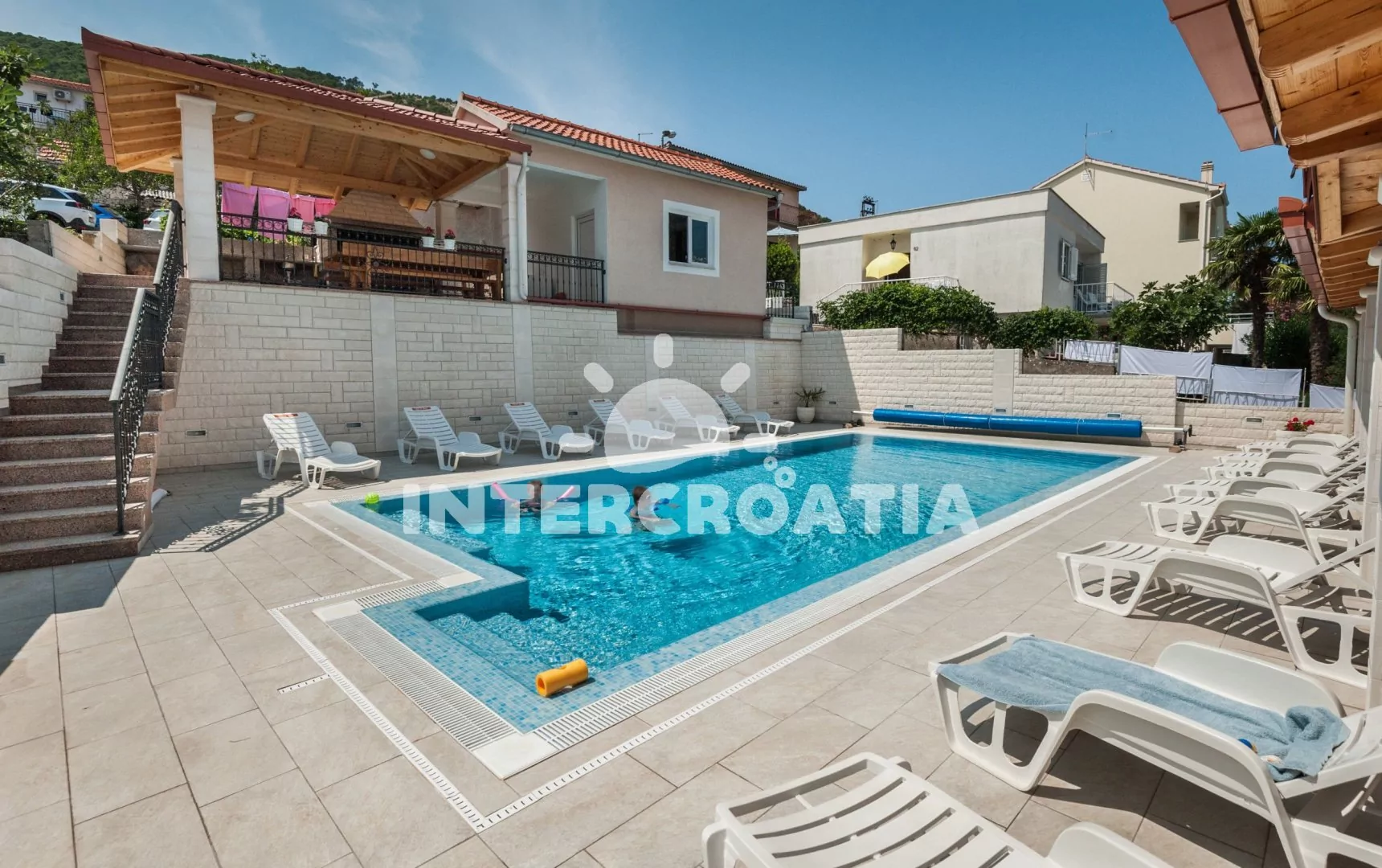 Luxusně zařízená vila přímo u moře, s vlastní pláží, k dispozici bazén s lehátky a posezením.