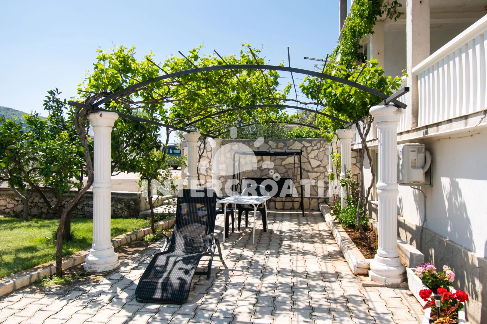 Apartmán se nachází 500 m od moře a pláže. Pláž je oblázková a betonové desky. U objektu je k dispozici společná zahrada s posezením a grilem. Parkování je před domem.