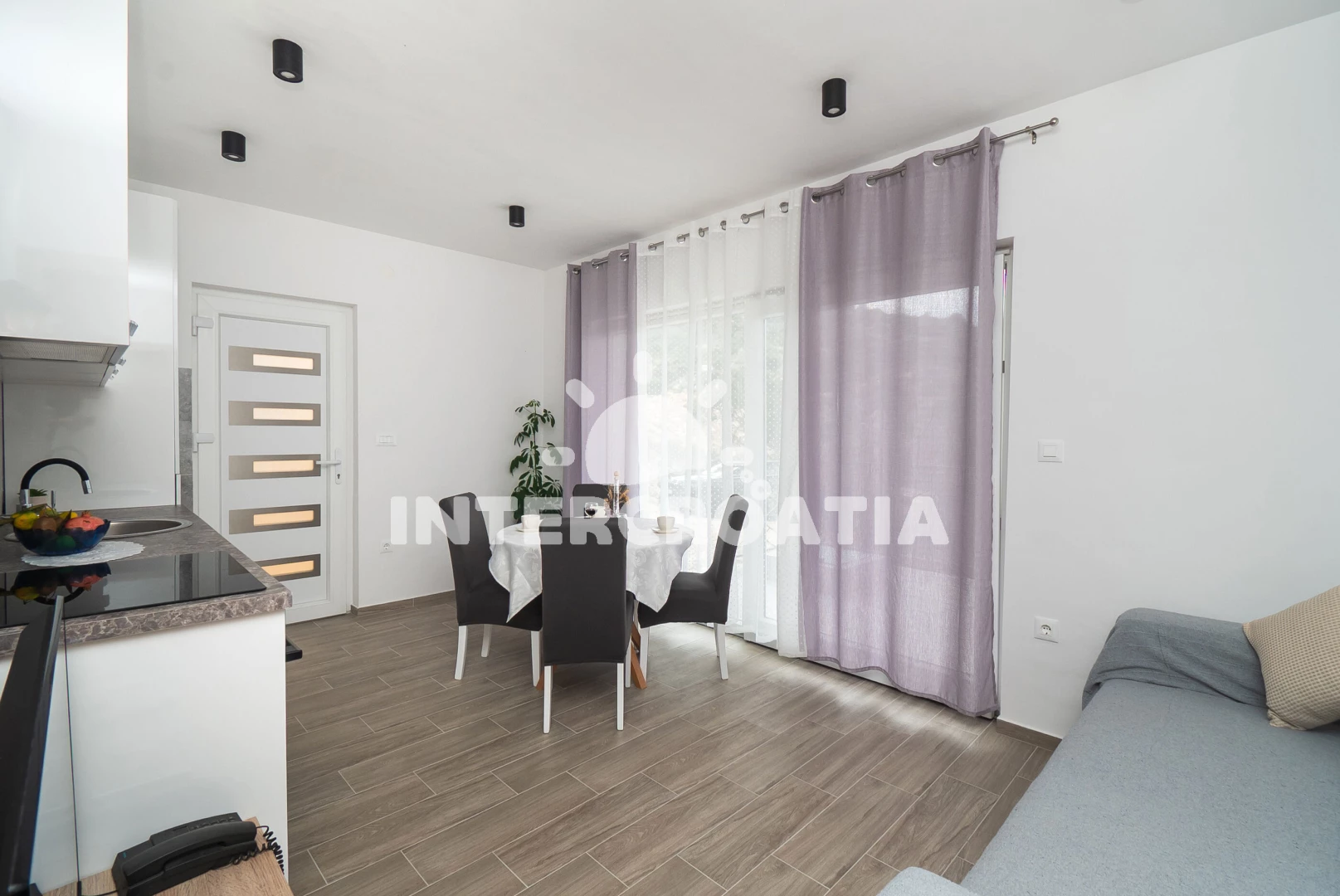 Apartmán se nachází 10 m od moře a pláže. Pláž je oblázková a betonové desky. U objektu je k dispozici společná zahrada s posezením a grilem. Parkování je před domem.