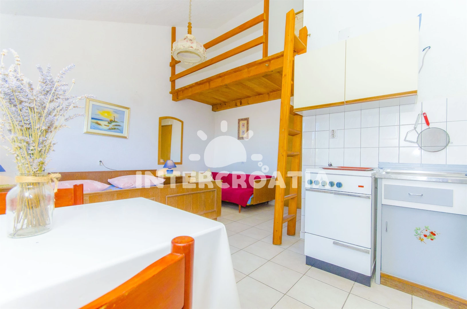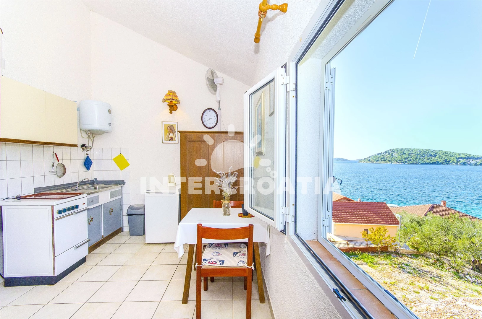 Vzdálenosti: kotviště pro čluny 0 m, Moře 40 m, pláž 40 m (oblázková a betonové desky), supermarket 1 km, restaurace 1,5 km, bar 1,5 km, potápění 2 km, marina 7 km, půjčovna kol 7 km, centrum 7 km, banka 7 km, směnárna 7 km, ambulance 7 km, lékárna 7 km, pošta 7 km, čerpací stanice 15 km, diskotéka 15 km, muzeum 25 km, letiště (Split) 30,0 km, trajekt (Split) 49,8 km,