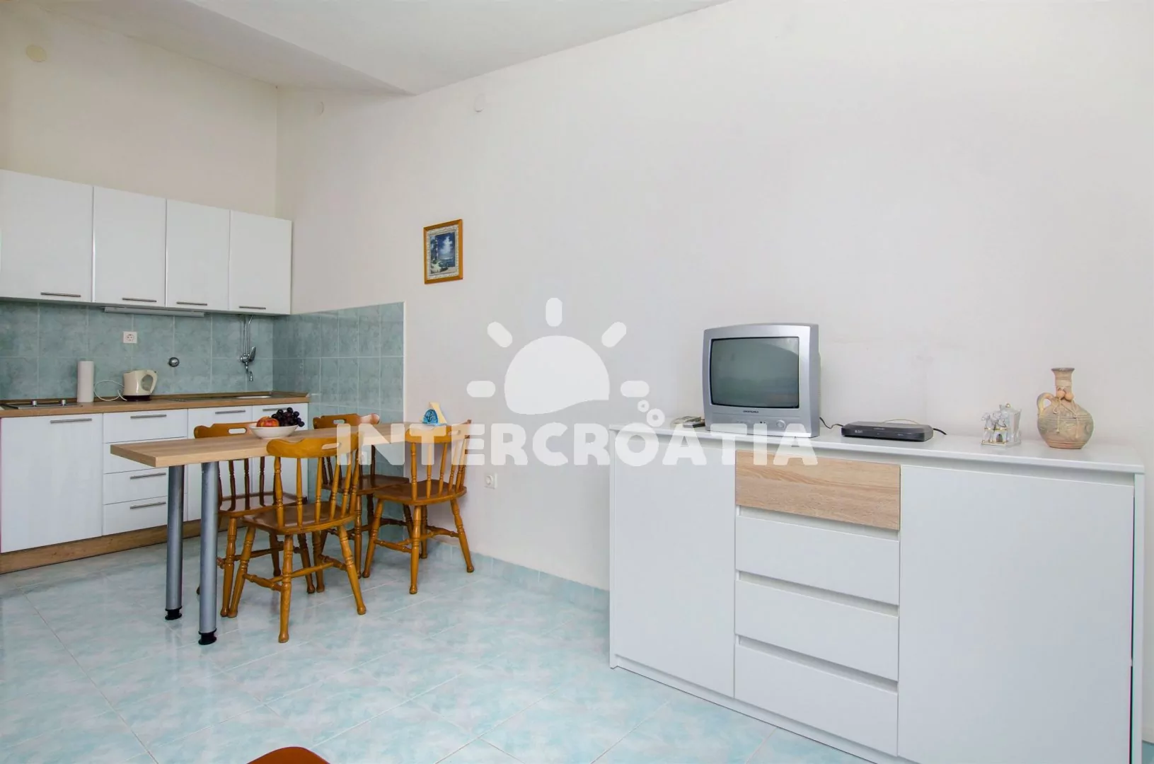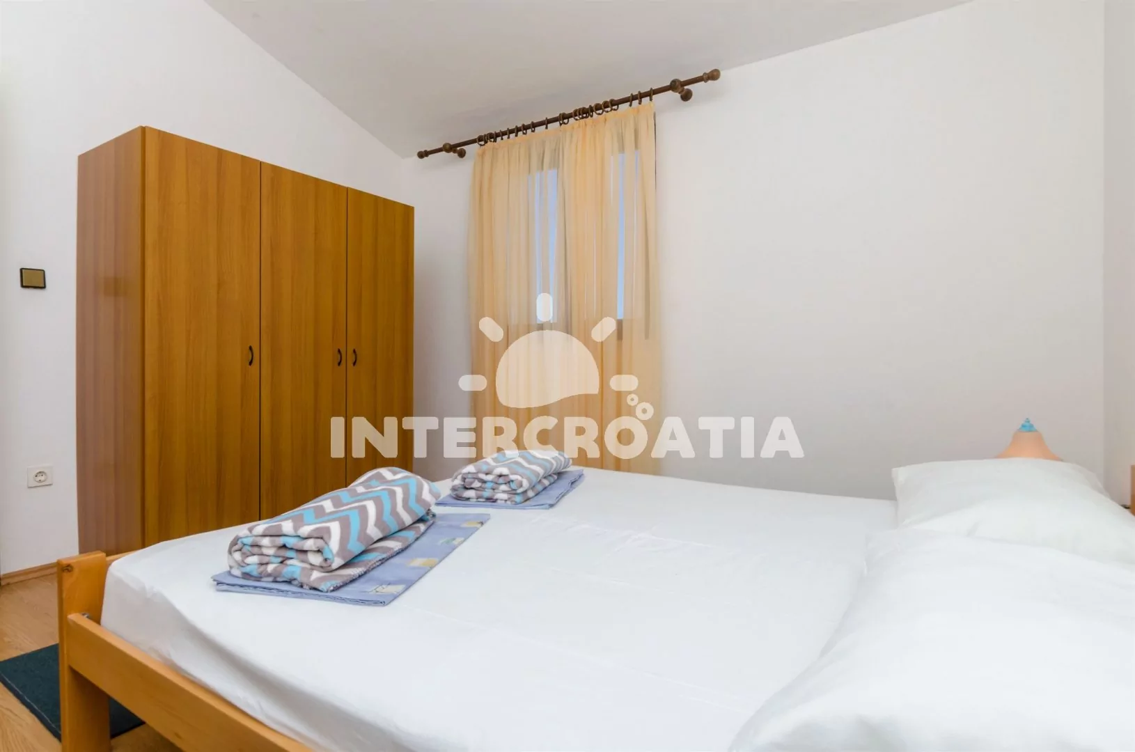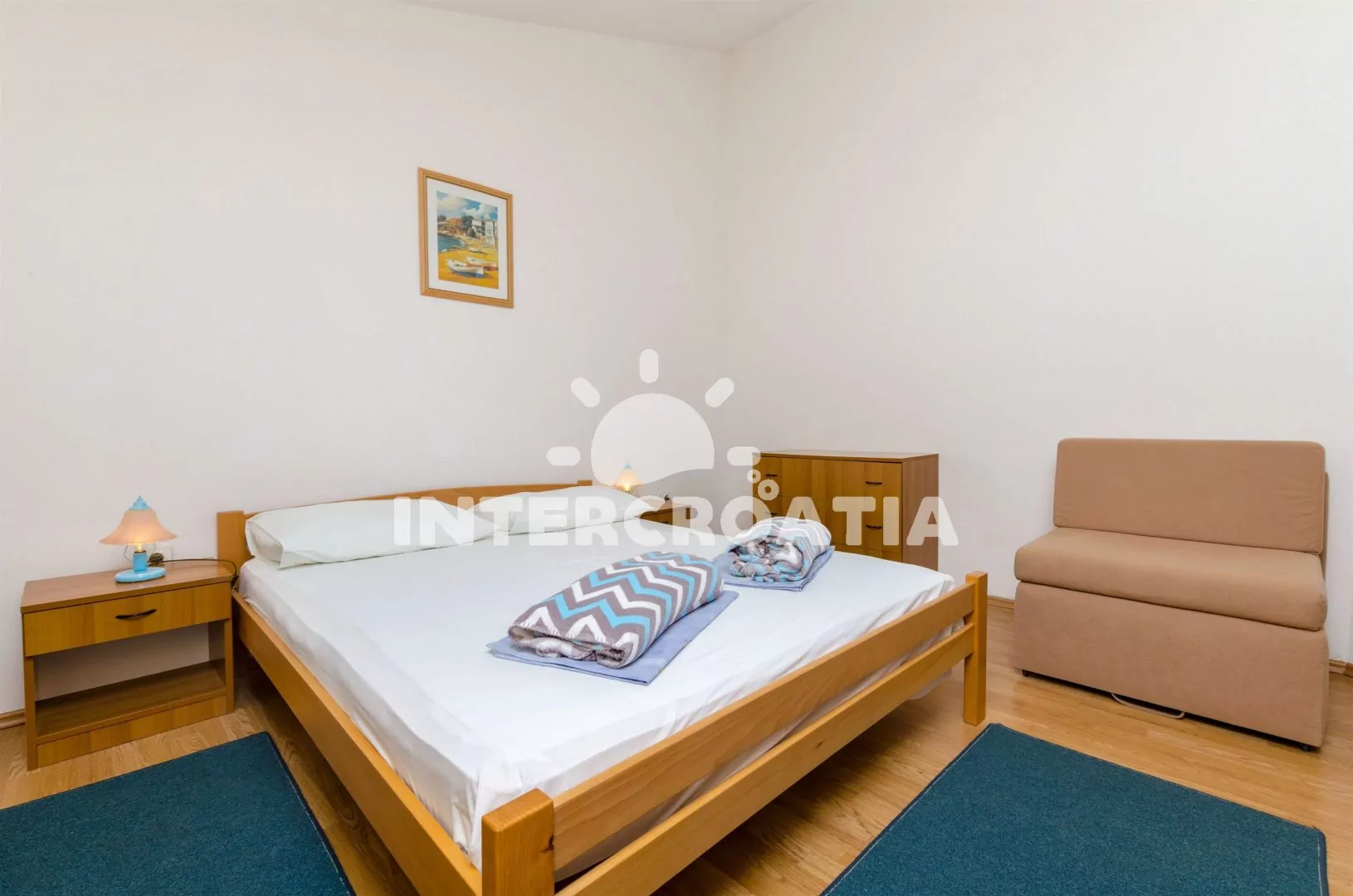 Apartmán s balkonem a jedinečným výhledem na moře je vhodný pro 2 až 4 osoby, nachází se v první patře vily. Obývací pokoj je spojený s kuchyní. Kuchyňská linka je vybavena dvouplotýnkovým sporákem, mikrovlnnou troubou, rychlovarnou konvicí, nádobím a lednicí s mrazákem. Obývací pokoj s jídelním stolem pro 4 osoby, pohovkou (rozložitelná na extra lůžko pro 2 osoby), televizí, klimatizací a vstupem na balkon. Ložnice je vybavena jedním dvoulůžkem. Koupelna se sprchovým koutem, umyvadlem a wc. Hostům je k dispozici parkování u objektu zdarma.
