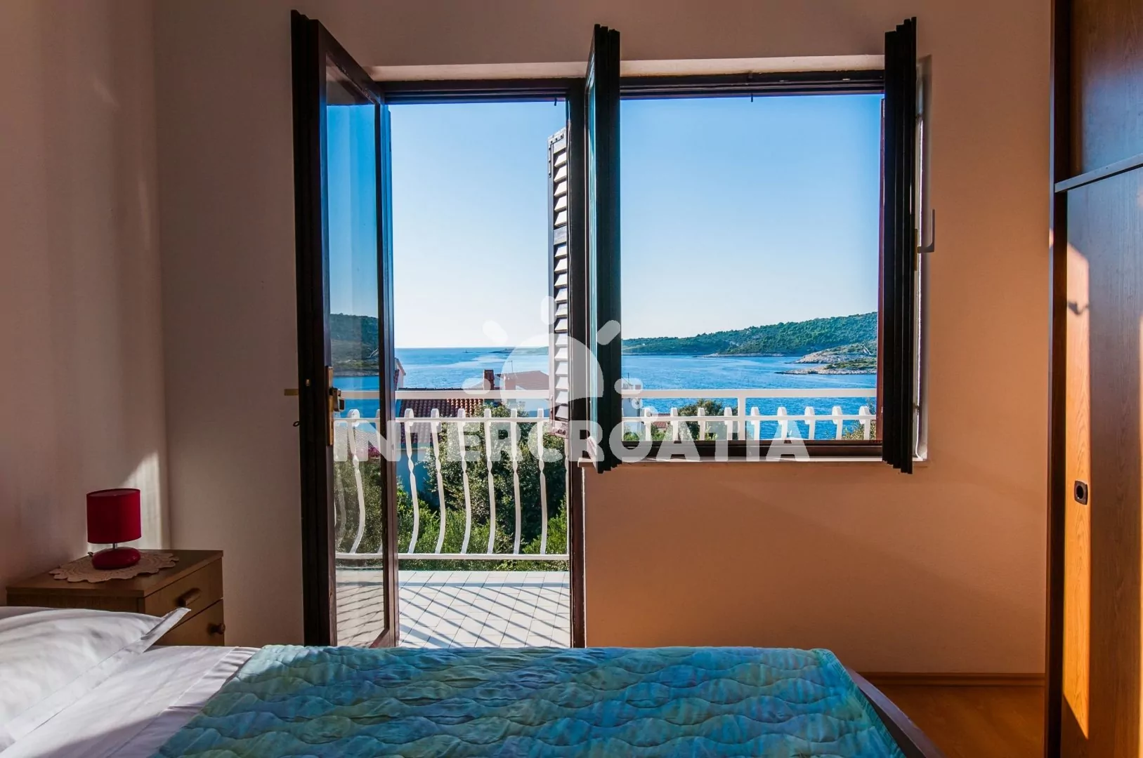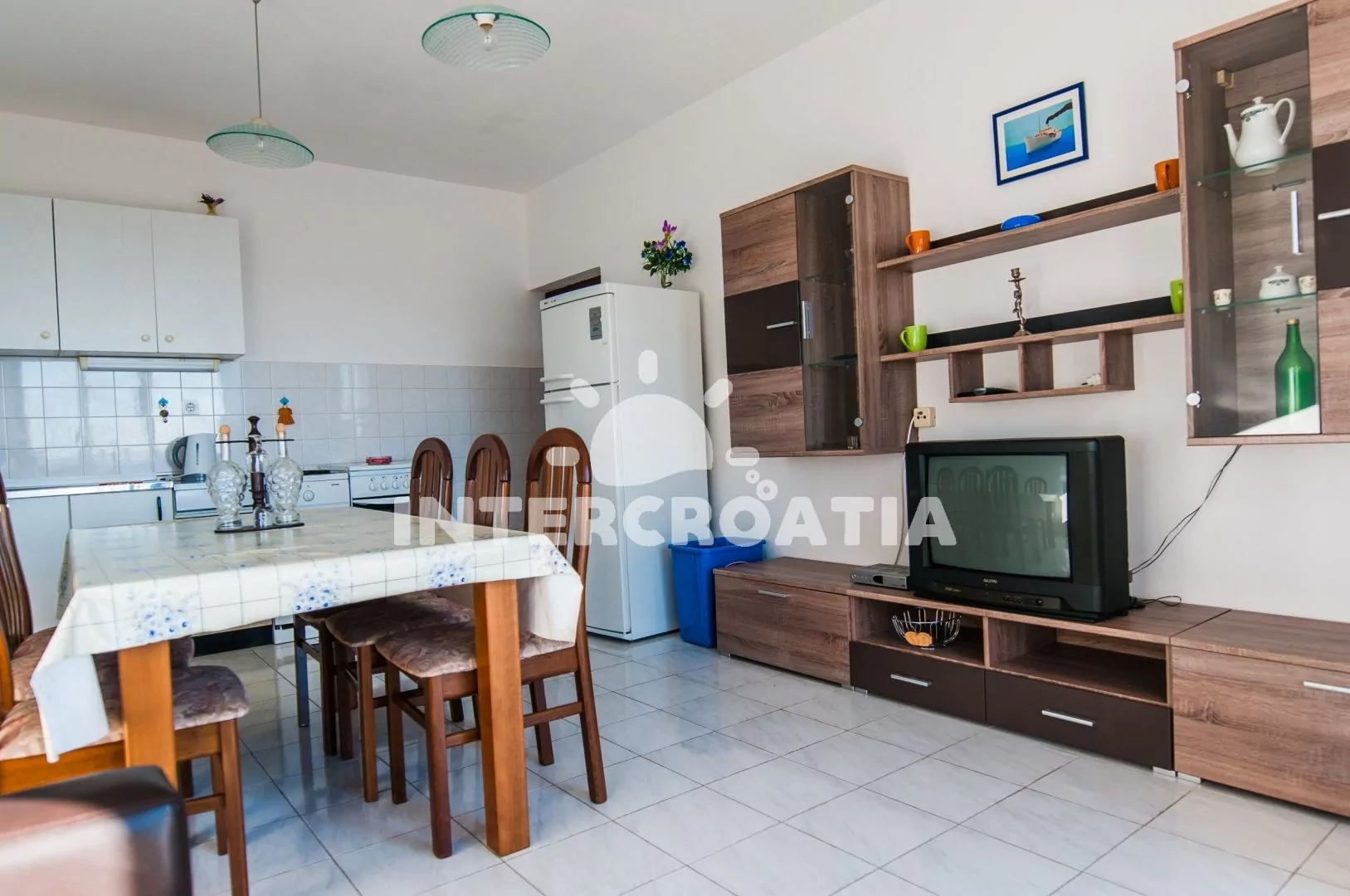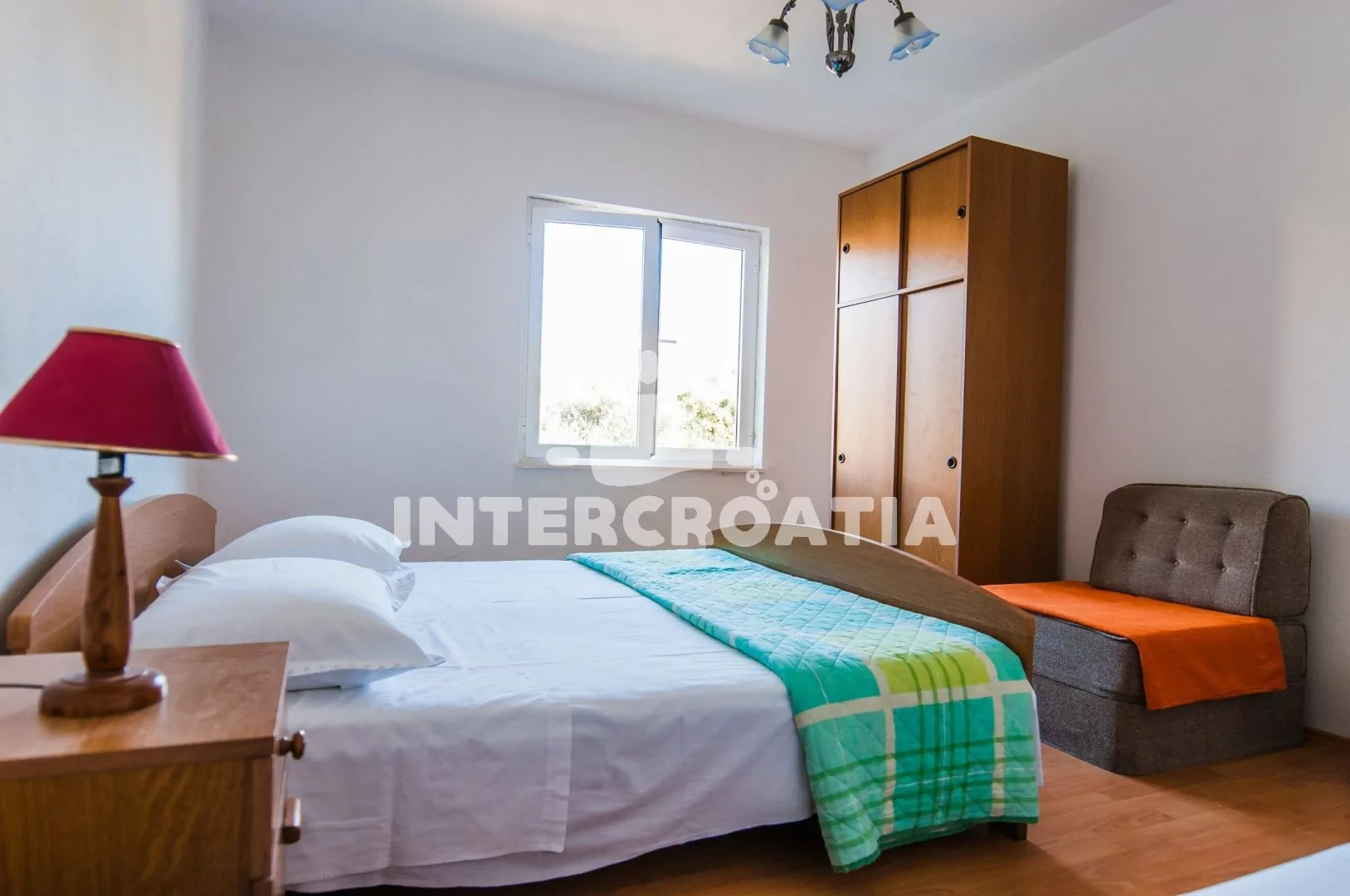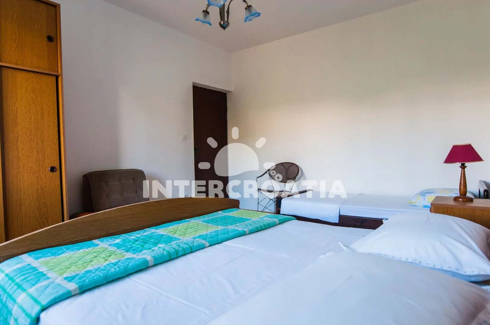 Apartmán (70 m2) s výhledem na moře a terasou s venkovním posezením, se nachází v prvním patře domu a je vhodný pro 4 až 6 osob. Obývací pokoj je spojený s kuchyní. Kuchyňská linka se sporákem, troubou, kávovarem, nádobím a lednicí s mrazákem. Obývací pokoj s jídelním stolem pro 6 osob, pohovkou (rozložitelná na extra lůžko pro 1 osobu), televizí se satelitním programem a vstupem na terasu. První ložnice s jedním dvoulůžkem a jednou přistýlkou. Druhá ložnice s jedním dvoulůžkem. Koupelna se sprchou, umyvadlem a wc. Hostům je k dispozici parkování u objektu zdarma.