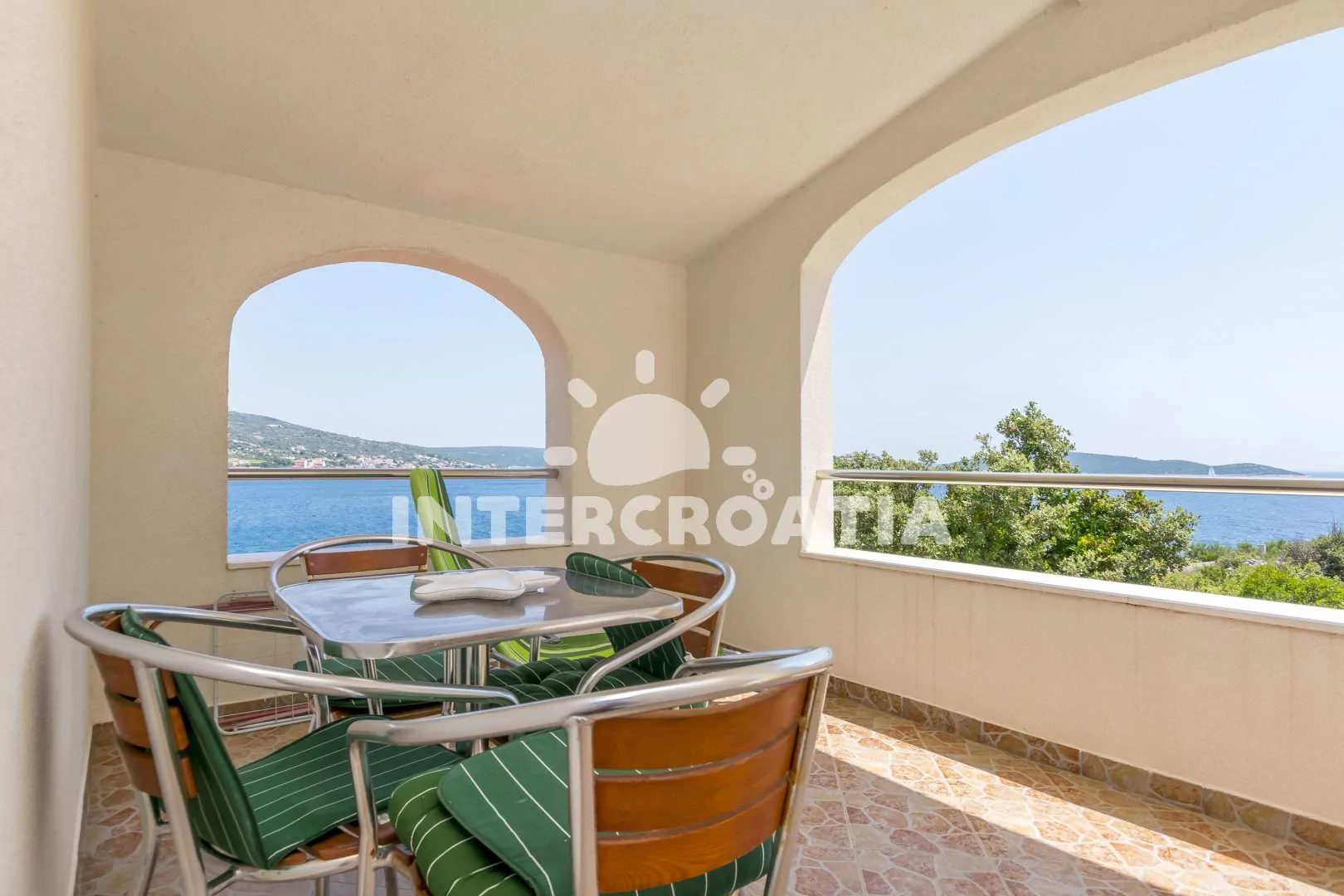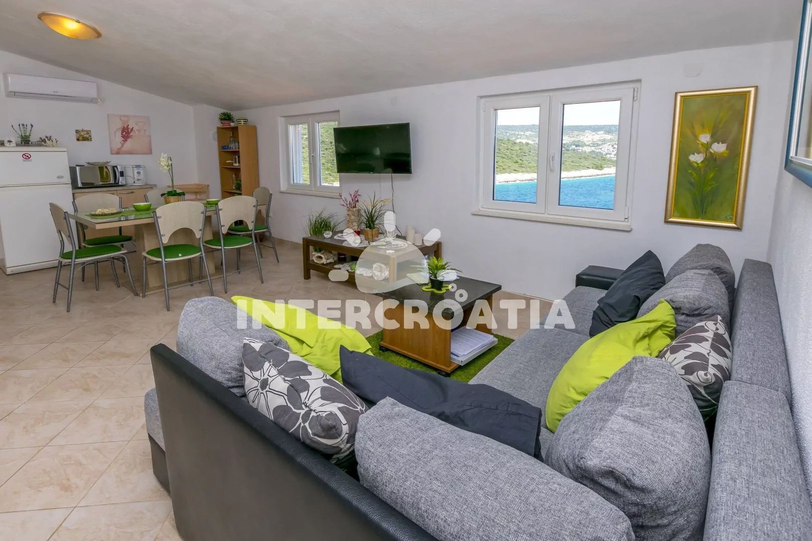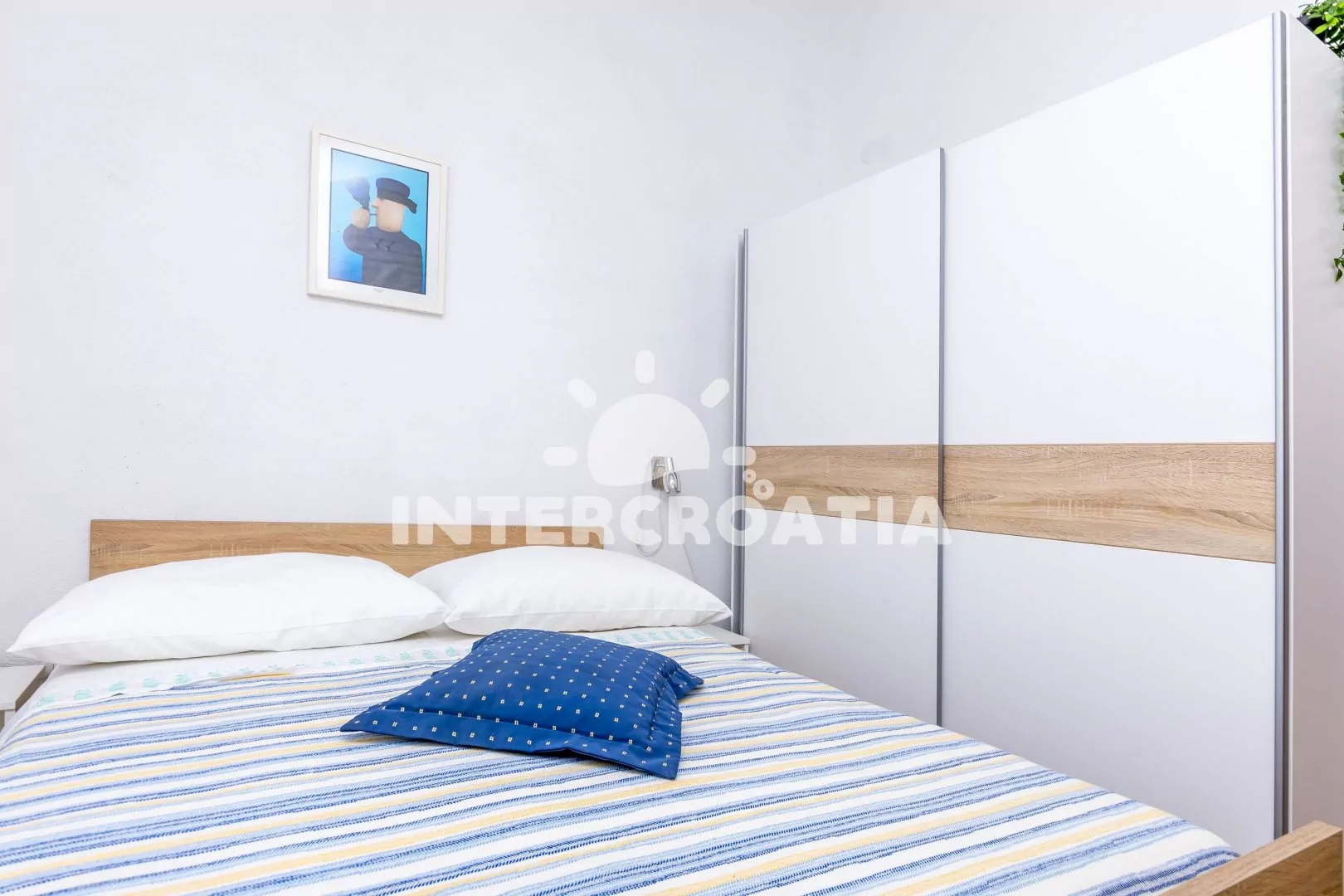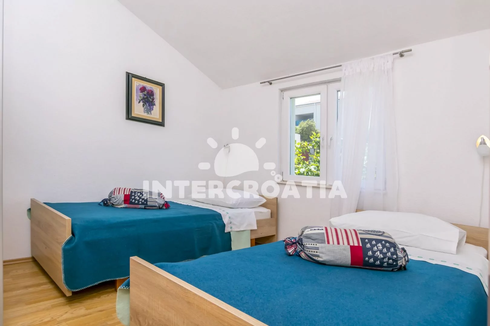 Vkusně zařízený apartmán s vlastní terasou a výhledem na moře se nachází v druhém patře domu a je vhodný pro 4 až 6 osob. Obývací pokoj je spojený s kuchyní. Kuchyňská linka je vybavena sporákem, digestoří, troubou, myčkou na nádobí, mikrovlnnou troubou, rychlovarnou konvicí, kávovarem, toustovačem, nádobím a lednicí s mrazákem. Obývací pokoj s jídelním stolem pro 6 osob, rohovou pohovkou (rozložitelná na extra lůžko pro 2 osoby), televizí se satelitním programem, klimatizací a vstupem na terasu. První Ložnice s dvoulůžkem. Druhá ložnice s dvěma jednolůžky. Koupelna s vanou, sprchovou zástěnou, umyvadlem, fénem, pračkou a wc. Hostům je k dispozici parkování u objektu zdarma.