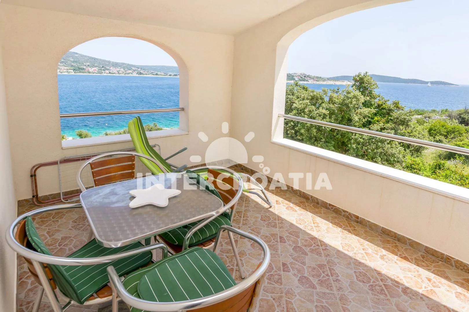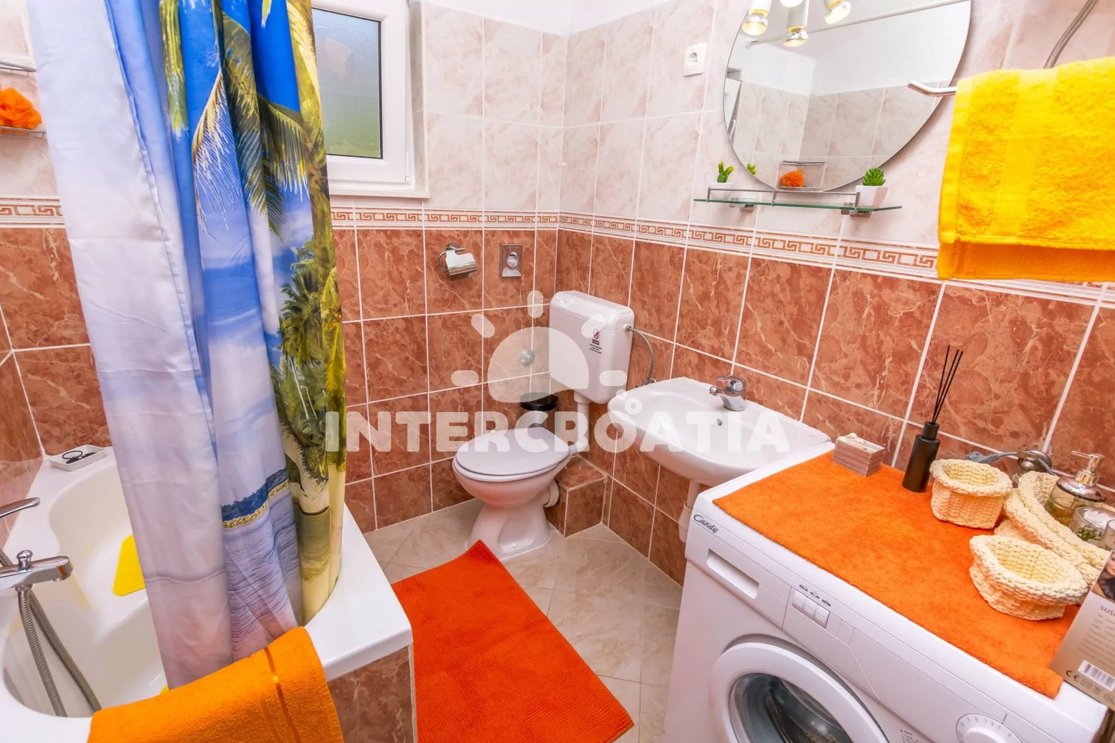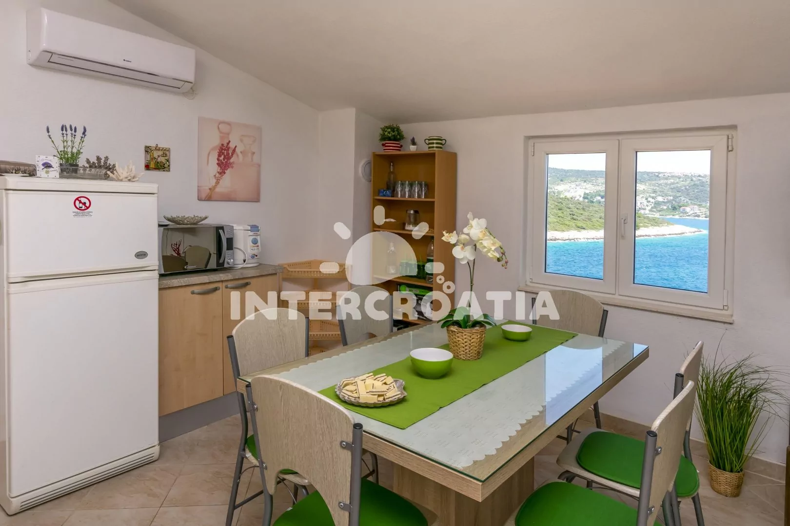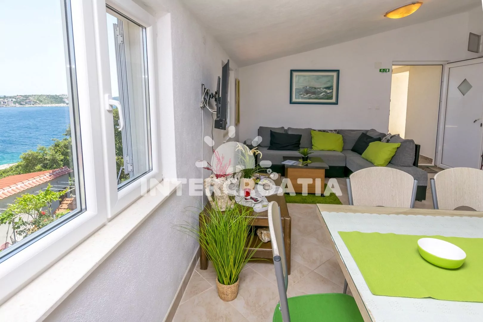 Vkusně zařízený apartmán s vlastní terasou a výhledem na moře se nachází v druhém patře domu a je vhodný pro 4 až 6 osob. Obývací pokoj je spojený s kuchyní. Kuchyňská linka je vybavena sporákem, digestoří, troubou, myčkou na nádobí, mikrovlnnou troubou, rychlovarnou konvicí, kávovarem, toustovačem, nádobím a lednicí s mrazákem. Obývací pokoj s jídelním stolem pro 6 osob, rohovou pohovkou (rozložitelná na extra lůžko pro 2 osoby), televizí se satelitním programem, klimatizací a vstupem na terasu. První Ložnice s dvoulůžkem. Druhá ložnice s dvěma jednolůžky. Koupelna s vanou, sprchovou zástěnou, umyvadlem, fénem, pračkou a wc. Hostům je k dispozici parkování u objektu zdarma.
