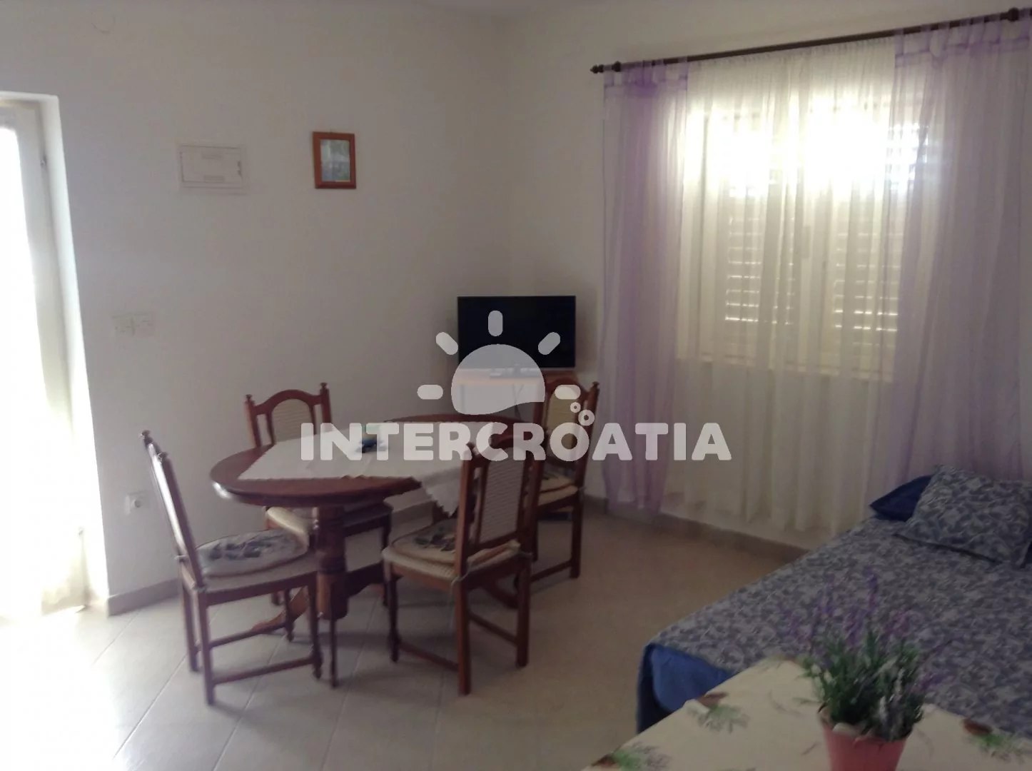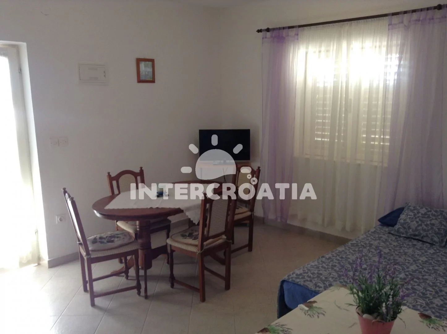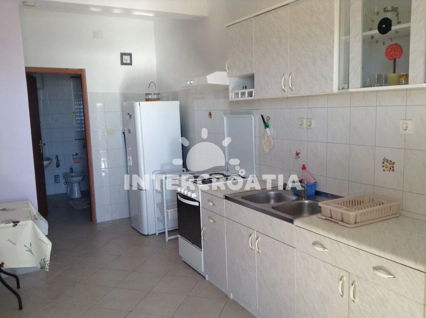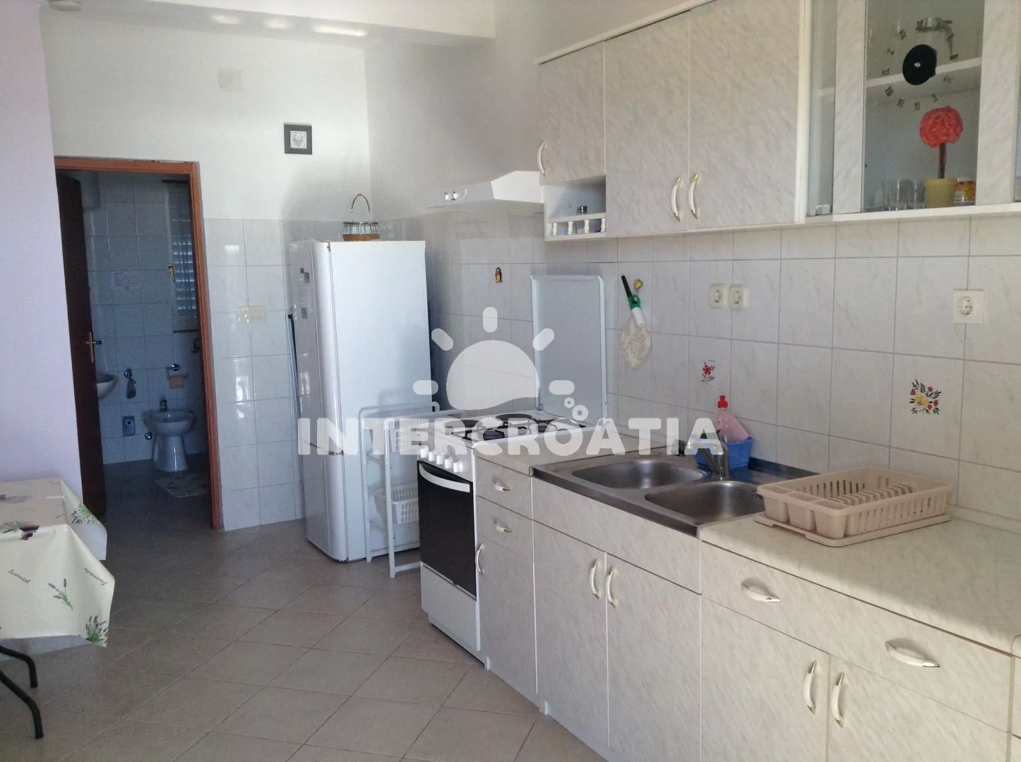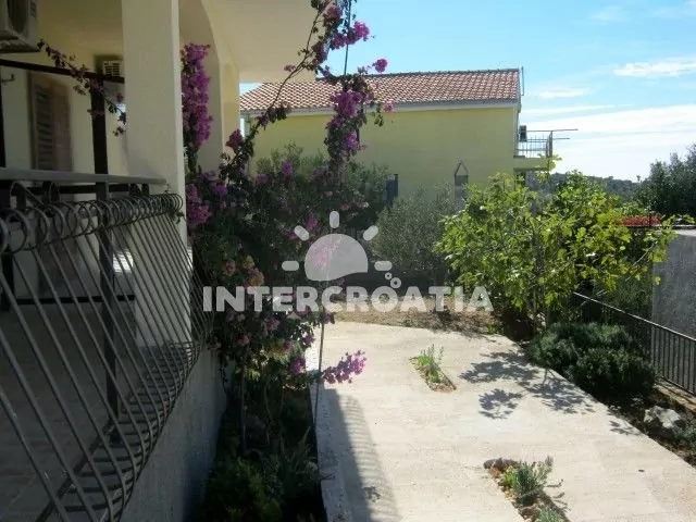 Apartmán (50 m2) s terasou a výhledem na moře, se nachází v přízemí domu. Obývací pokoj je spojený s kuchyní. Kuchyňská linka je vybavena varnou deskou, digestoří, troubou, rychlovarnou konvicí,…