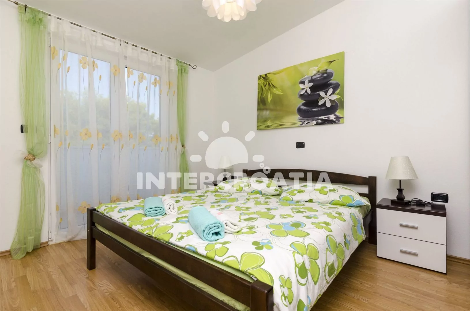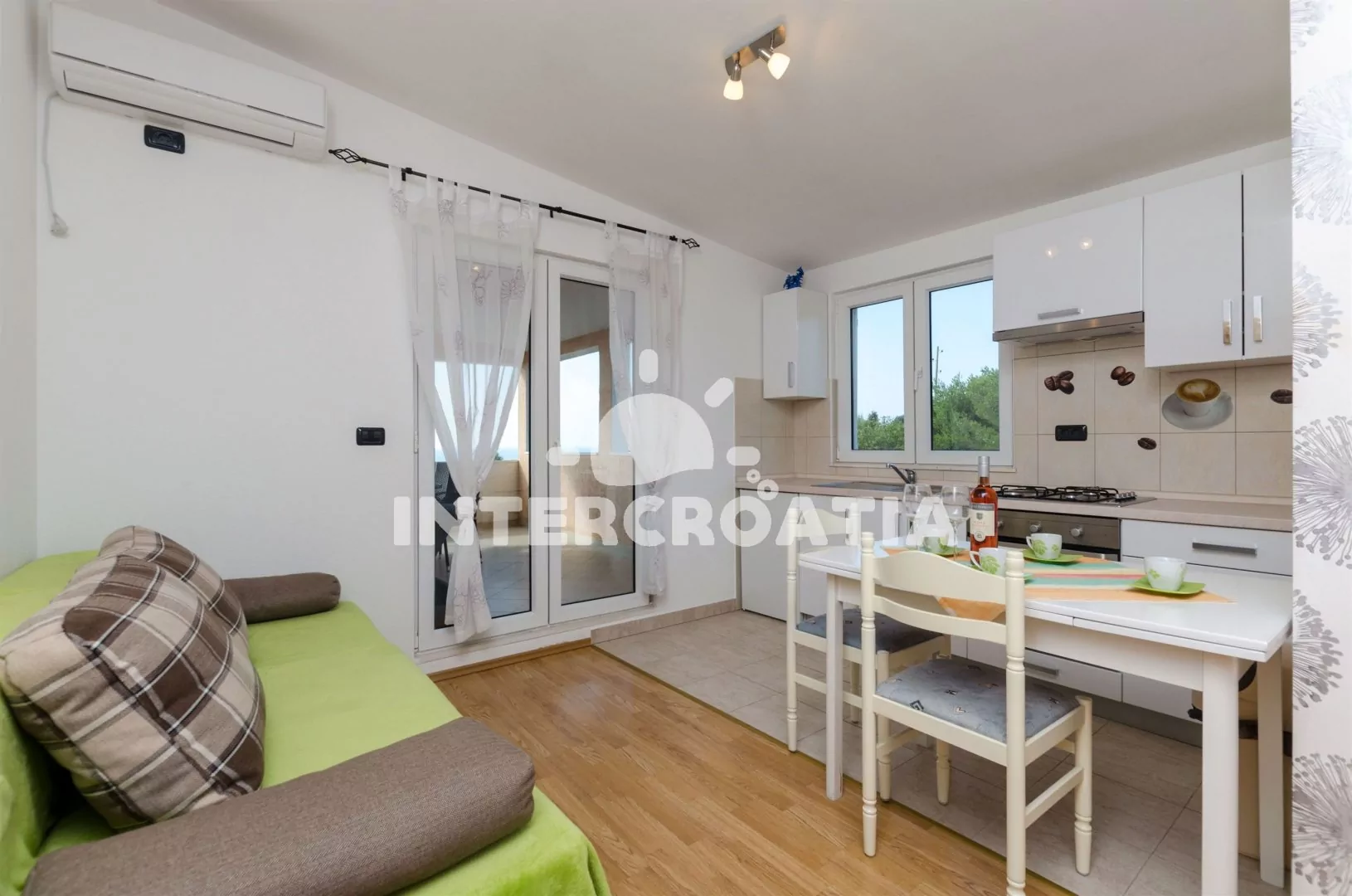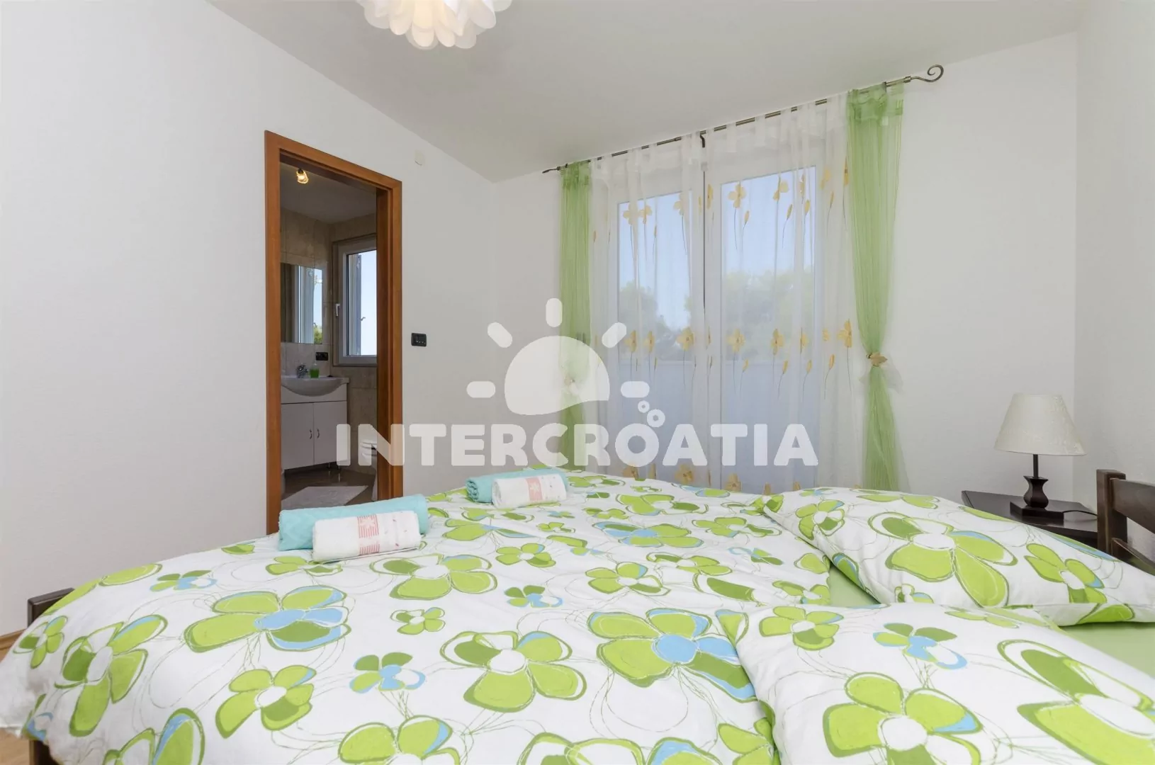 Apartmán s vlastní terasou a výhledem na moře se nachází v 1. patře vily a je vhodný pro 2 až 4 osoby. Obývací pokoj je spojený s kuchyní. Kuchyňská linka je vybavena varnou deskou, digestoří, troubou, rychlovarnou konvicí, mikrovlnnou troubou, kávovarem, toustovačem, nádobím a lednicí s mrazákem. Obývací pokoj s jídelním stolem, pohovkou (rozložitelná na extra lůžko pro 2 osoby), televizí se satelitním programem, radiem, klimatizací a vstupem na terasu. Ložnice s jedním dvoulůžkem. Koupelna se sprchovým koutem, umyvadlem, fénem, pračkou a wc. Hostům je k dispozici parkování u objektu zdarma.