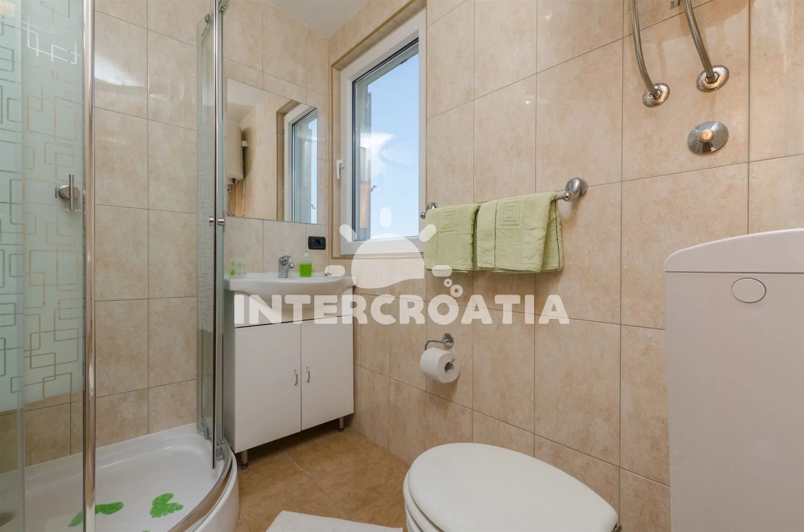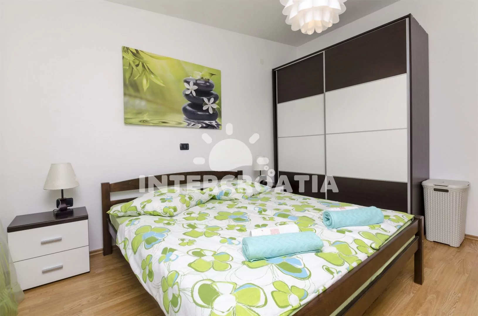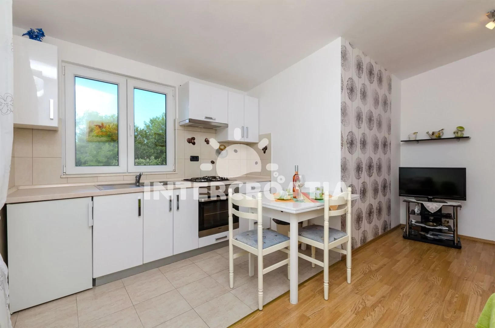 Apartmán s vlastní terasou a výhledem na moře se nachází v 1. patře vily a je vhodný pro 2 až 4 osoby. Obývací pokoj je spojený s kuchyní. Kuchyňská linka je vybavena varnou deskou, digestoří, troubou, rychlovarnou konvicí, mikrovlnnou troubou, kávovarem, toustovačem, nádobím a lednicí s mrazákem. Obývací pokoj s jídelním stolem, pohovkou (rozložitelná na extra lůžko pro 2 osoby), televizí se satelitním programem, radiem, klimatizací a vstupem na terasu. Ložnice s jedním dvoulůžkem. Koupelna se sprchovým koutem, umyvadlem, fénem, pračkou a wc. Hostům je k dispozici parkování u objektu zdarma.